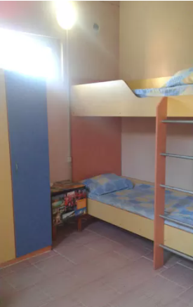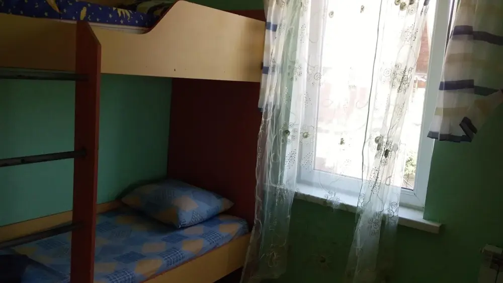 Комната для многодетных семей во дворе, из двух зон отдыха, через арку. Кровать широкая 1,8 м х 2 м и 2 кровати 2-этажные на 4 детских места, детская кроватка до года. Телевизор, холодильник, шкаф, зеркало, тумбочки. При комнатах двор-столовая, со столом и лавками.