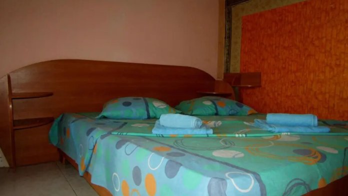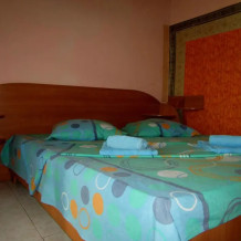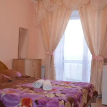 Номер из двух отдельных комнат с общим санузлом и общим балконом с видом на море. Одна комната: кровати 1,60 м х 1,90 м и кровать 0,80 м х 1,90 м, шкаф, тумбочки, настольная, лампа, зеркало, прикроватные коврики. Комната вторая: 2 кровати 0,80 м х 1,90 м, шкаф, тумбочки, настольная, лампа, зеркало, прикроватные коврики. 5-местный, потому, что в одной комнате 3 места и во второй 2 места спальных. Этот номер с кондиционером, холодильником и двумя телевизорами в каждой комнате.