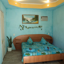 Комната напротив бассейна, с внутренним двориком-столовой под навесом. Комната разделена на 2 зоны. Кровать 1,6 м х 1,9. За стенкой спальное место для троих детей, внизу широкое 1,4 м х 1,7 м, вверху для одного ребёнка. Холодильник, телевизор, кондиционер, шкаф, тумбочки, санузел с душевой кабинкой. Дворик с лавочкой, столом и стульями. Кухня в 5 метрах от входа.