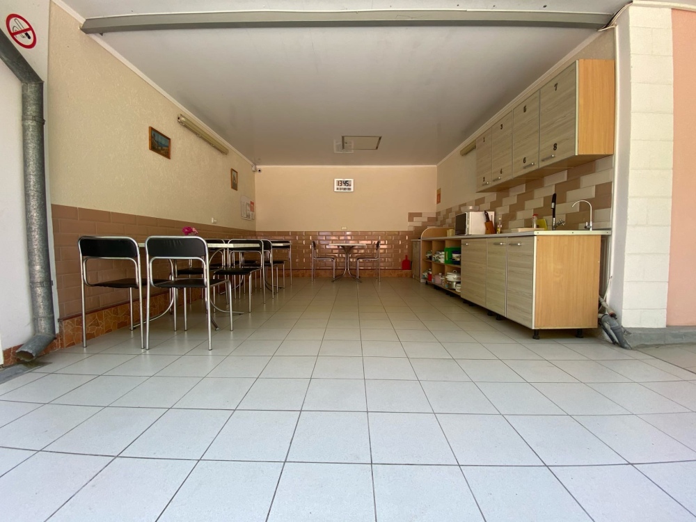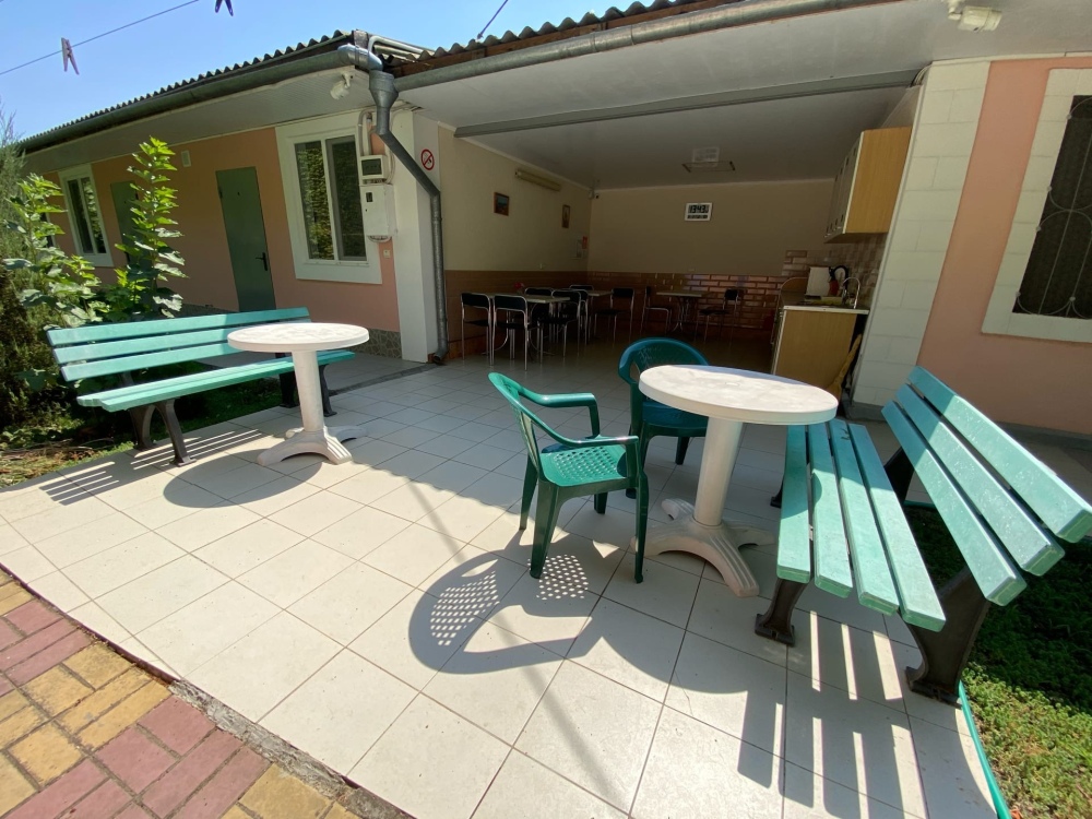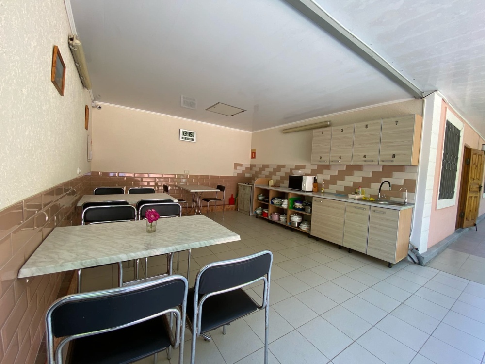 На территории имеются места для отдыха: садовые скамейки, мангал с решетками и шампурами, кухня-столовая для самостоятельного питания. На кухне есть электрическая плита, микроволновая печь, электрочайник, необходимая посуда, индивидуальные шкафчики, питьевая вода, очищенная установкой «Обратного осмоса». Есть место для глажки одежды, предоставляется платная услуга по стирке личных вещей.