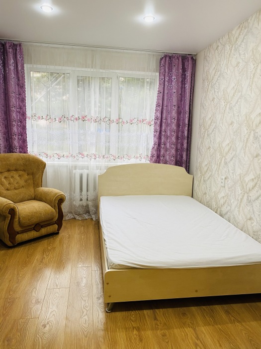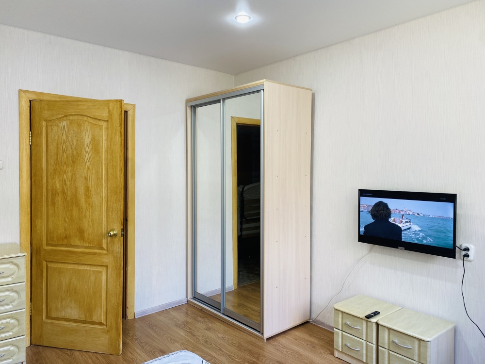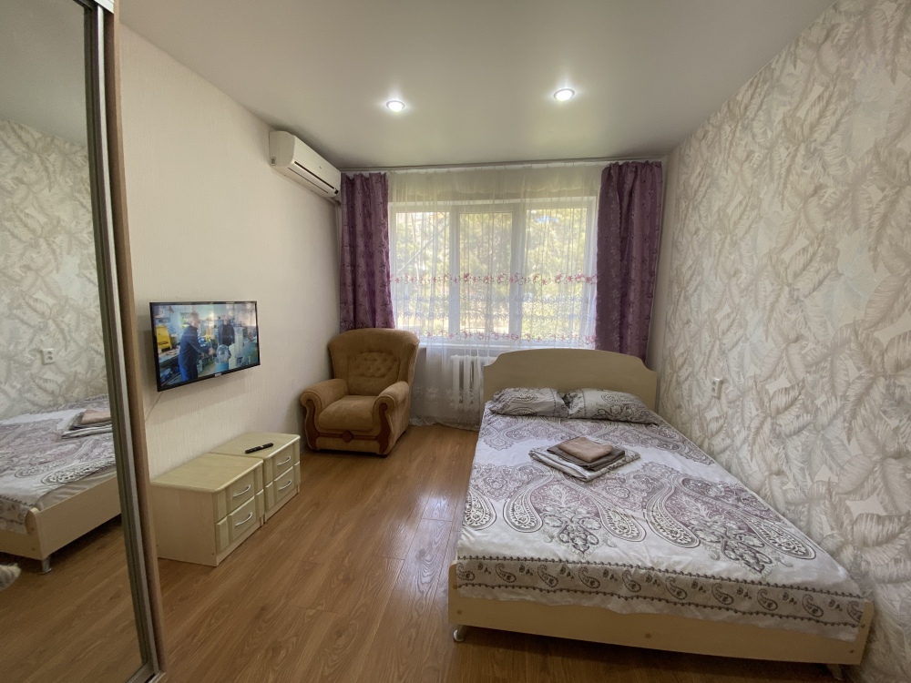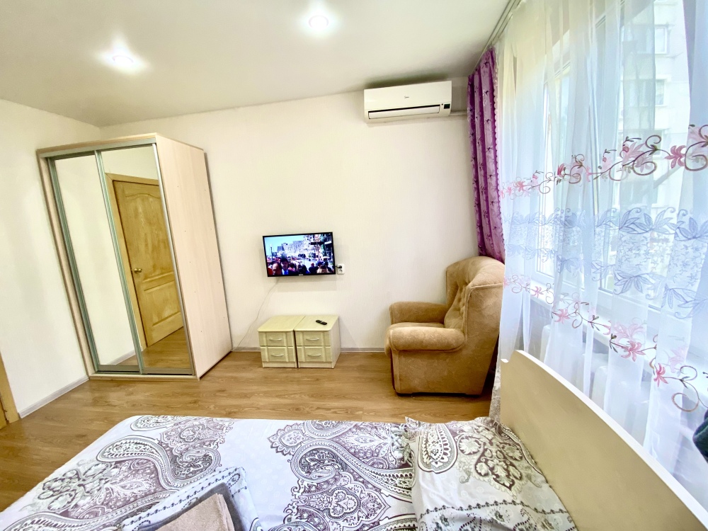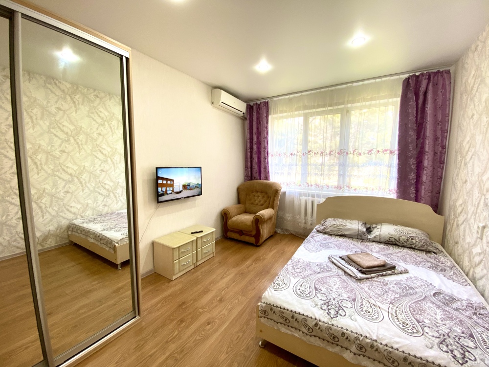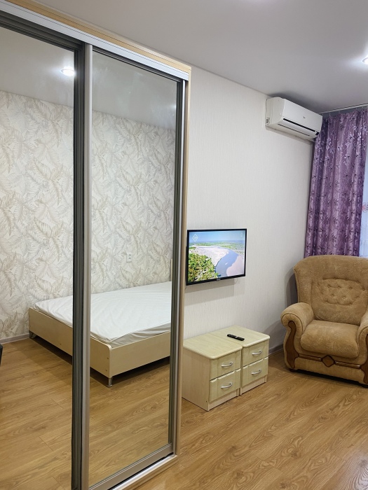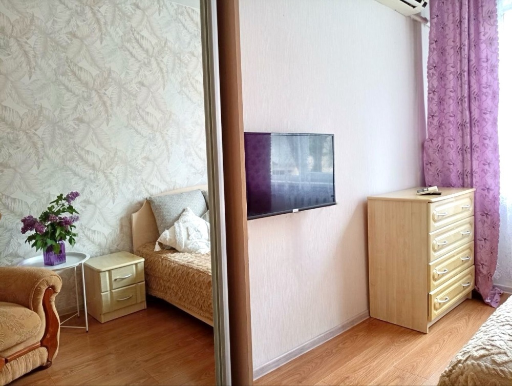 Квартира полуторка: oдна комната отдельная с двуспальной кроватью, а вторая- объединена с кухней и в ней стоит раскладной диван, можно положить спать детей.