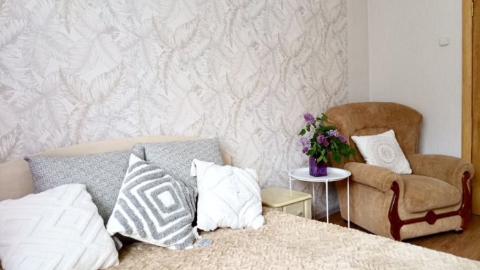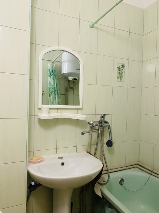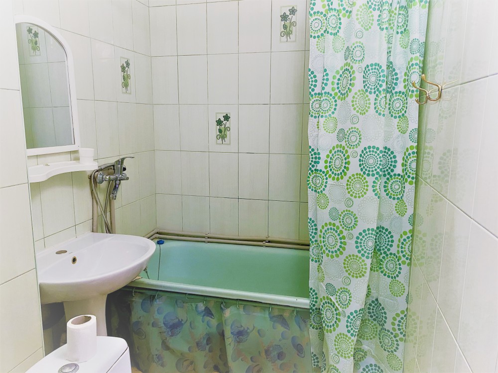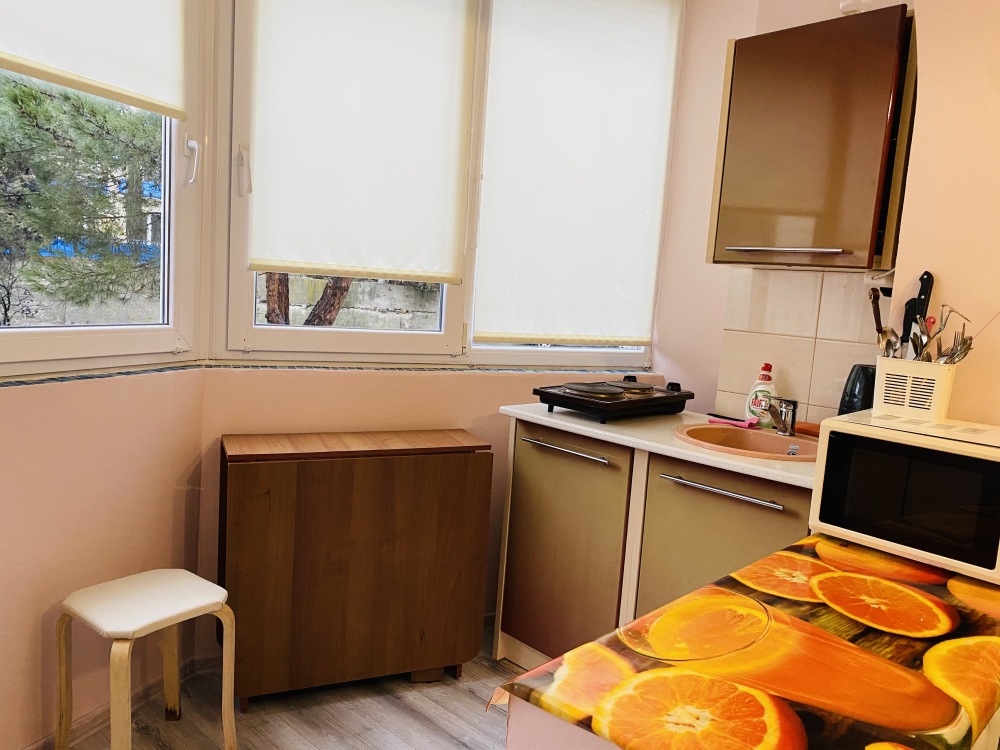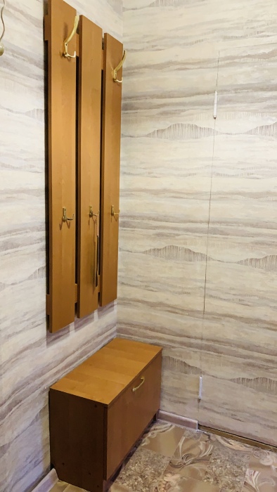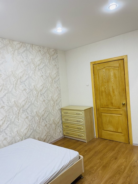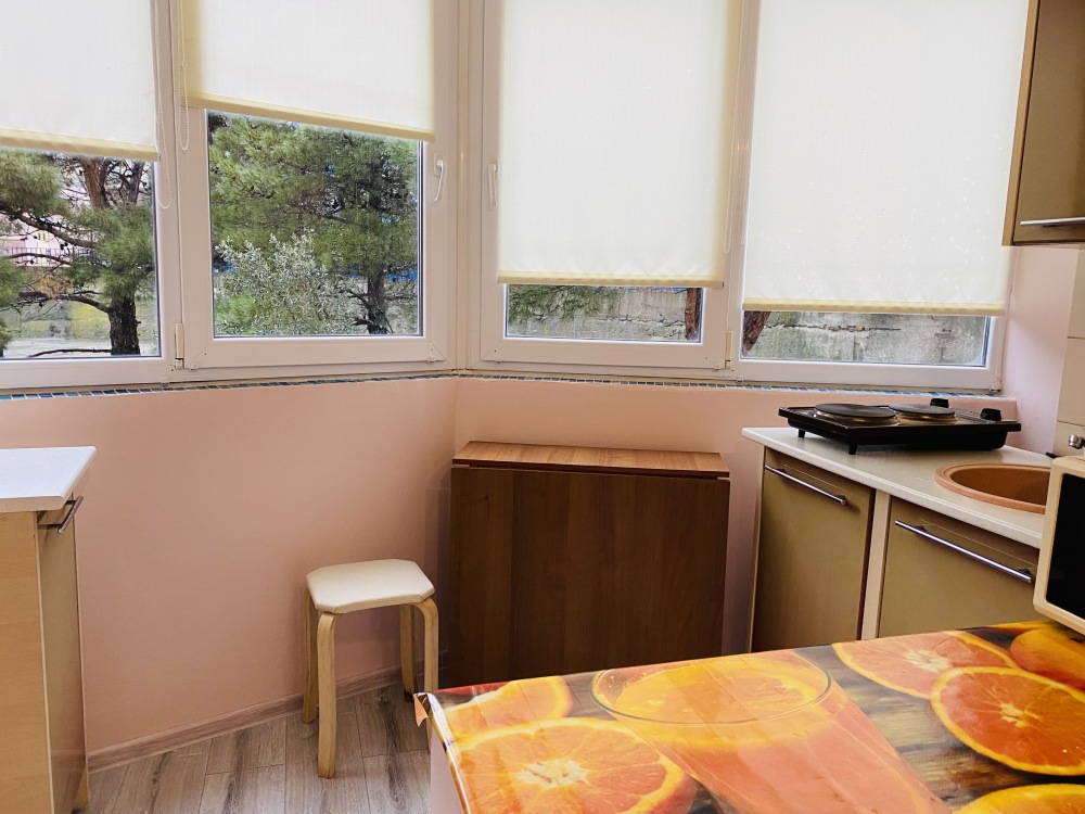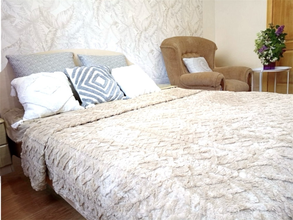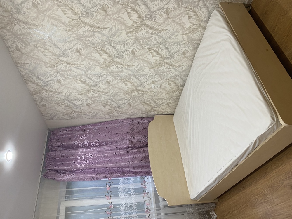Квартира полуторка: oдна комната отдельная с двуспальной кроватью, а вторая- объединена с кухней и в ней стоит раскладной диван, можно положить спать детей.