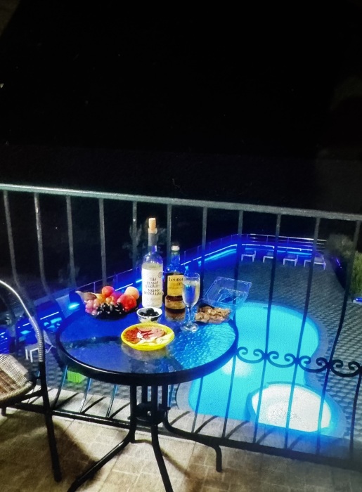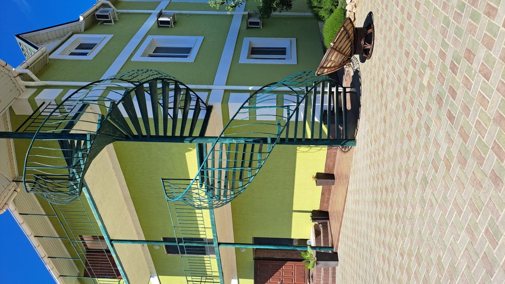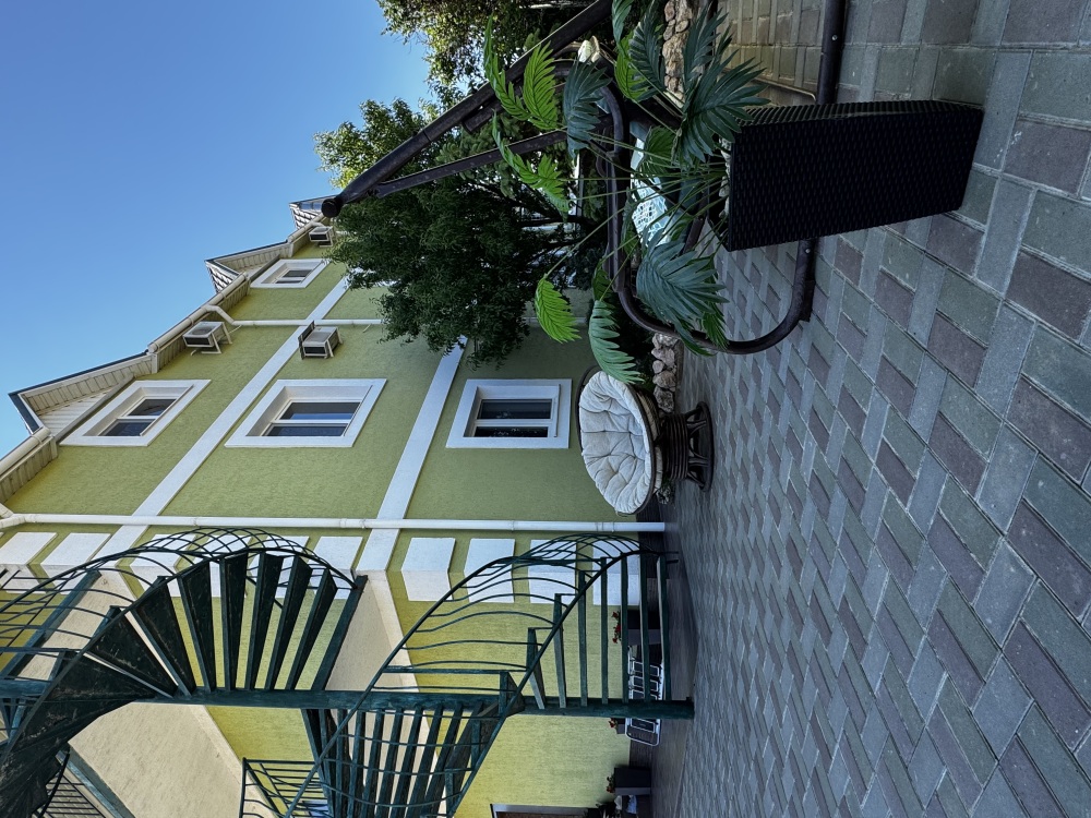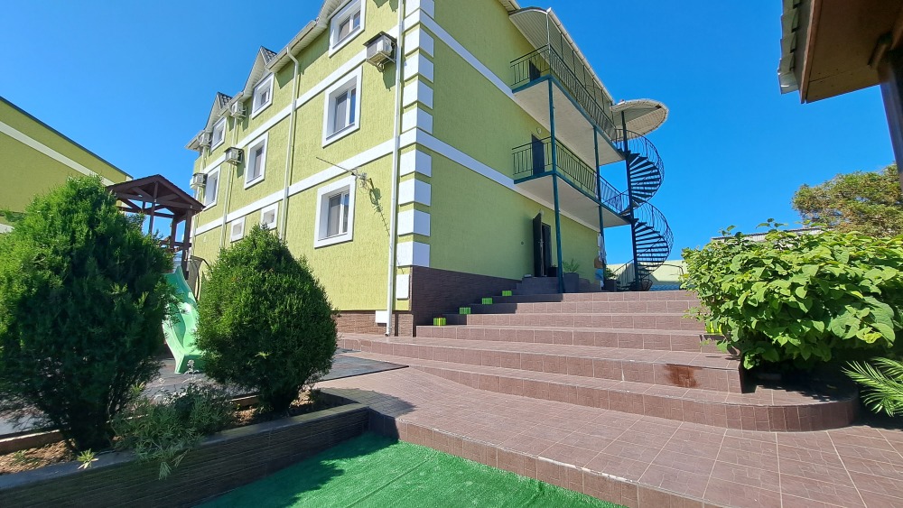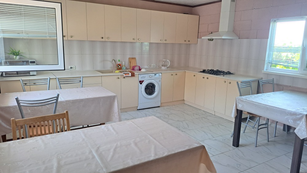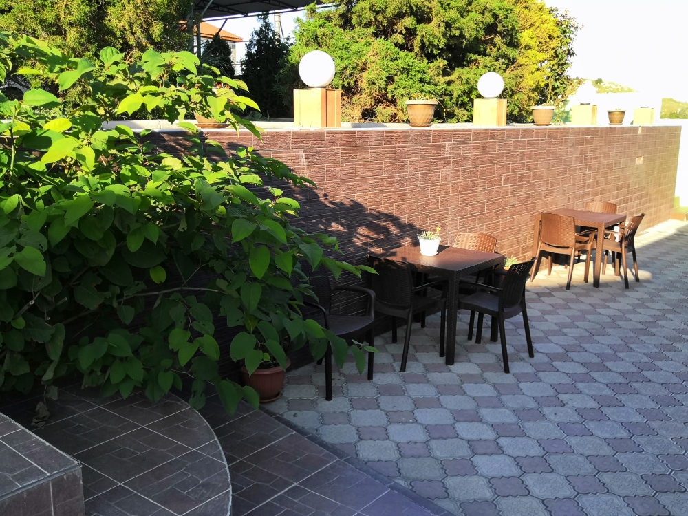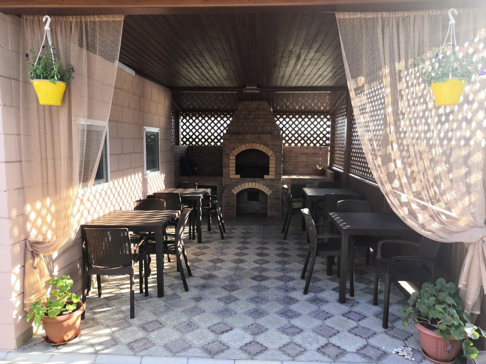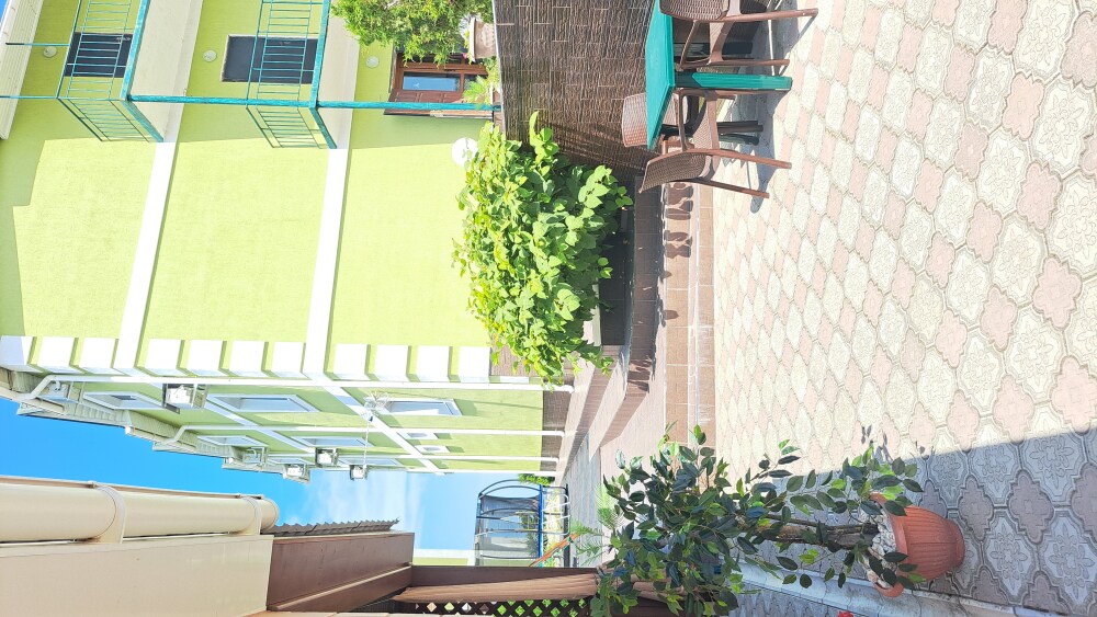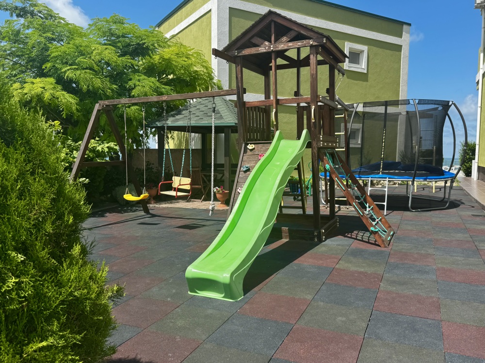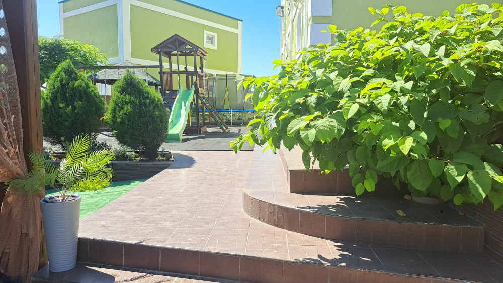На территории есть крытая площадка для авто,большой озелененный двор,оборудованная всем необходимым кухня для самостоятельного приготовления,зона барбекю,беседка,детская площадка,беседка для детей, бассейн, площадка для отдыха с шезлонгами. Вся территория находится под видео наблюдением.