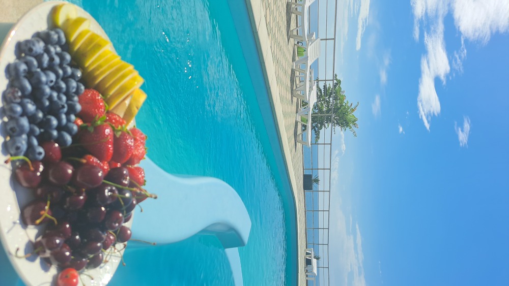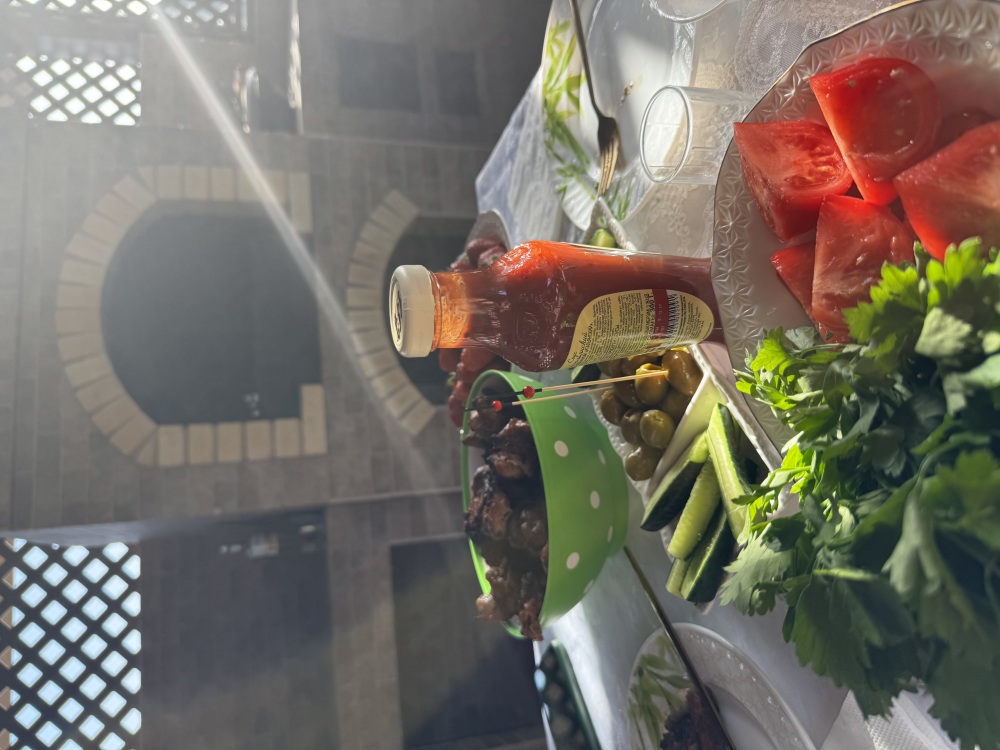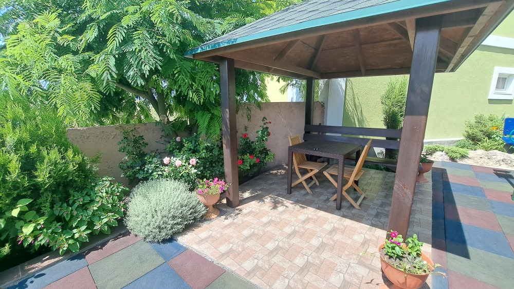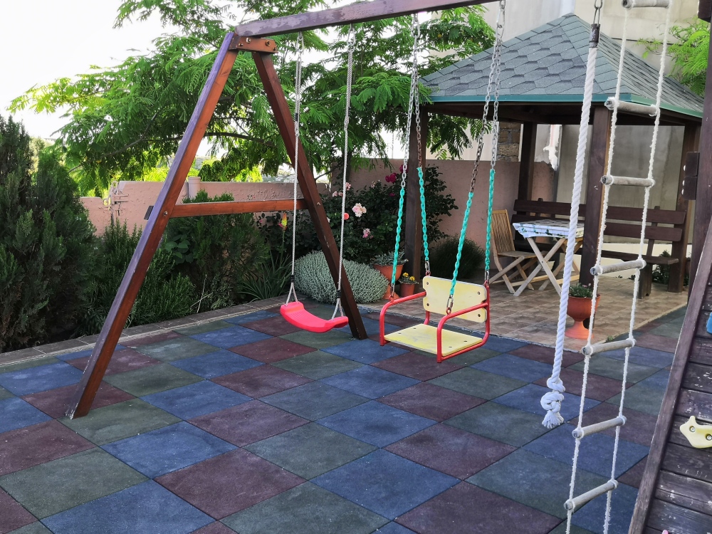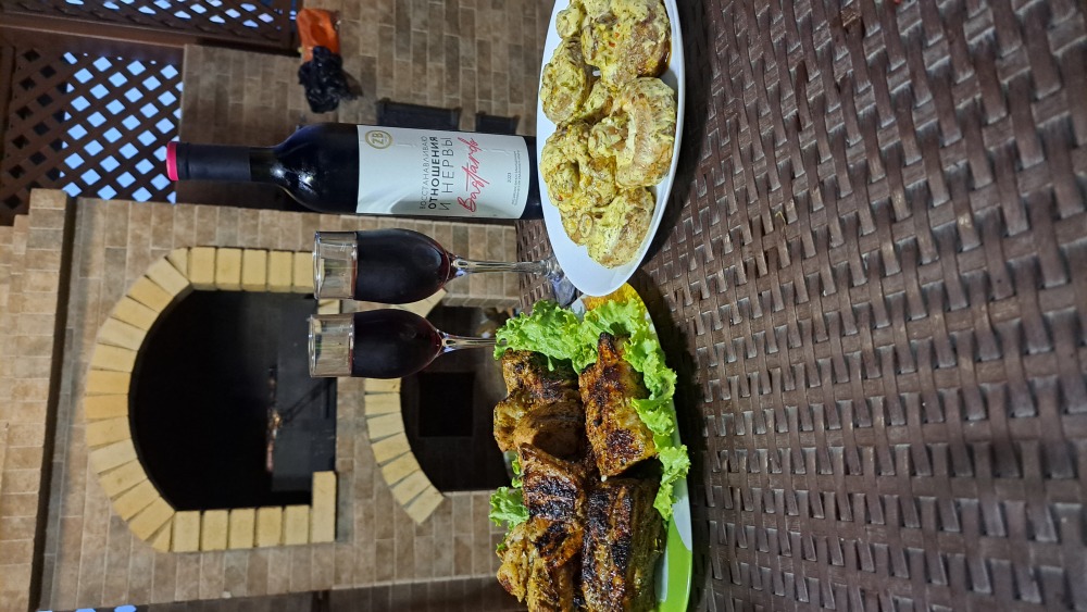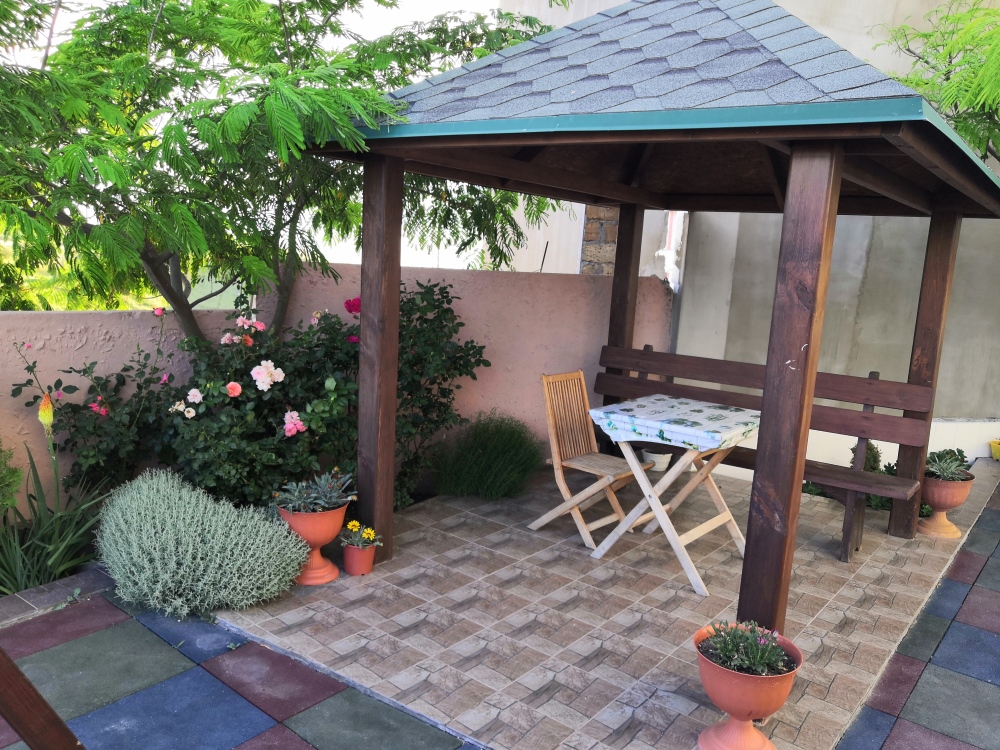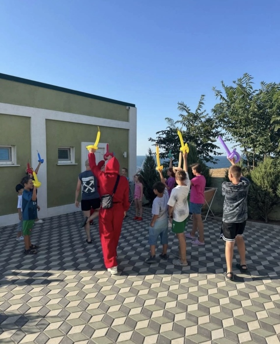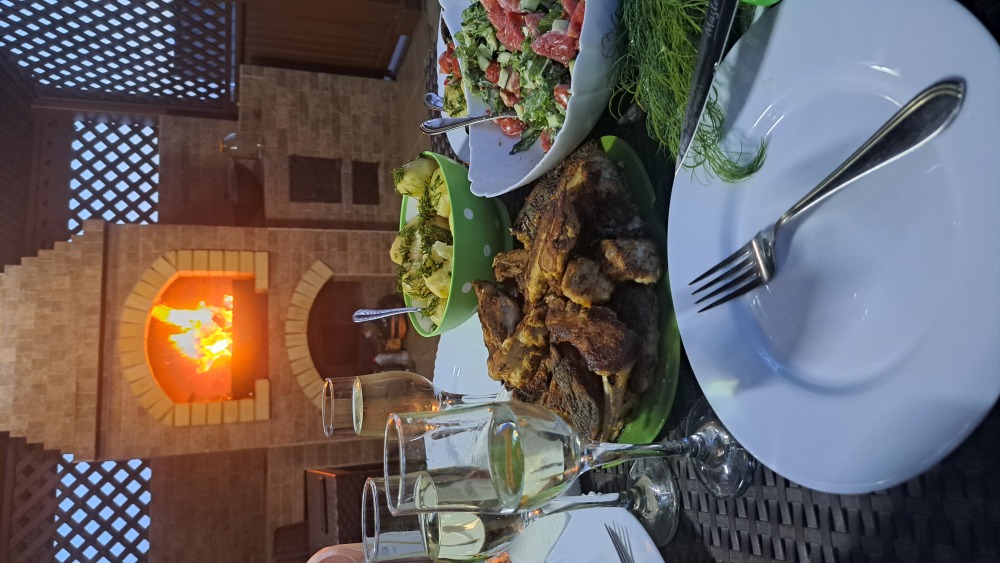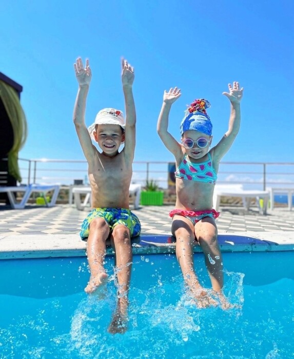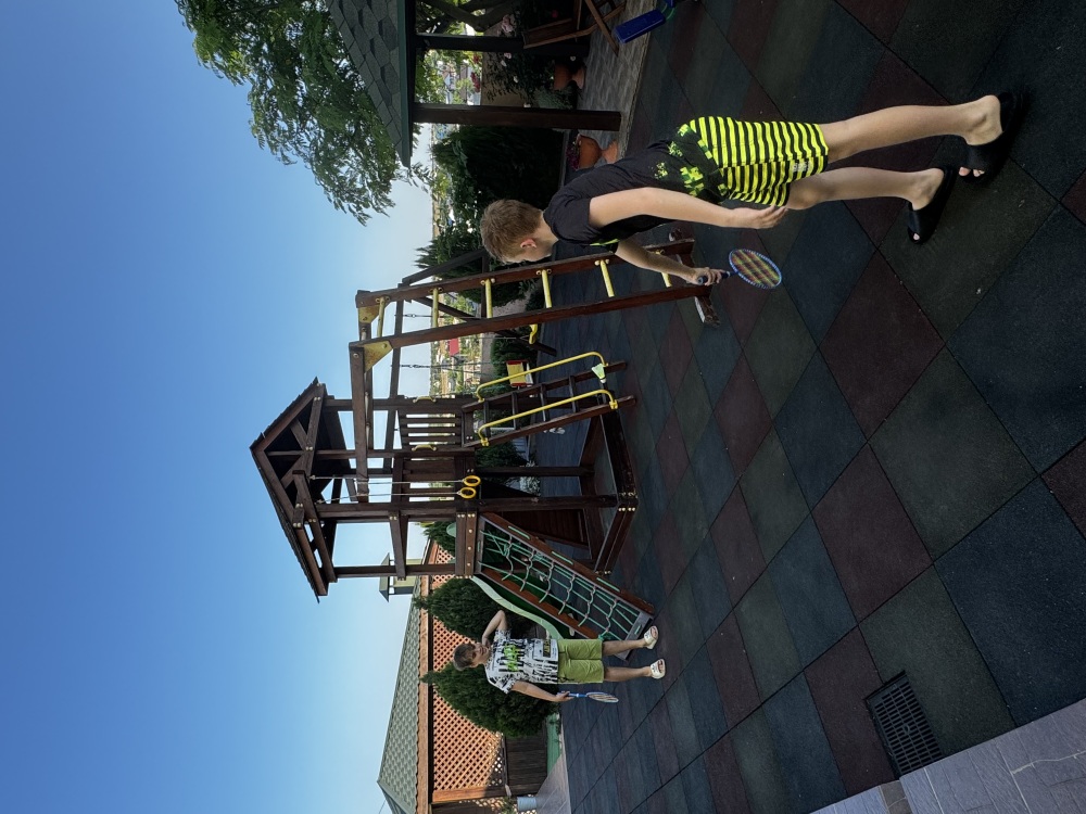На территории есть крытая площадка для авто,большой озелененный двор,оборудованная всем необходимым кухня для самостоятельного приготовления,зона барбекю,беседка,детская площадка,беседка для детей, бассейн, площадка для отдыха с шезлонгами. Вся территория находится под видео наблюдением.