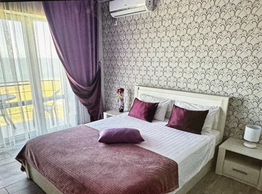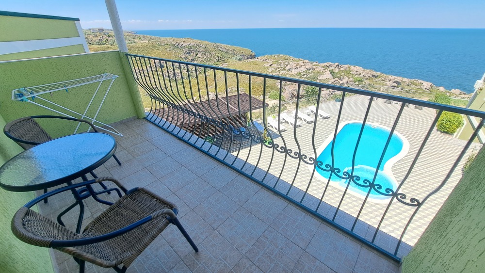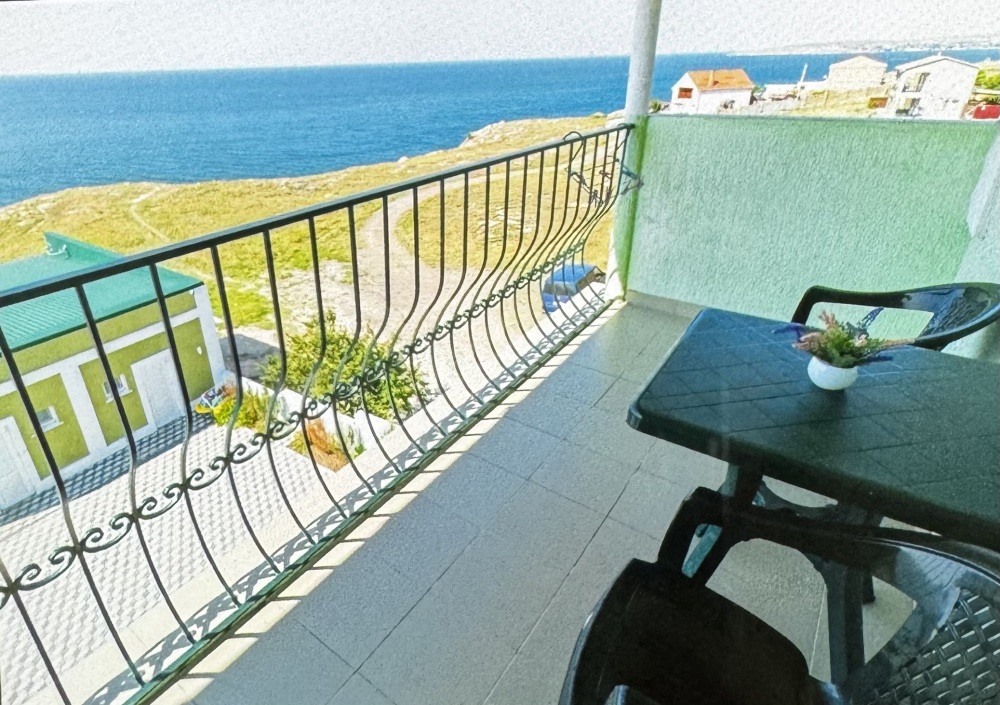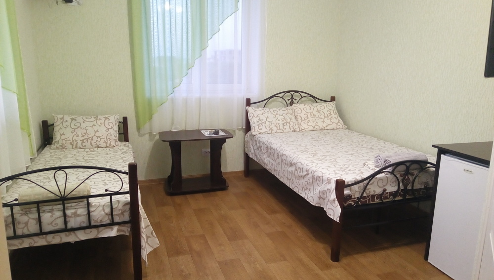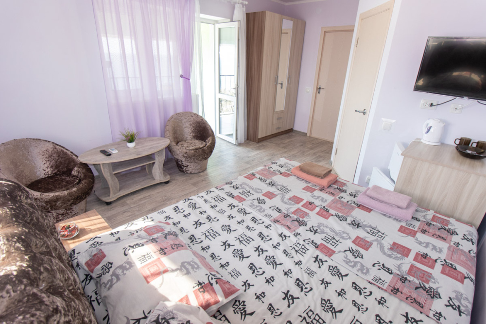 Трёхместный номер вместимостью до трёх человек,в номере полуторная кровать и одна односпальная,шкаф, журнальный столик, холодильник, кондиционер, телевизор, санузел.Номер с балконом, открывается прекрасный вид на море,скалы,сидя за столиком можно проводить красивейшие закаты.