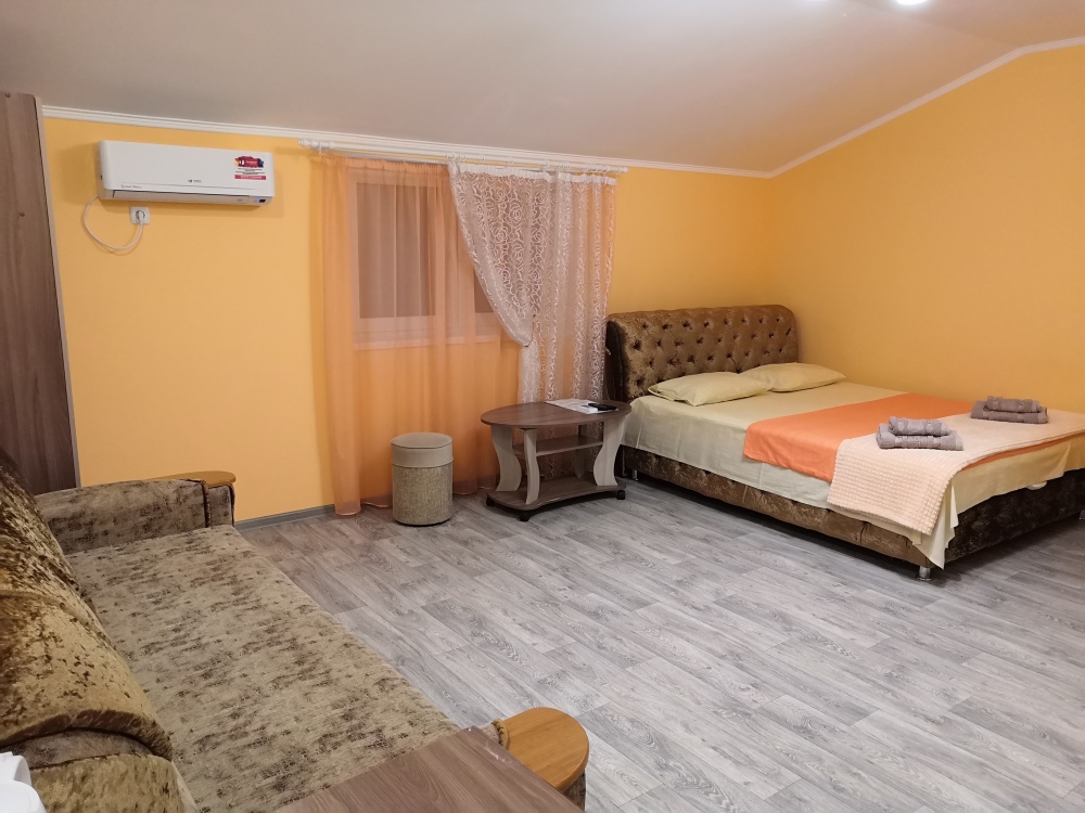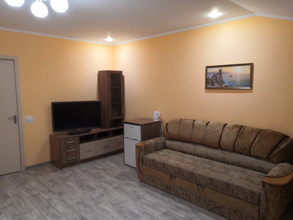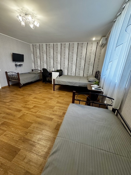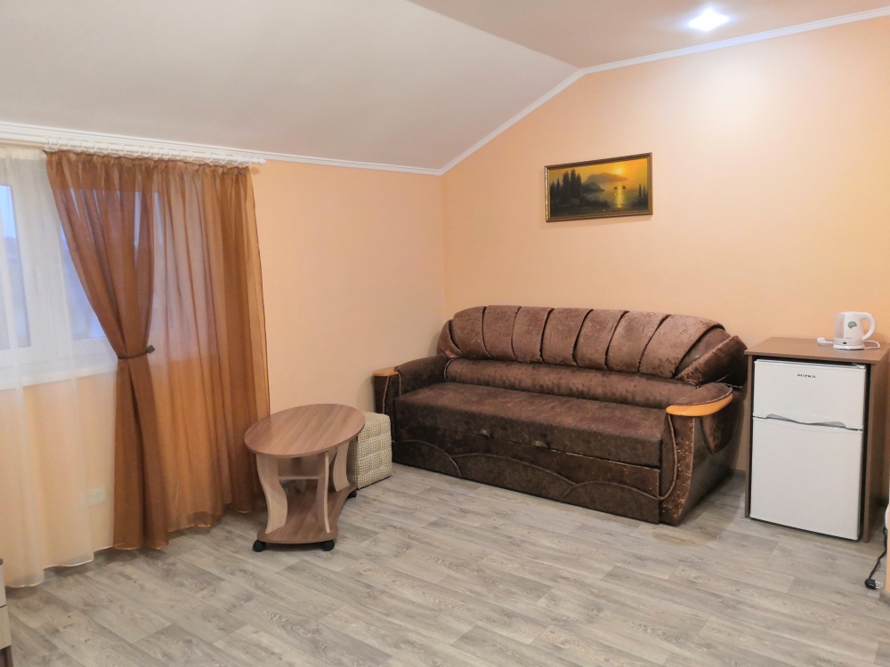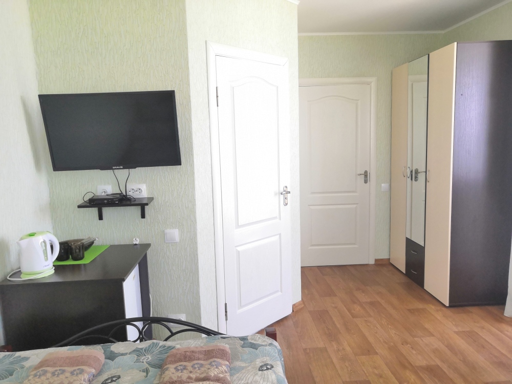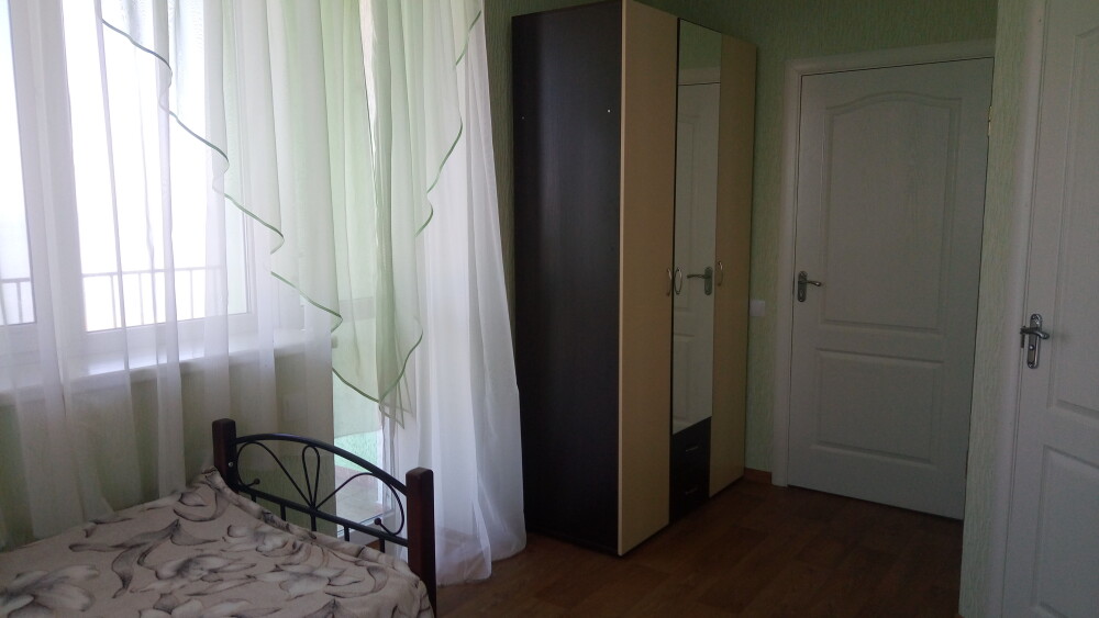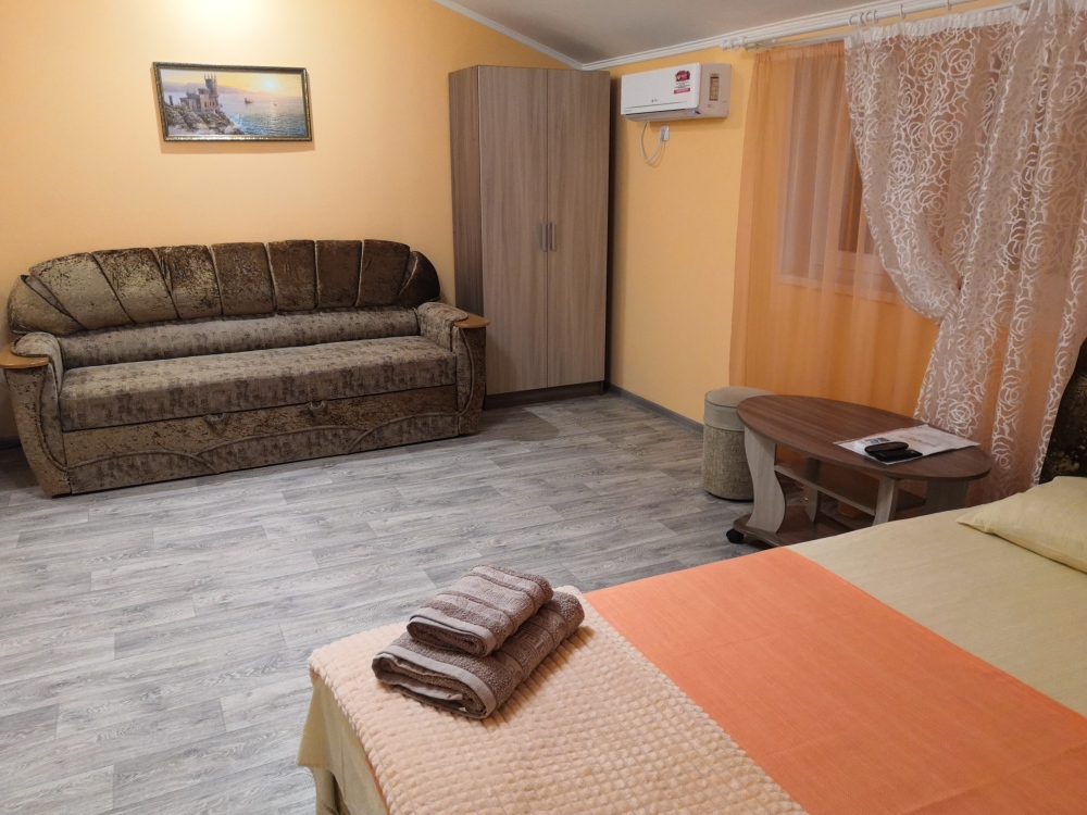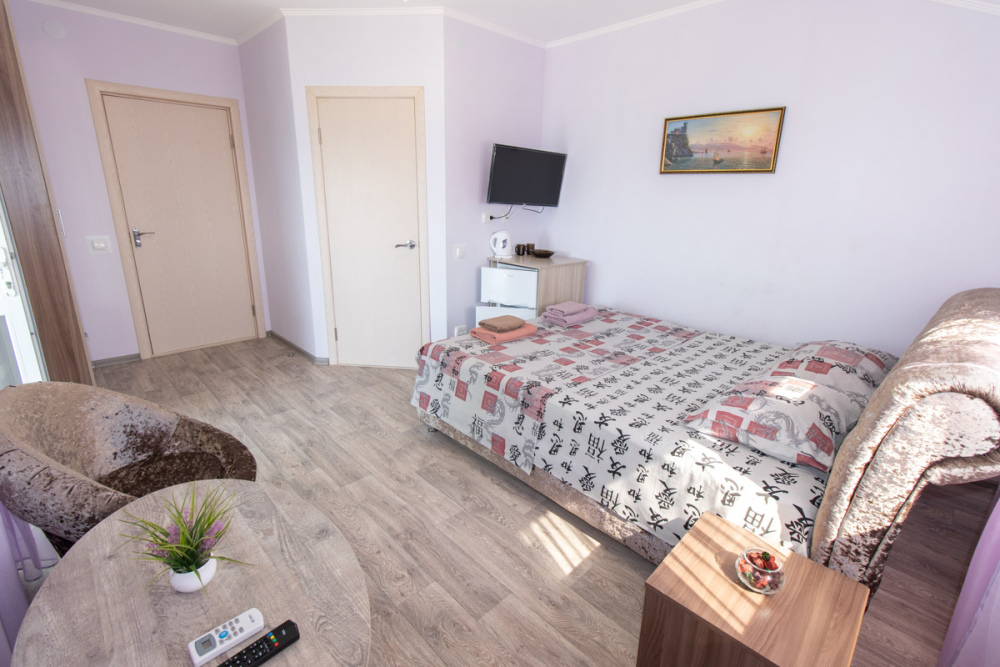 Трёхместный номер расположен на третьем этаже.В номере одна двуспальная кровать, раскладной диванчик,шкаф, журнальный столик, мебельная стенка, холодильник ,кондиционер ,телевизор, санузел.Балкон общий,вид на море и во двор