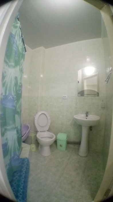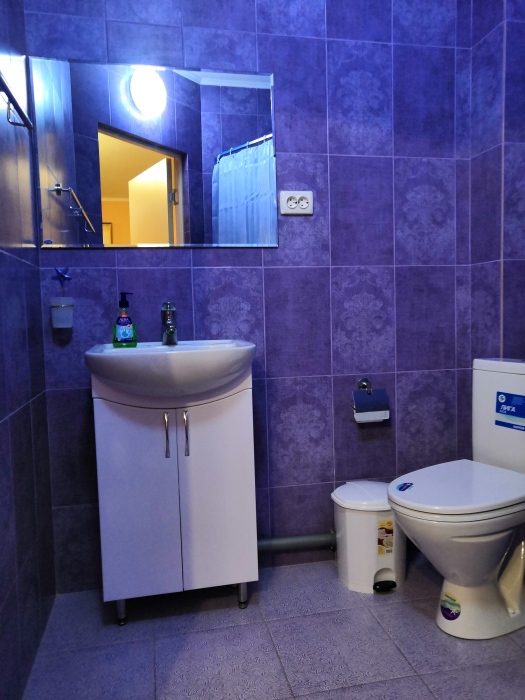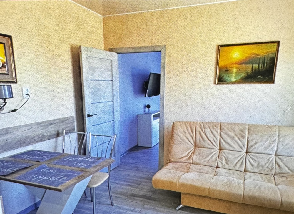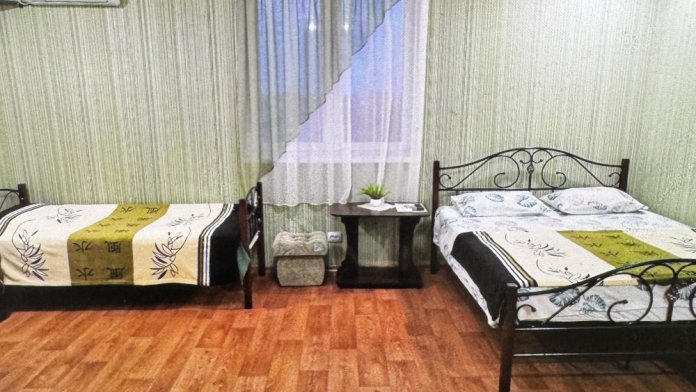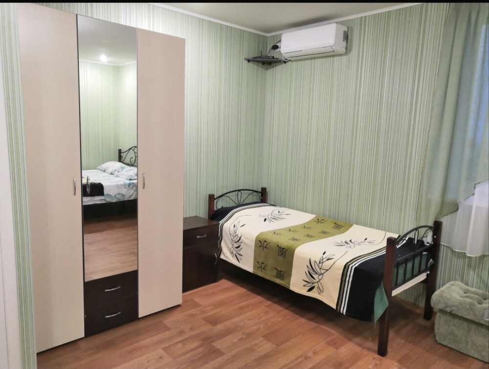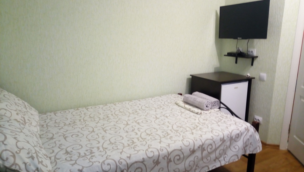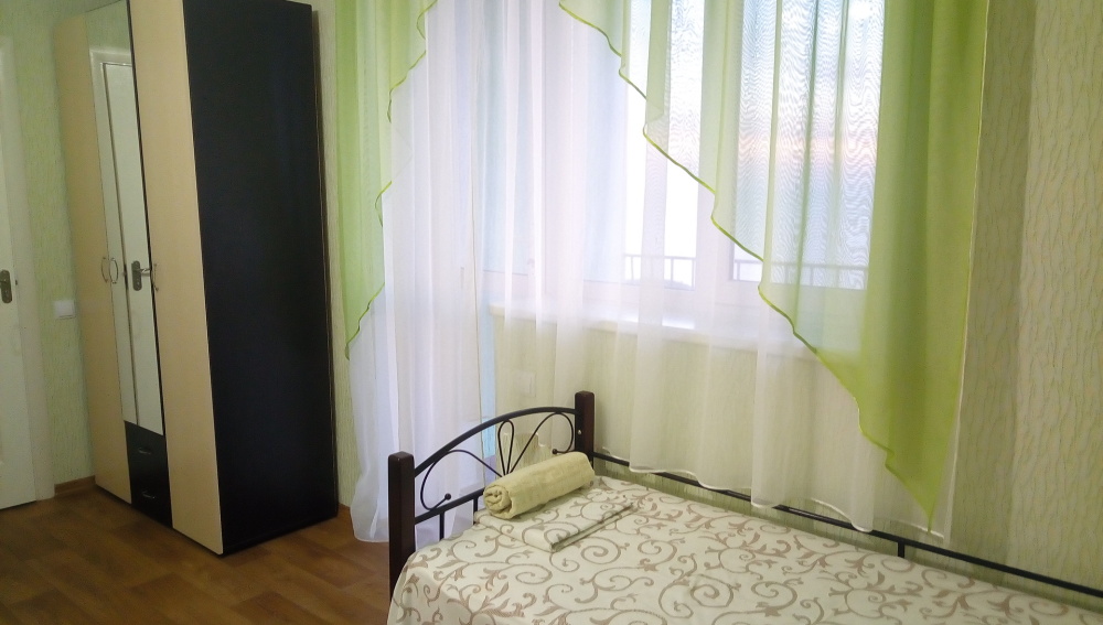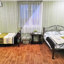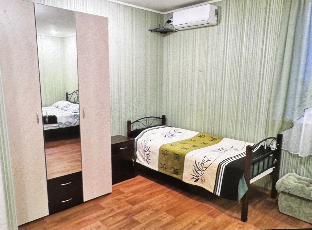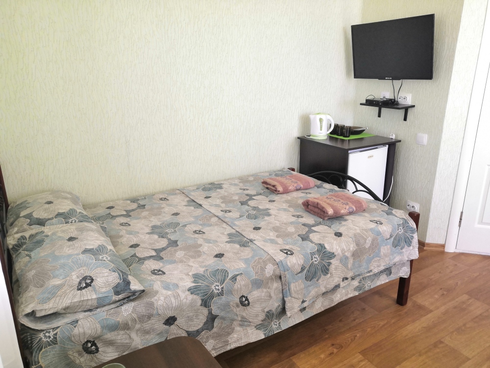 Трёхместный номер расположен на третьем этаже.В номере одна двуспальная кровать, раскладной диванчик,шкаф, журнальный столик, мебельная стенка, холодильник ,кондиционер ,телевизор, санузел.Балкон общий,вид на море и во двор