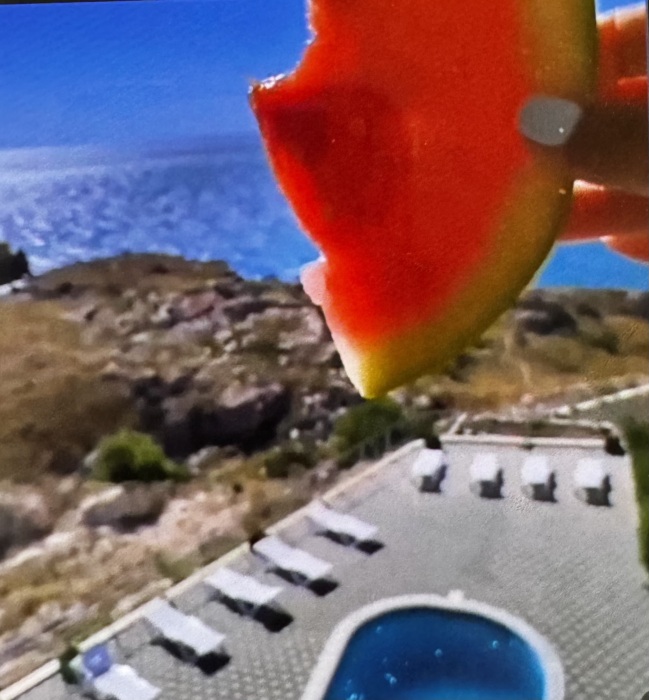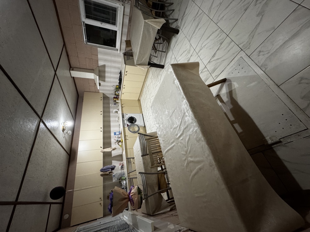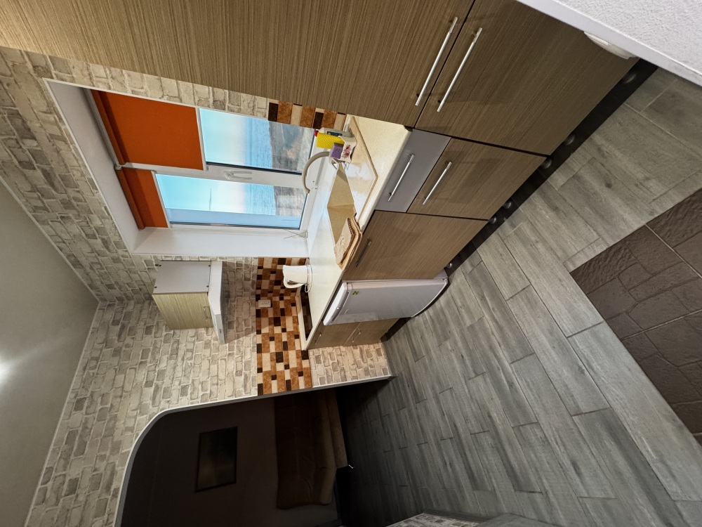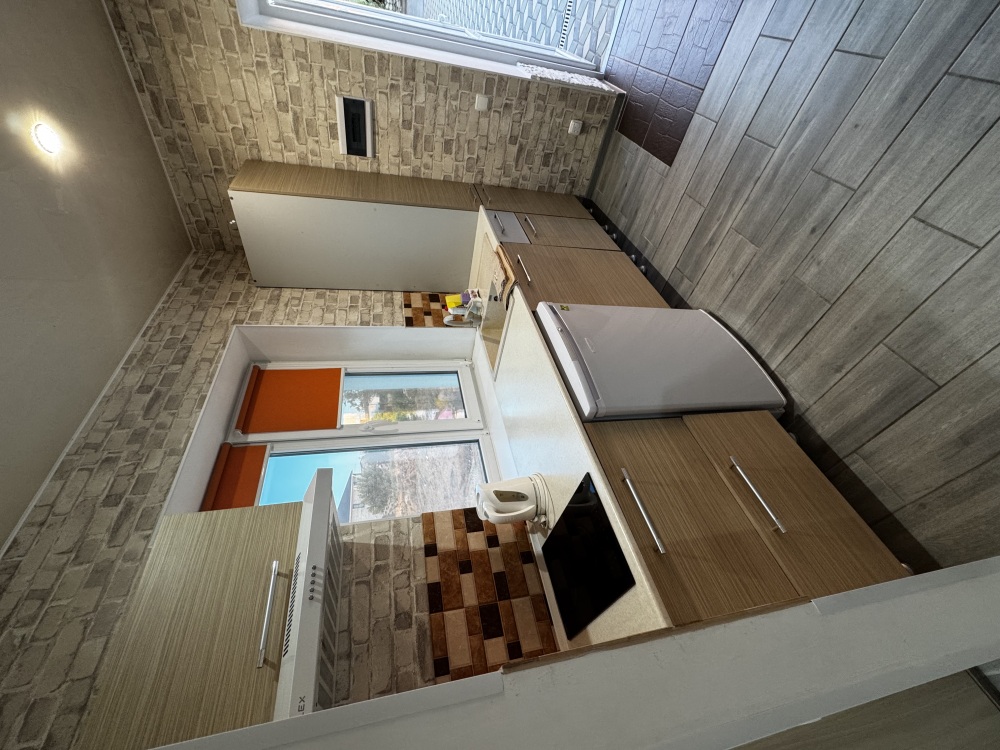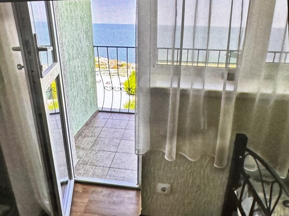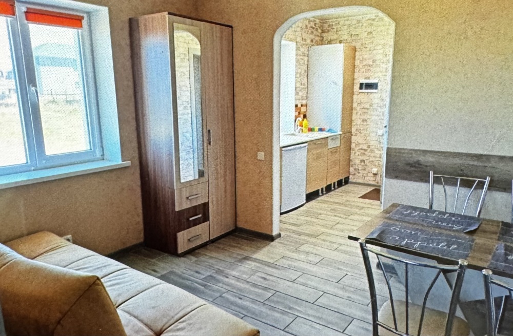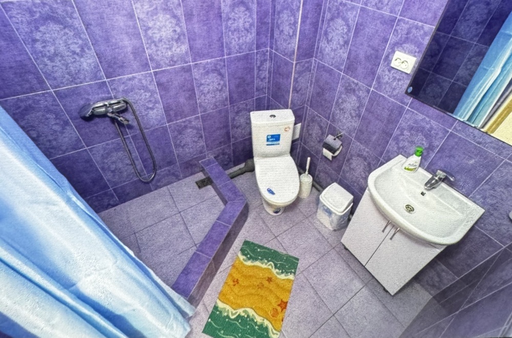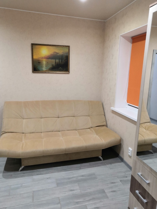 Трёхместный номер расположен на третьем этаже.В номере одна двуспальная кровать, раскладной диванчик,шкаф, журнальный столик, мебельная стенка, холодильник ,кондиционер ,телевизор, санузел.Балкон общий,вид на море и во двор