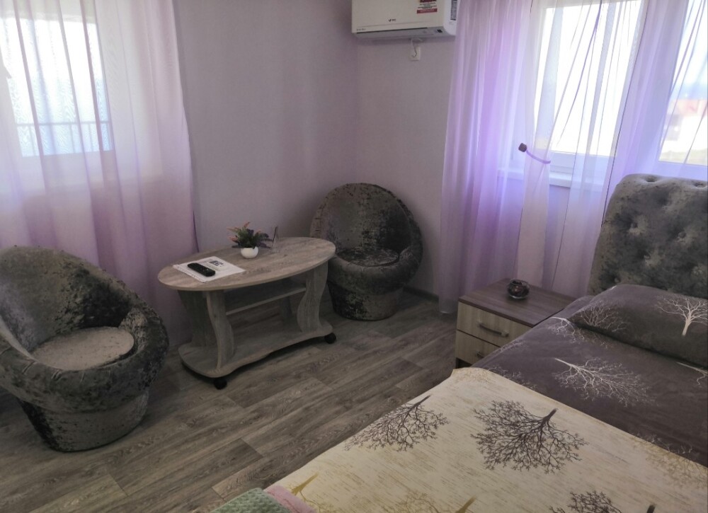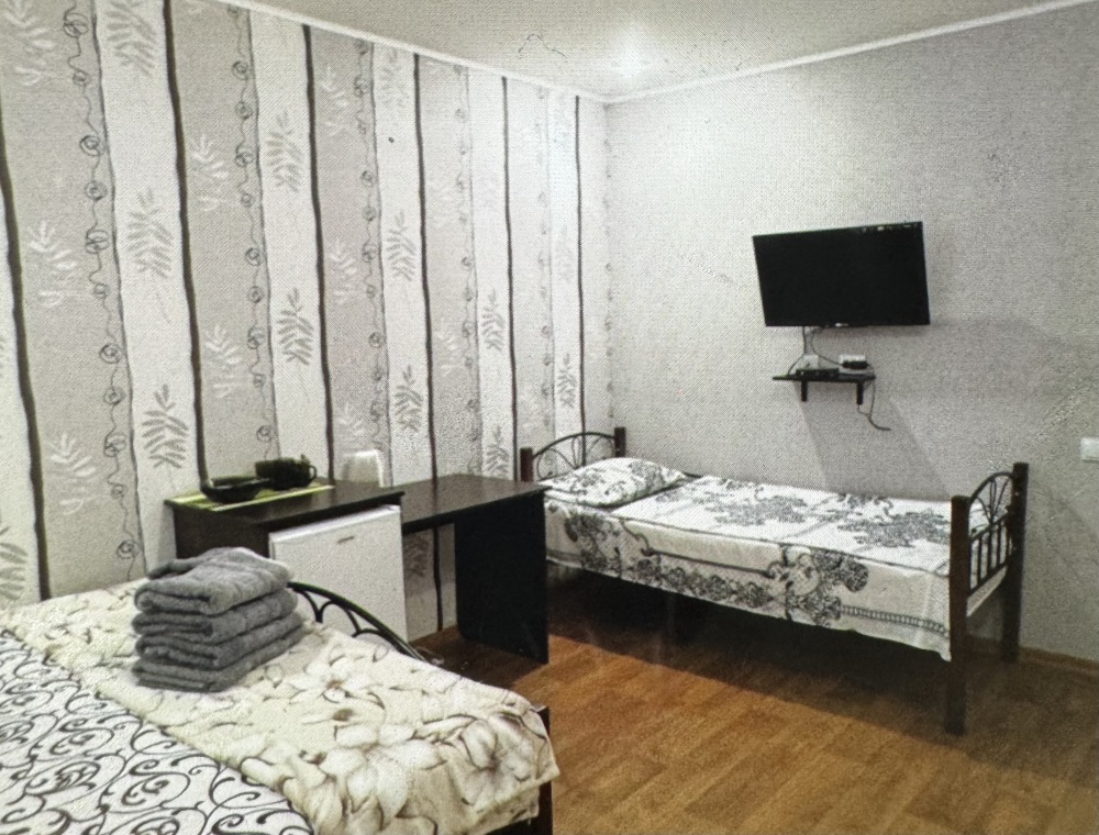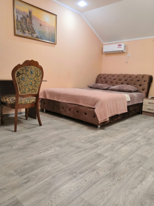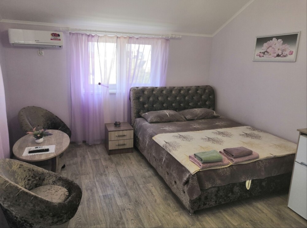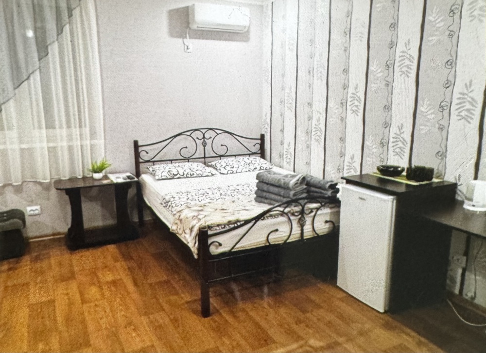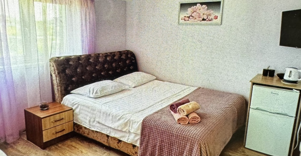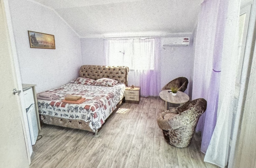 Двухместный номер расположен на третьем этаже,в номере двуспальная кровать с ортопедическим матрасом,два кресла банкетки, журнальный столик,прикроватная тумбочка,шкаф, холодильник, чайник, минимальный набор посуды, телевизор, кондиционер, санузел,балкон(стол, два стула, сушка для белья) .