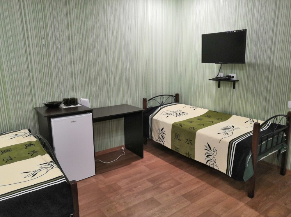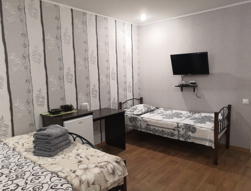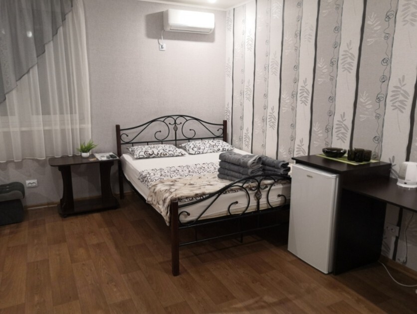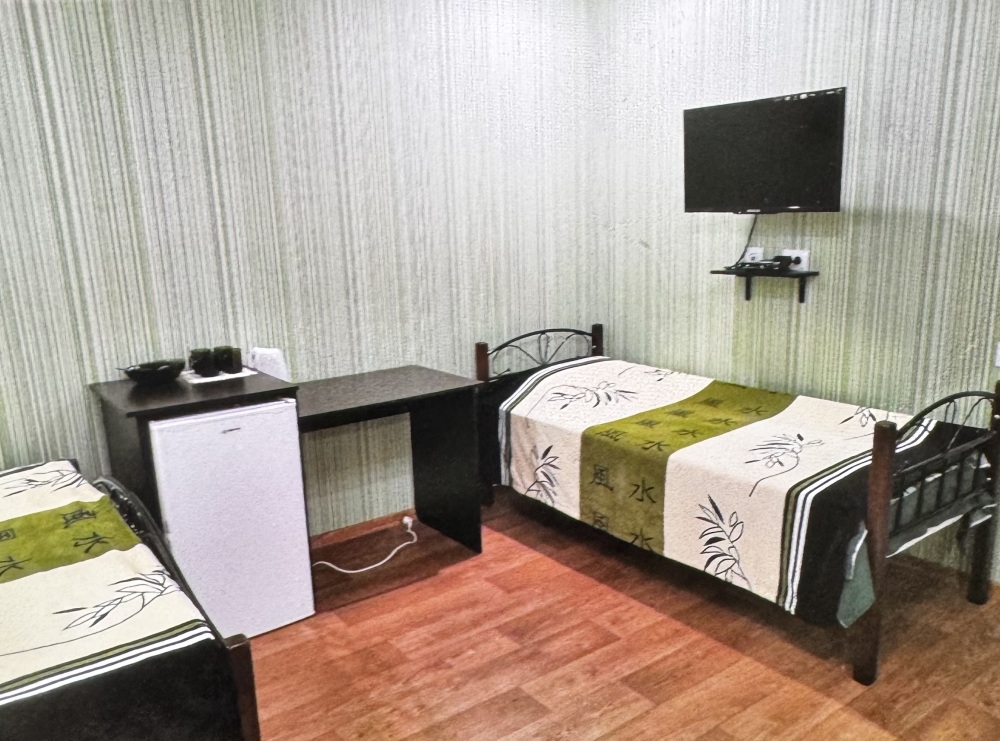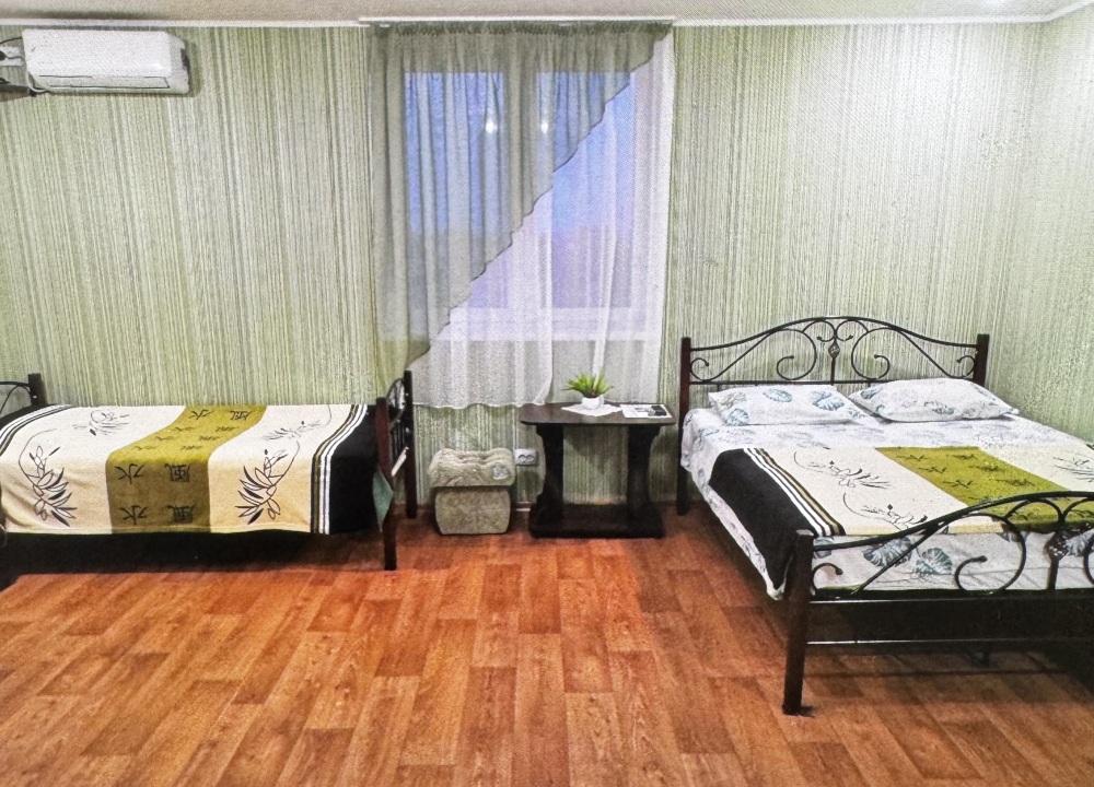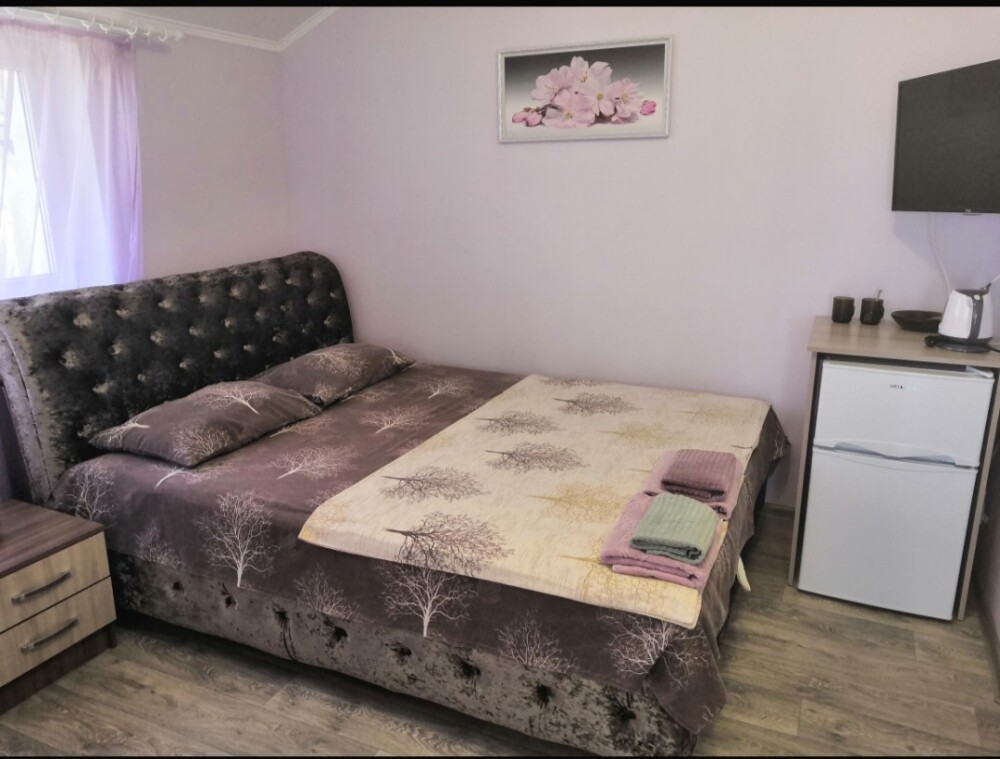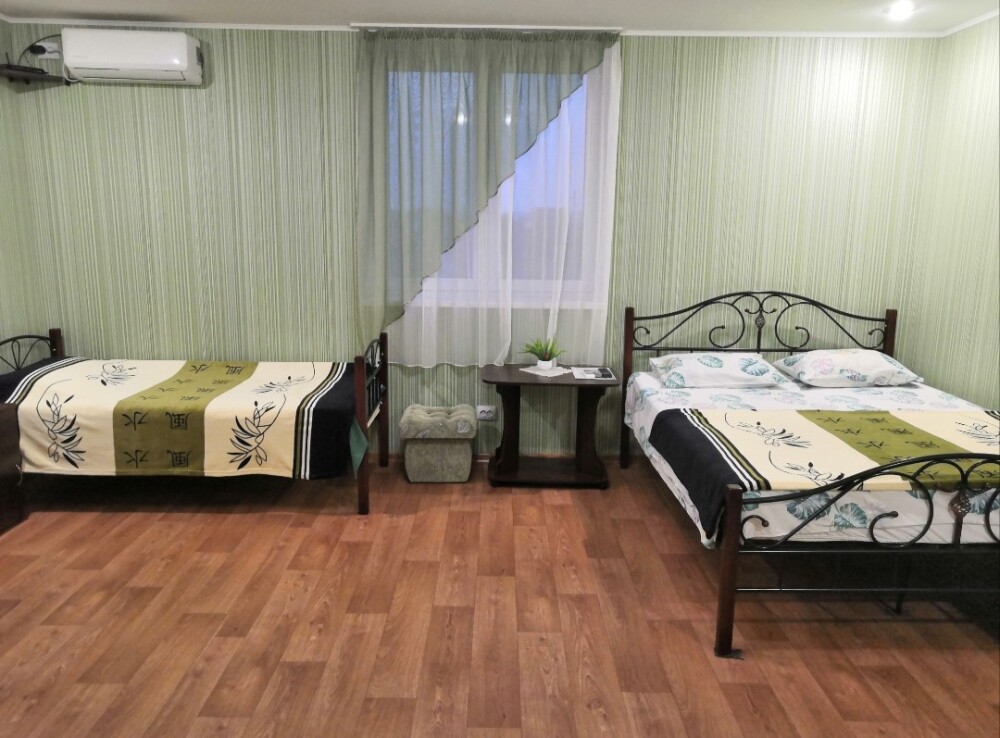 Двухместный номер расположен на третьем этаже,в номере двуспальная кровать с ортопедическим матрасом,два кресла банкетки, журнальный столик,прикроватная тумбочка,шкаф, холодильник, чайник, минимальный набор посуды, телевизор, кондиционер, санузел,балкон(стол, два стула, сушка для белья) .