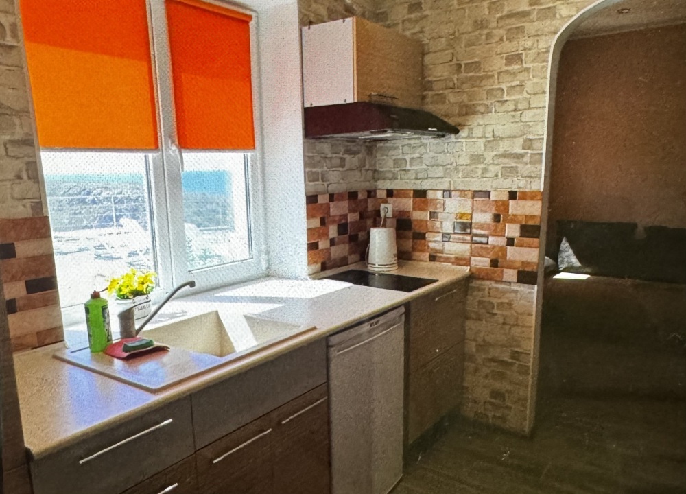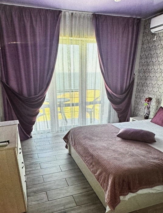 Номер расположен на первом этаже,состоит из трех комнат, санузел в номере,спальня 1 с балконом видом на море, спальня 2 совмещена с кухней. В номере двуспальная кровать, раскладной диван, рассчитан для двоих. Из техники :телевизор, холодильник, кондиционер, чайник,вытяжка,плита.Кузня оснащена необходимой посудой.