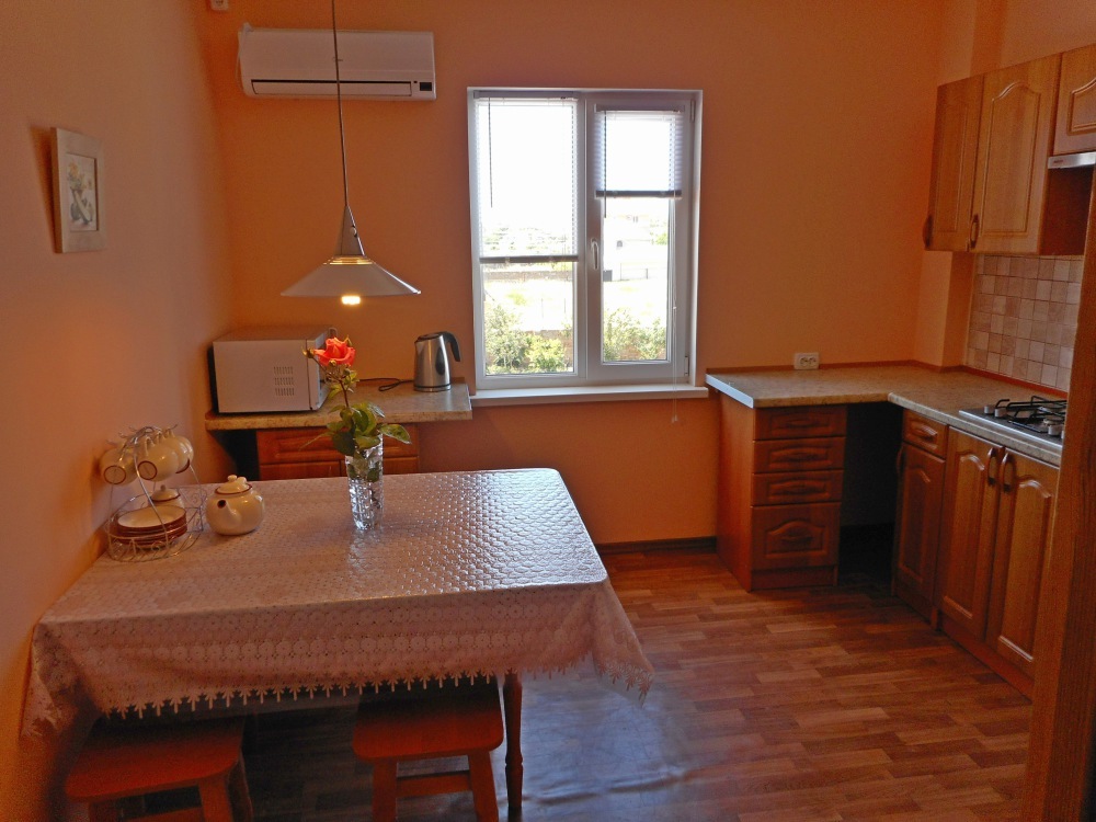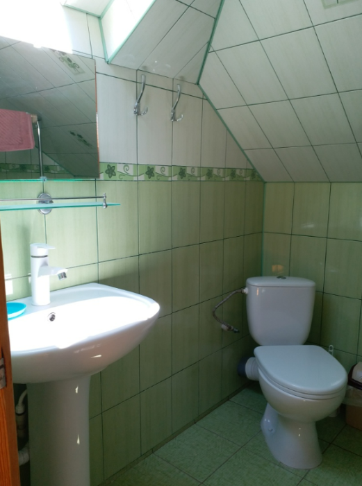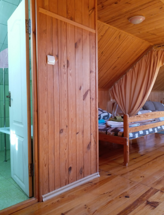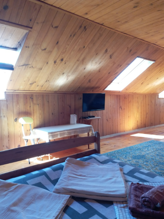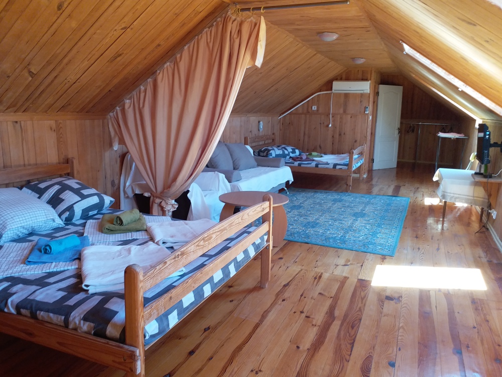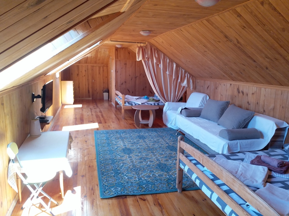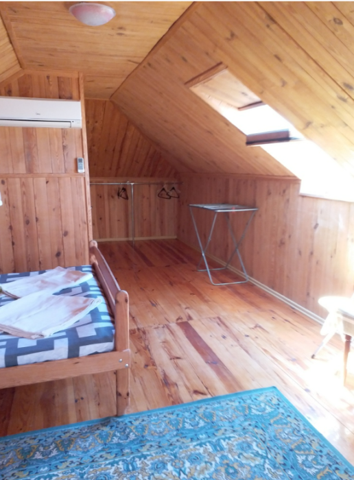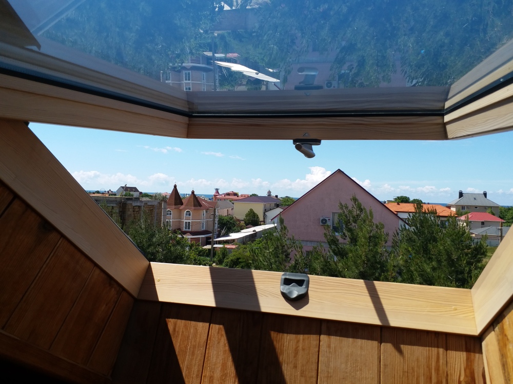 Мансарда отделана вагонкой из сосны, установлены мансардные окна через которые можно видеть море.