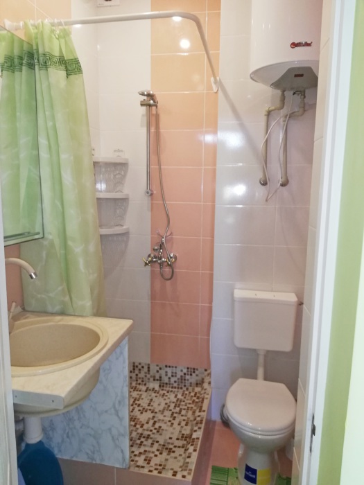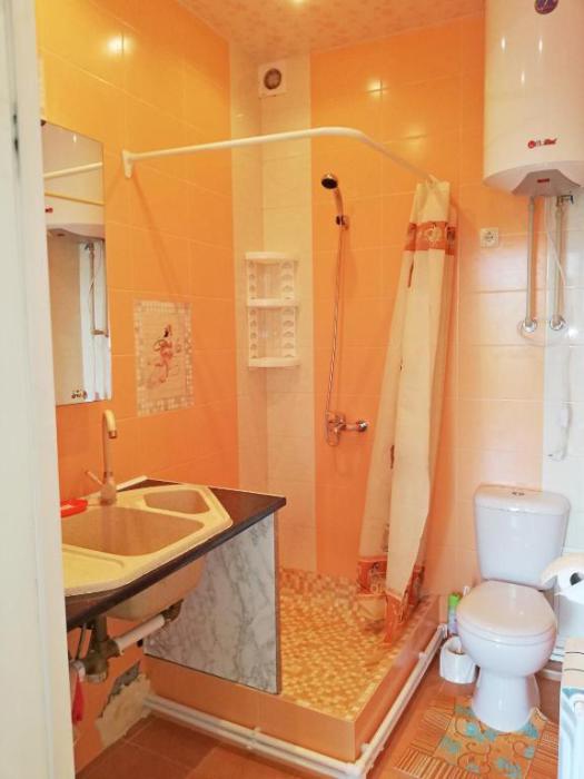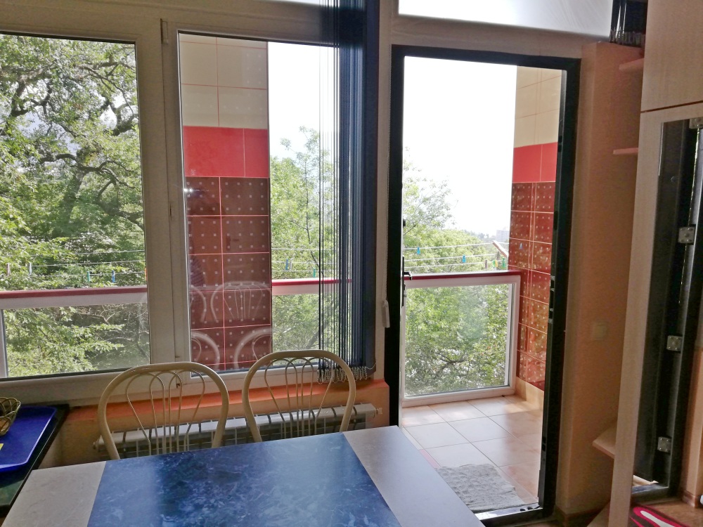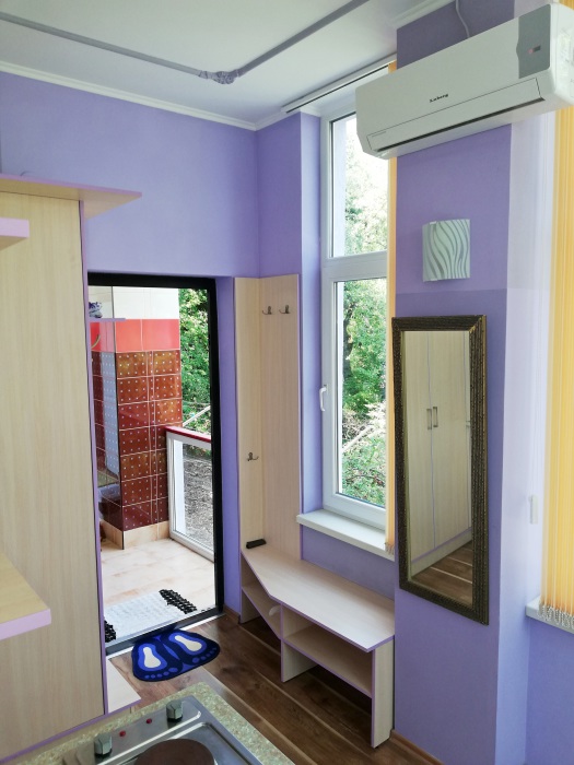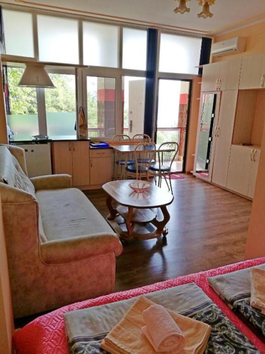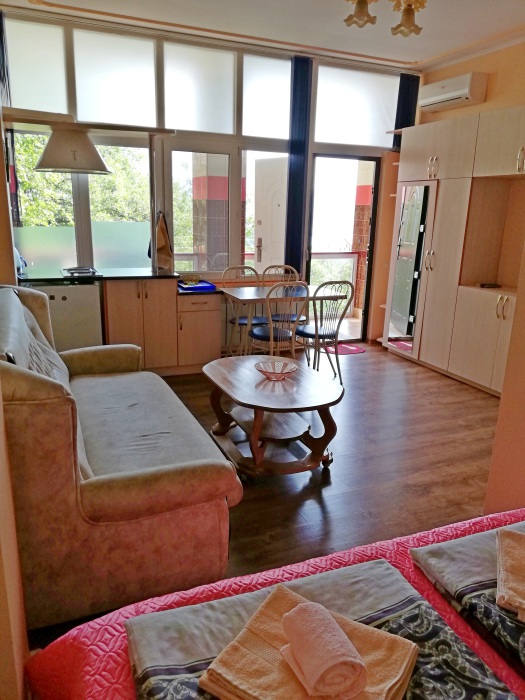 Комната-студия на 2 этаже трехэтажного дома. Для проживания есть всё необходимое: кровать двухспальная с ортопедическим матрасом, прикроватные тумбы, диван-кровать, кондиционер, холодильник, варочная поверхность электрическая на 2 конфорки, ТВ, WI-FI, бойлер 80 л (вода без перебоев), фен, утюг, посуда, бельё, полотенца, балкон/лоджия, парковочное место.