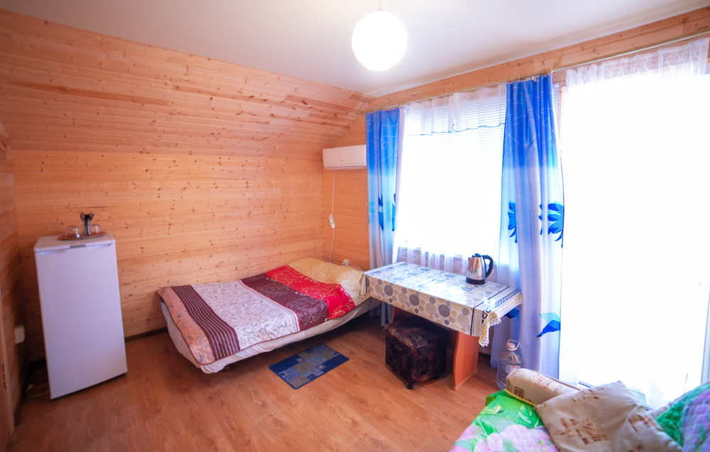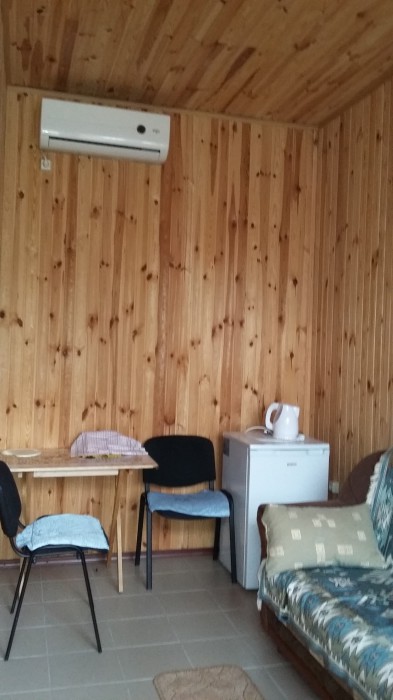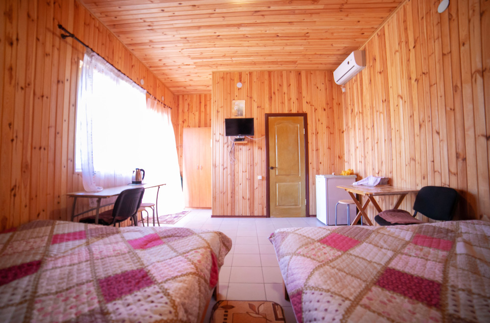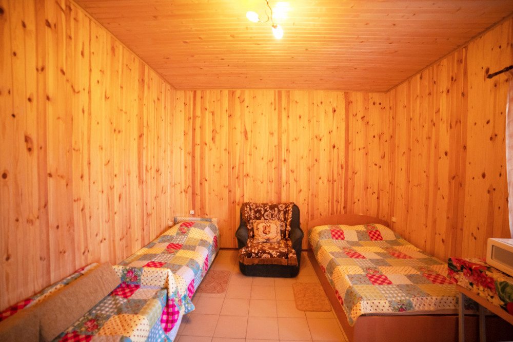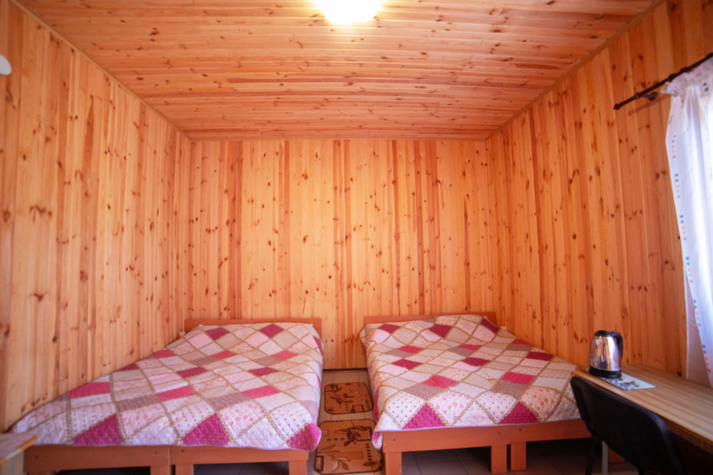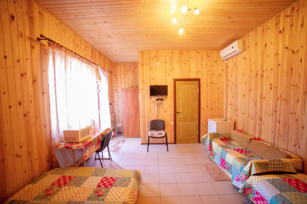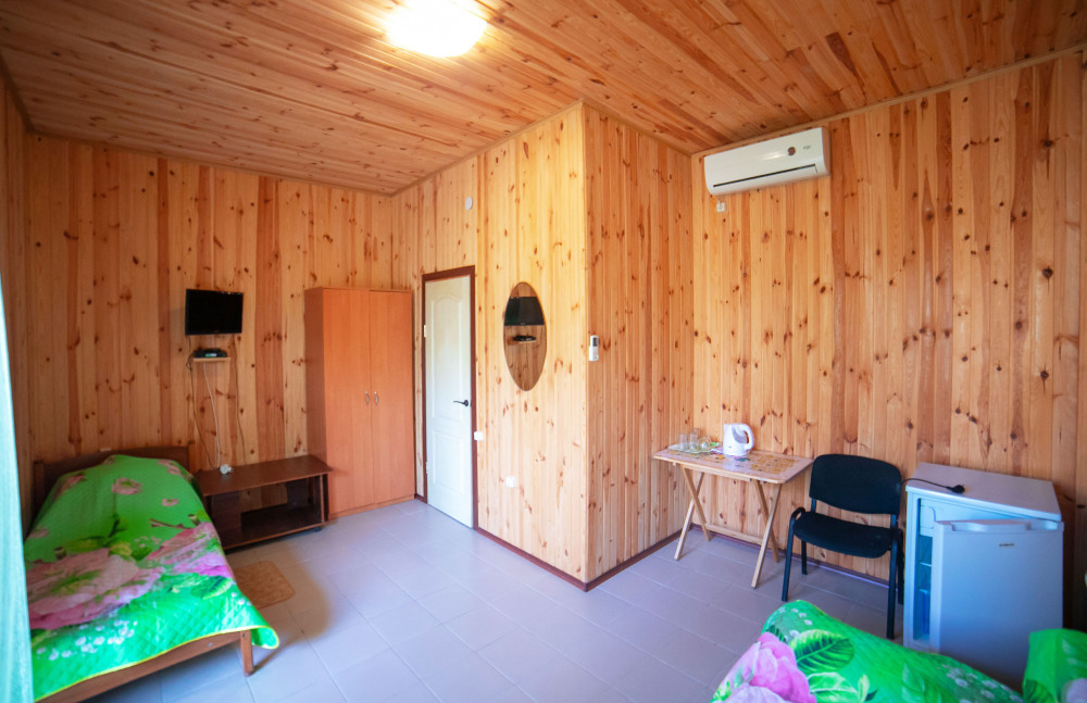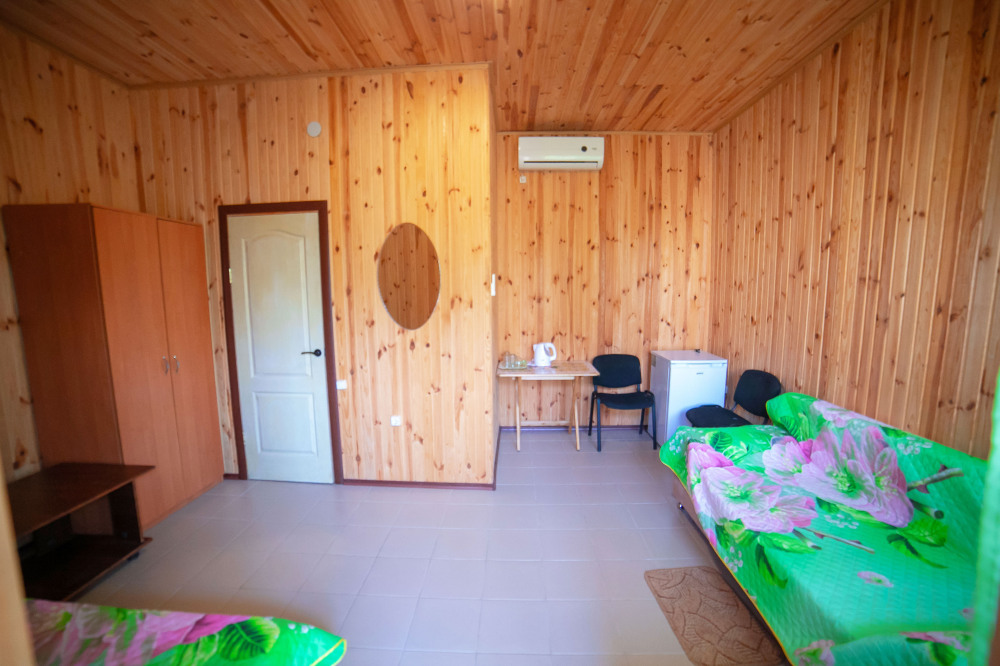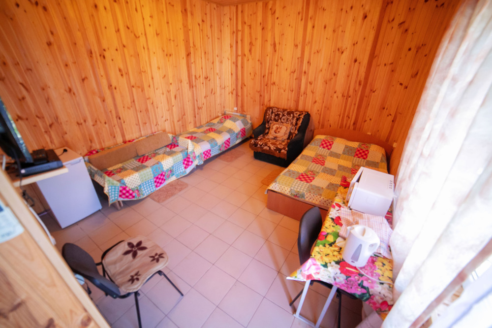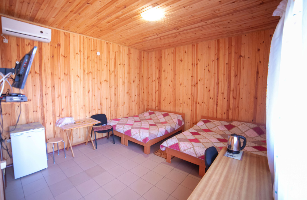 Комната с четырьмя односпальными кроватями, которые при желании можно расположить по собственному желанию. Также в номере шкаф, зеркало, два стола, стулья. Возле комнаты терраса со столом и стульями для отдыха. Интернет, холодная и горячая вода - круглосуточно.