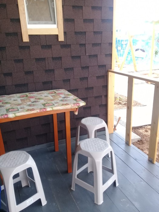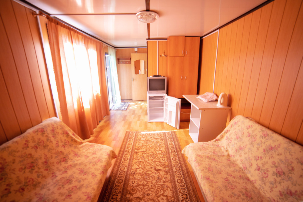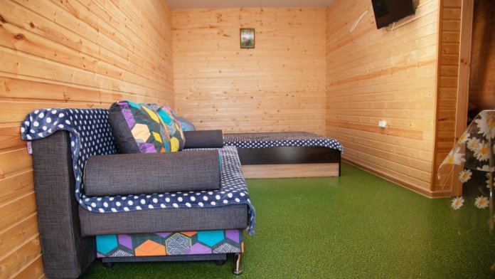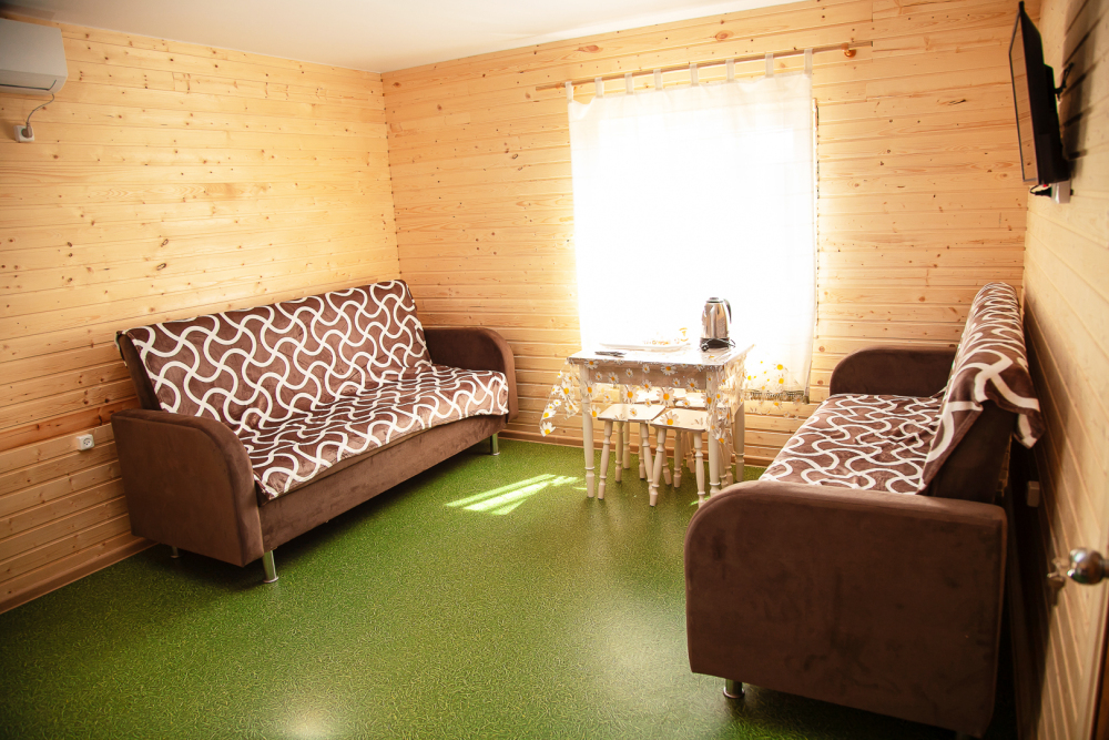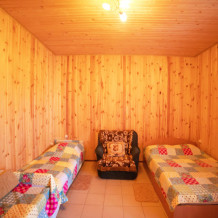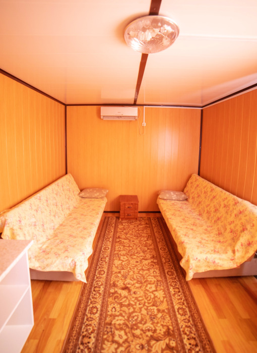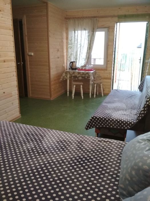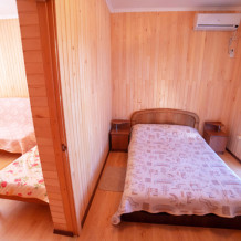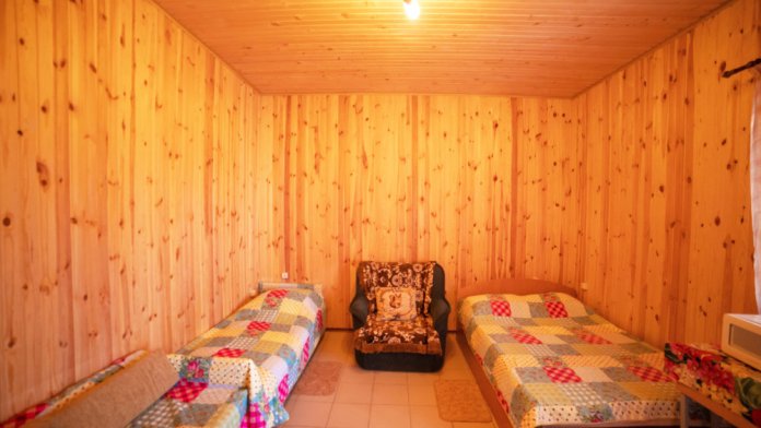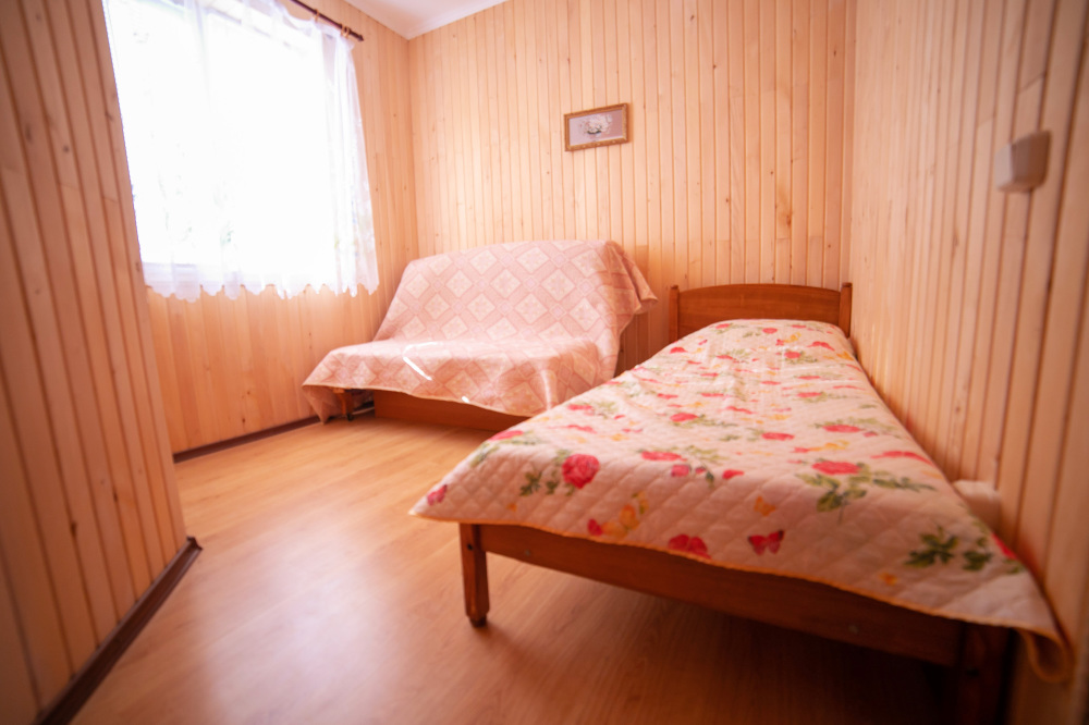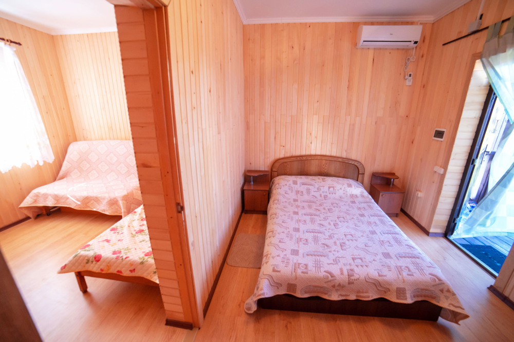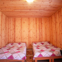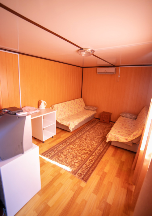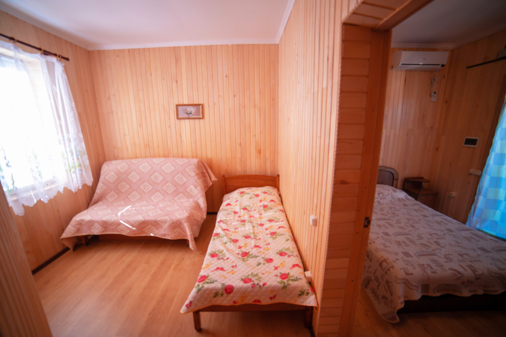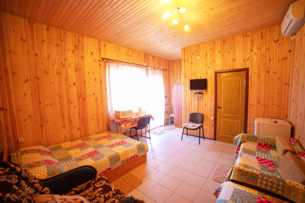 Комната с четырьмя односпальными кроватями, которые при желании можно расположить по собственному желанию. Также в номере шкаф, зеркало, два стола, стулья. Возле комнаты терраса со столом и стульями для отдыха. Интернет, холодная и горячая вода - круглосуточно.