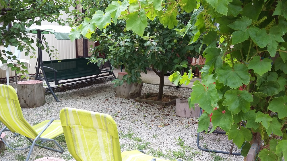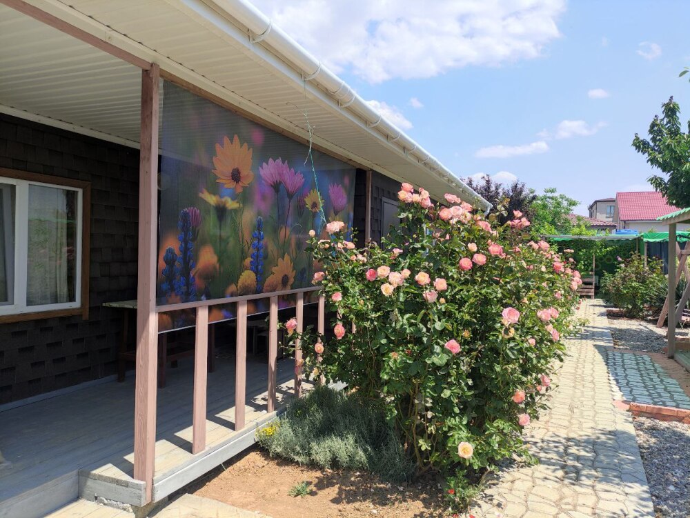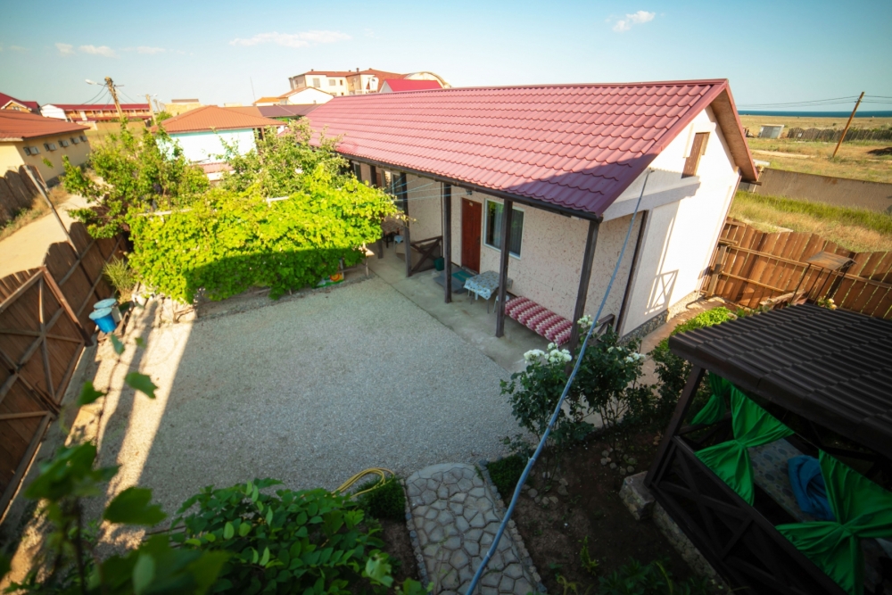 Окна номеров выходят либо на море, либо в сад. Своя территория, стоянка для машин, кухня с полным набором посуды, мангал, барбекю, шезлонги, качели, песочница, беседка, зоны отдыха и игры.