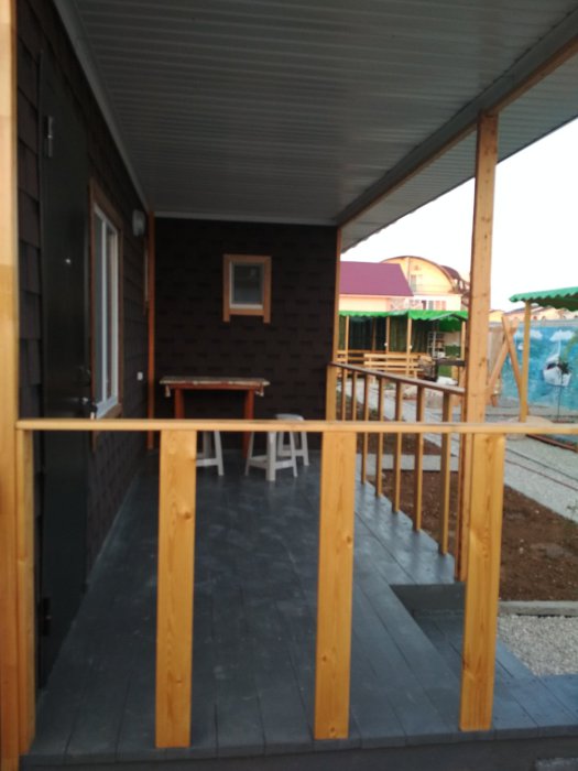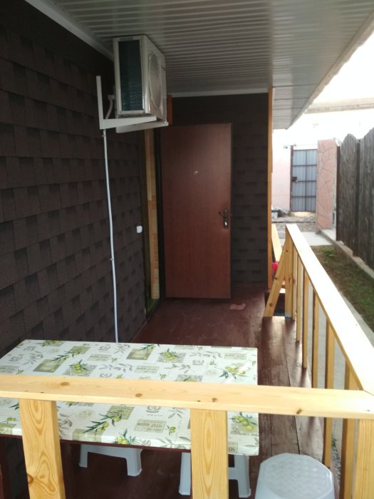 Возле комнаты терраса со столом и стульями для отдыха на воздухе.