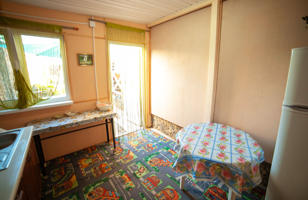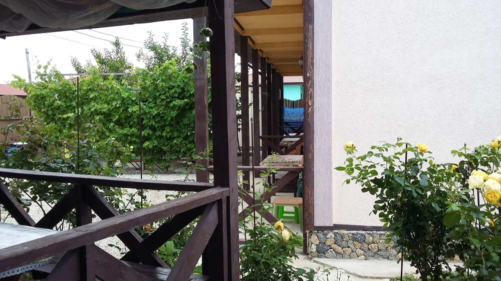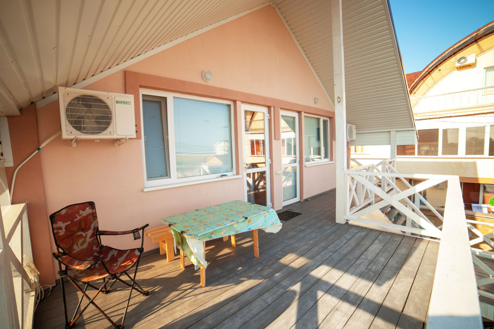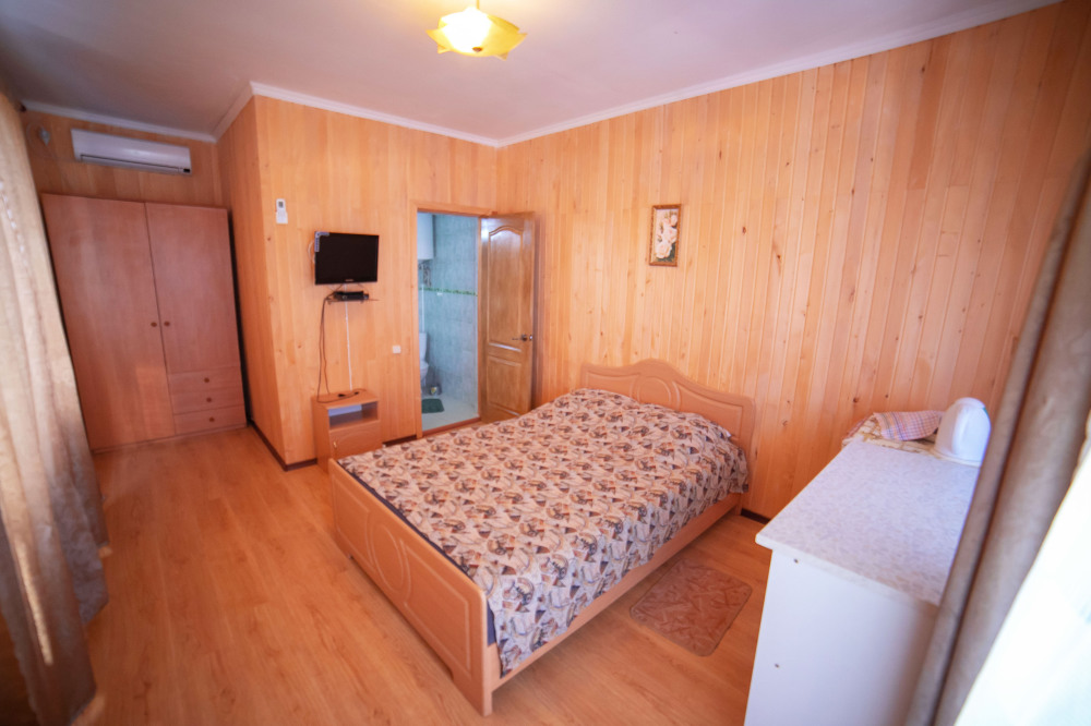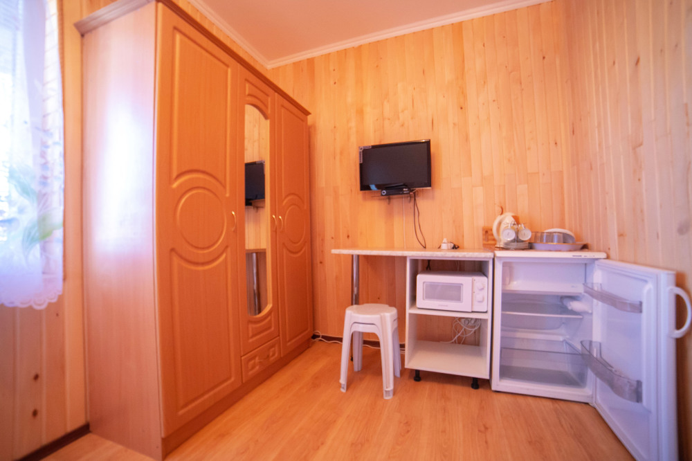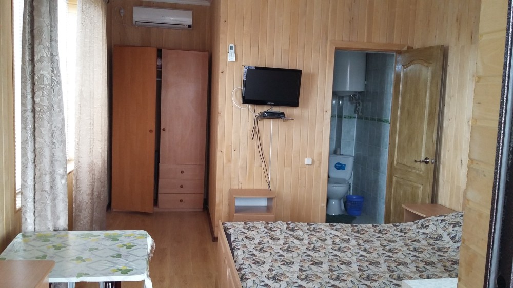 Один из 6-ти местных номеров - Студия имеет особый статус, так как он занимает весь первый этаж дома и имеет своею кухню с посудой и беседку для отдыха. В номере - кондиционер, стиральная машина, микроволновая печь, электрочайник, холодильник, телевизор, спутниковая антенна, еврокровать, два раскладных дивана, раскладное кресло и имеется возможность двух дополнительных мест. Два других 2-комнатных 6-местных расположены на отдельной территории площадью 4 сотки и еще два 2-комнатных 6-местных расположены на втором этаже, имеют большой балкон с видом на море, а также летнюю кухню и площадку для отдыха, которые используются только жильцами этих двух номеров.