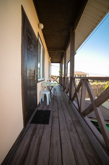 Номер находиться на втором этаже со всеми удобствами.В номере переносной столик со стульями для отдыха на балконе.