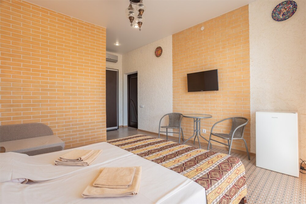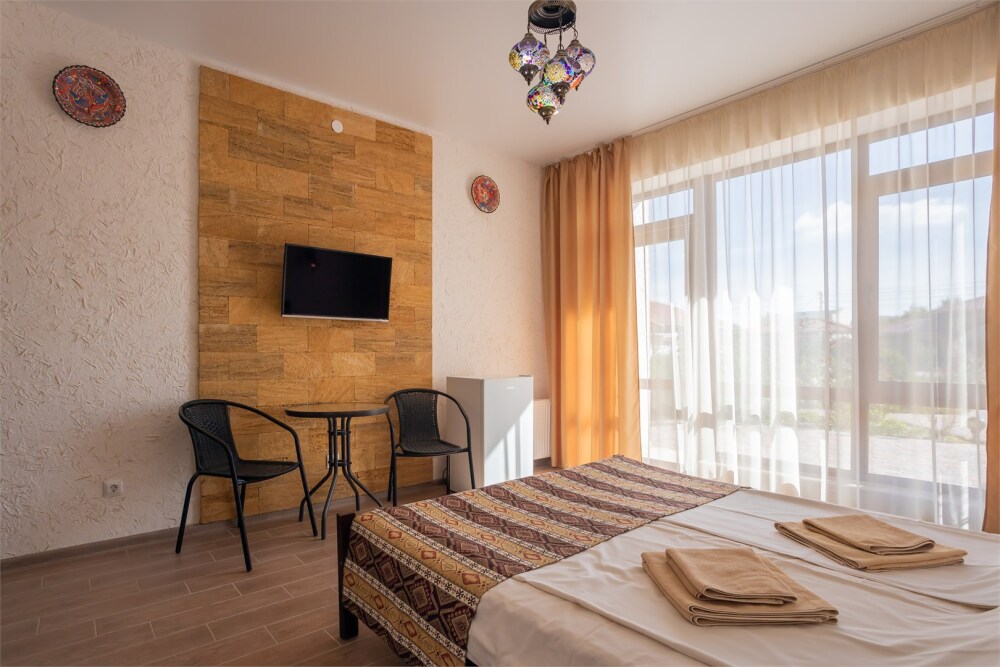 Это идеальное место для людей, ценящих тишину и покой. До моря 3 минуты не спешного шага. Все наши номера оборудованы удобствами (туалет, умывальник, душ). ТV, холодильник, кондиционер – в каждом номере.
