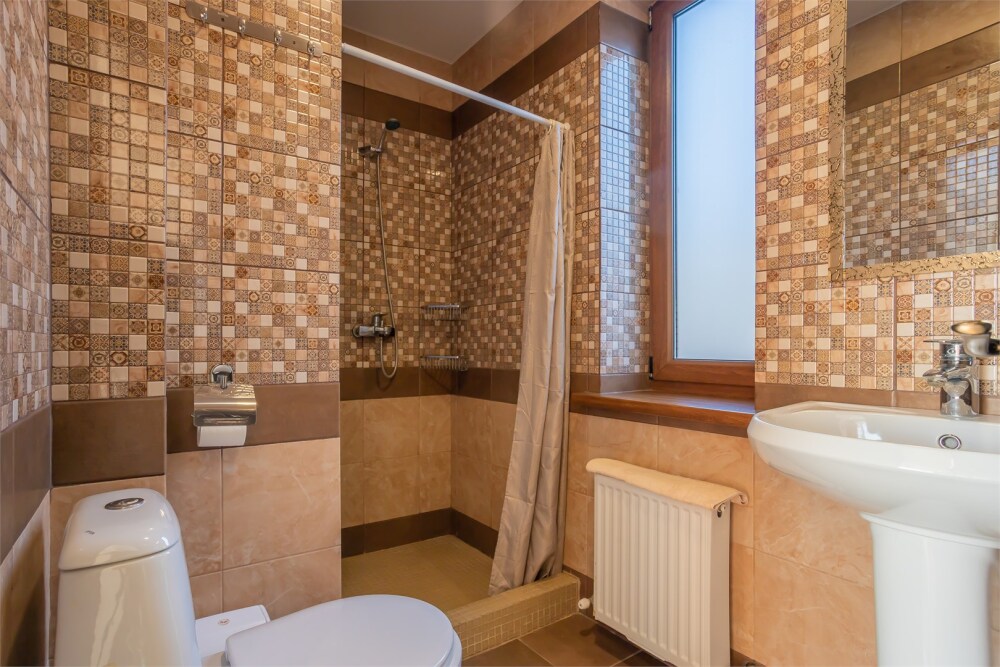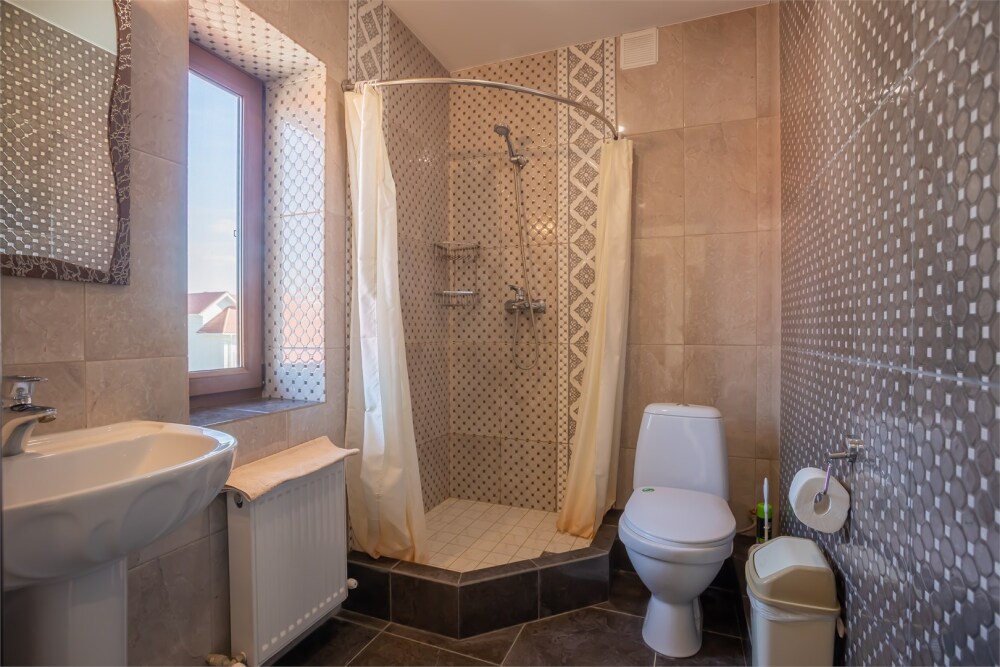 В каждом номере имеется собственная ванная комната с современной душевой кабиной, туалетом и умывальником. Мы позаботились о каждой мелочи для Вашего удобства.