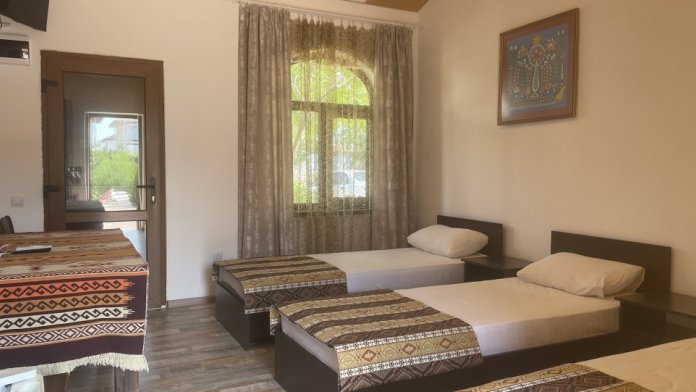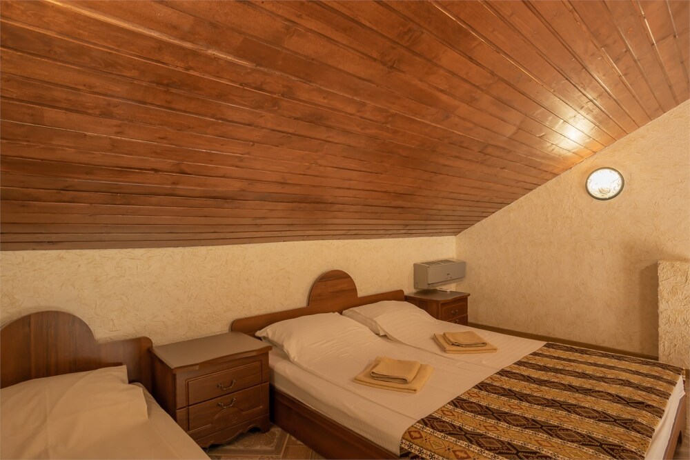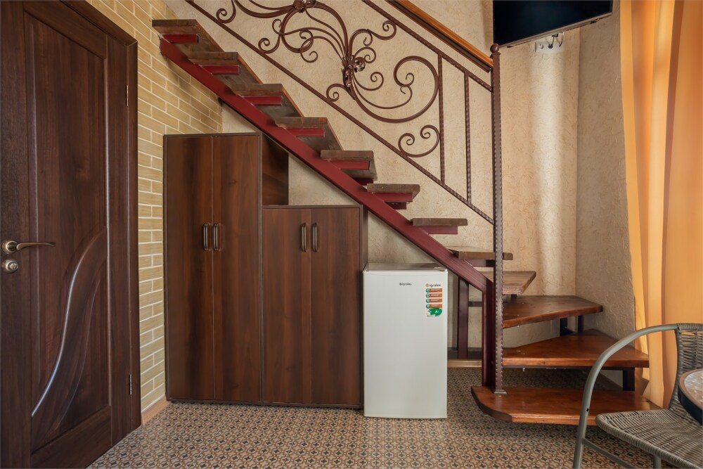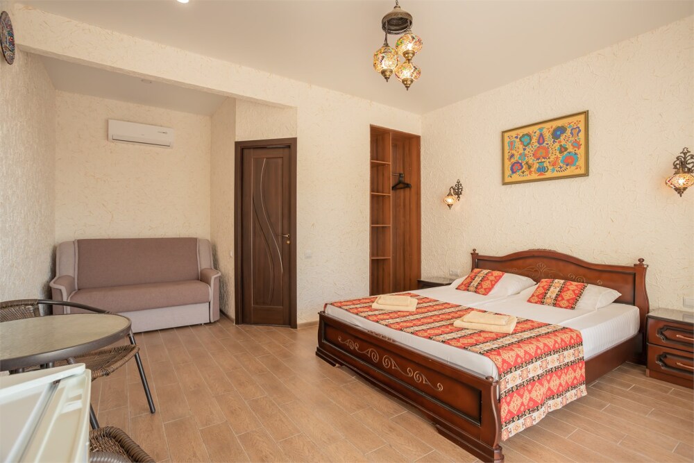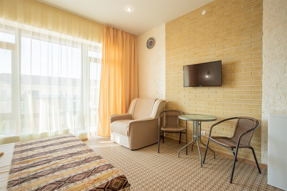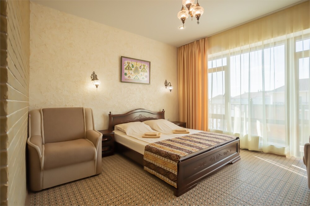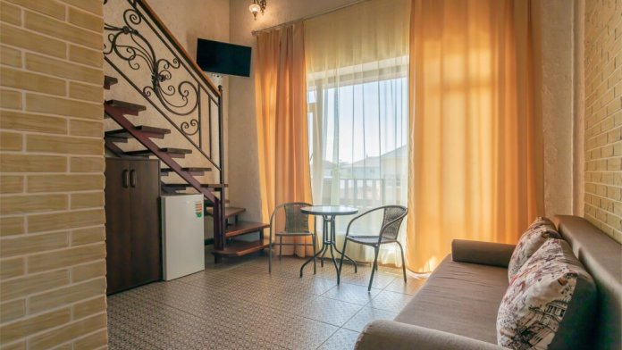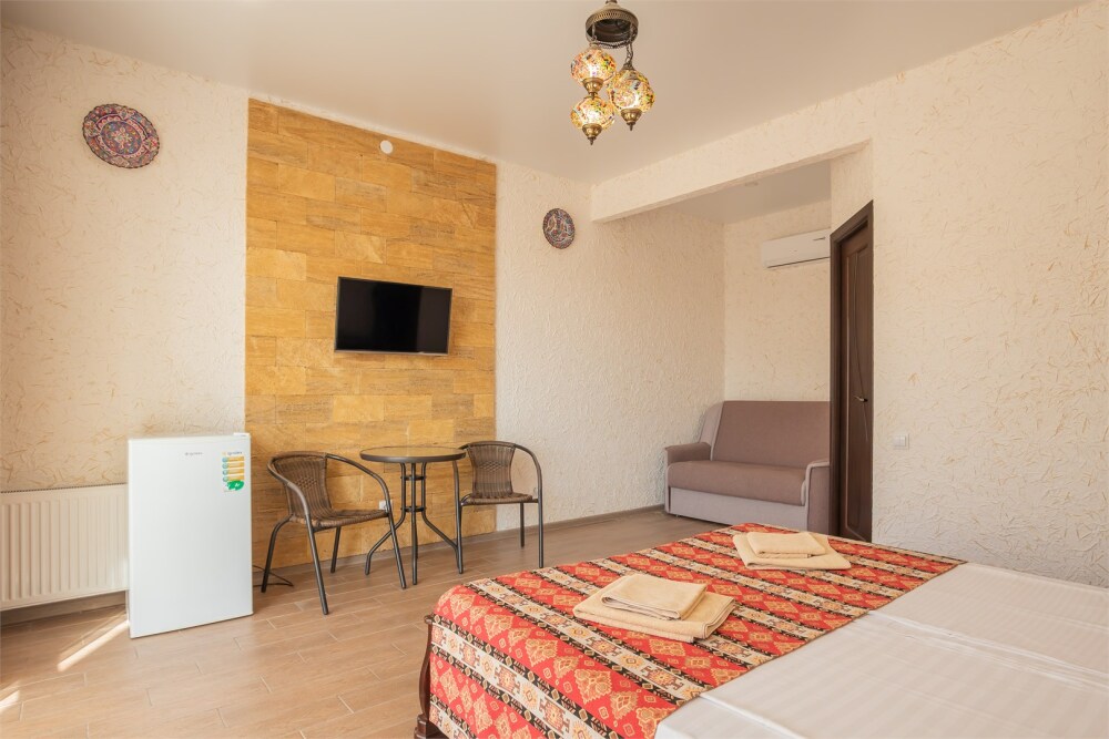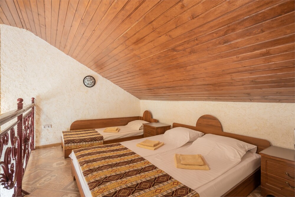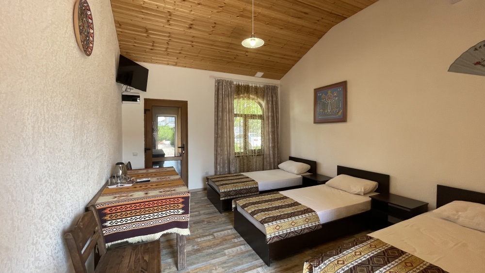 Трехместный номер Стандарт — это отдельно стоящий домик с индивидуальным входом. Номер предназначен для проживания трех человек. Возможно размещение четвертого человека (на дополнительном месте).