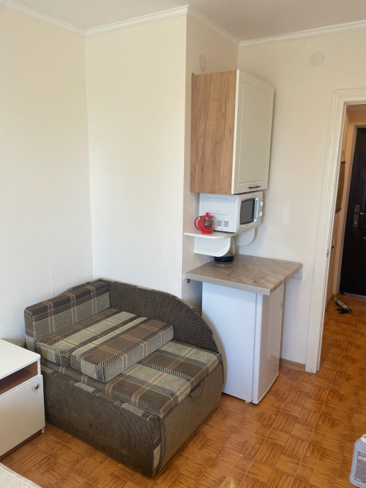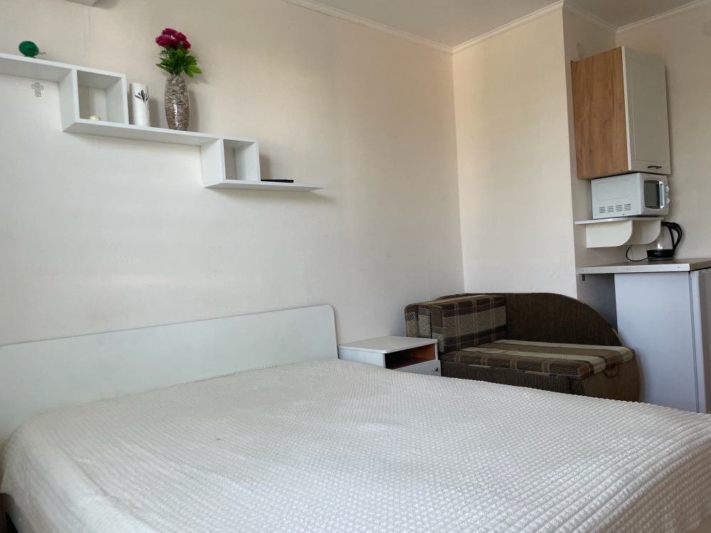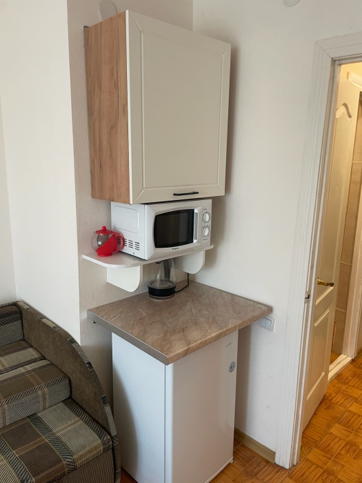 Все удобства, хороший ремонт, горячая вода круглосуточно, кондиционер, СВЧ-печь, электрочайник, холодильник.