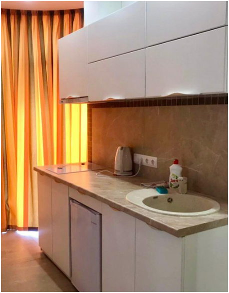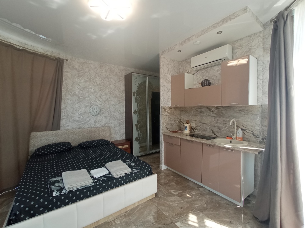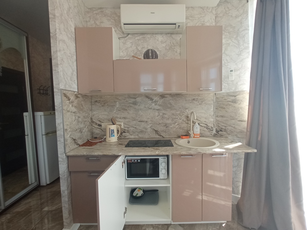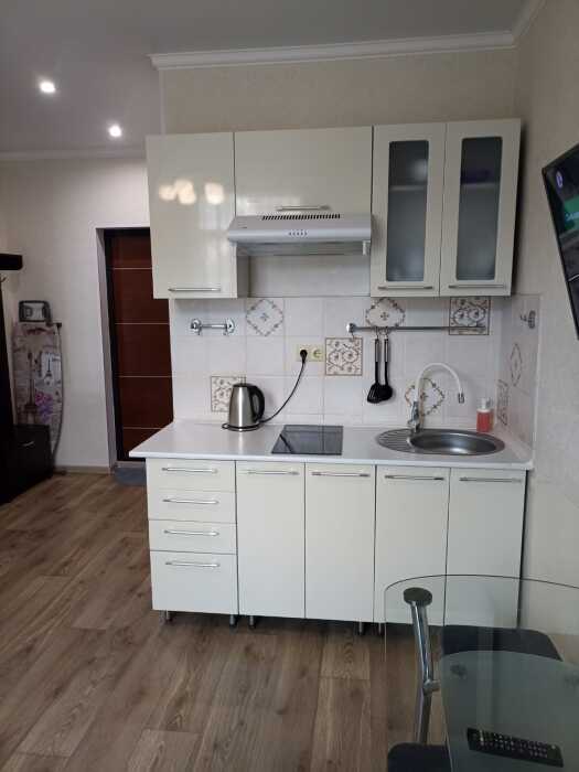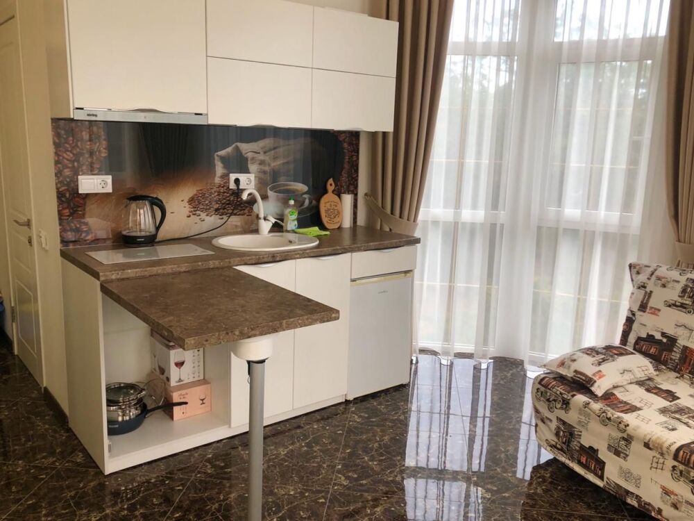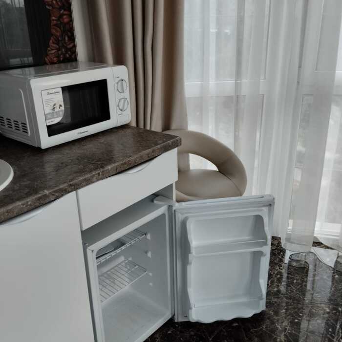 Небольшая функциональная студия с мини-кухней. В номере набор посуды, фен.
