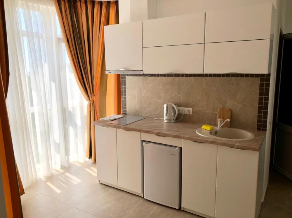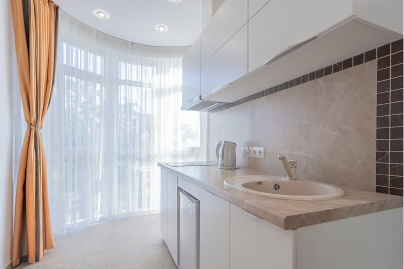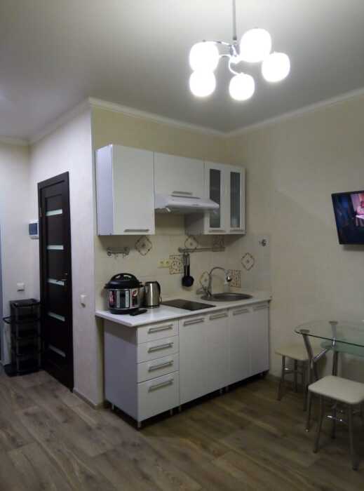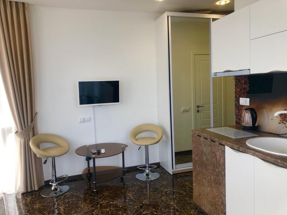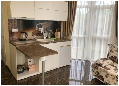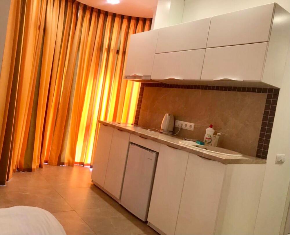 Небольшая функциональная студия с мини-кухней. В номере набор посуды, фен.