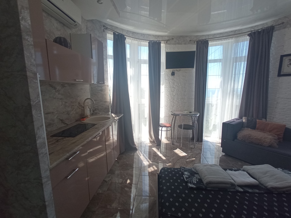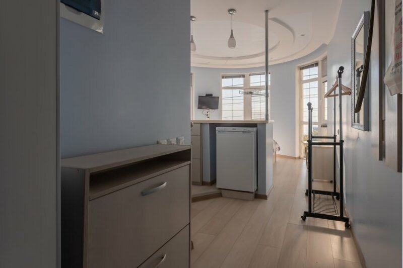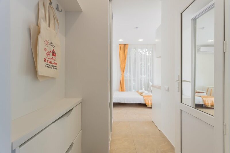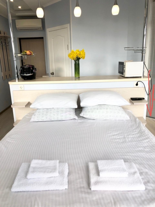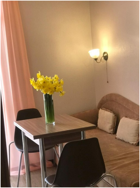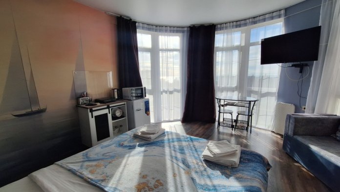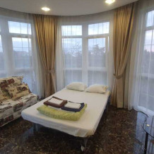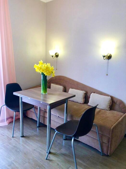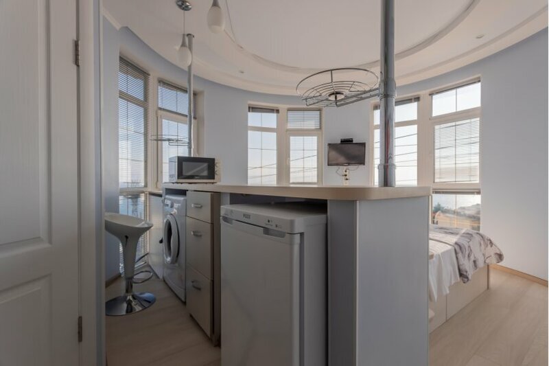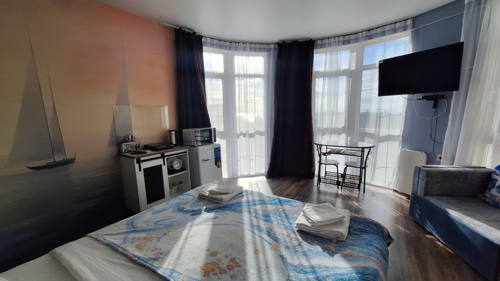 Светлые небольшие апартаменты с эркером. В апартаментах полноценная кухня. Спальное место - удобная раскладная еврокровать. Номер оборудован кондиционером, набором посуды, текстиля, полотенец, стиральной машиной.