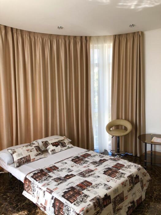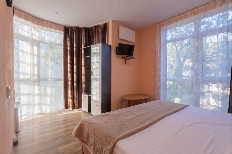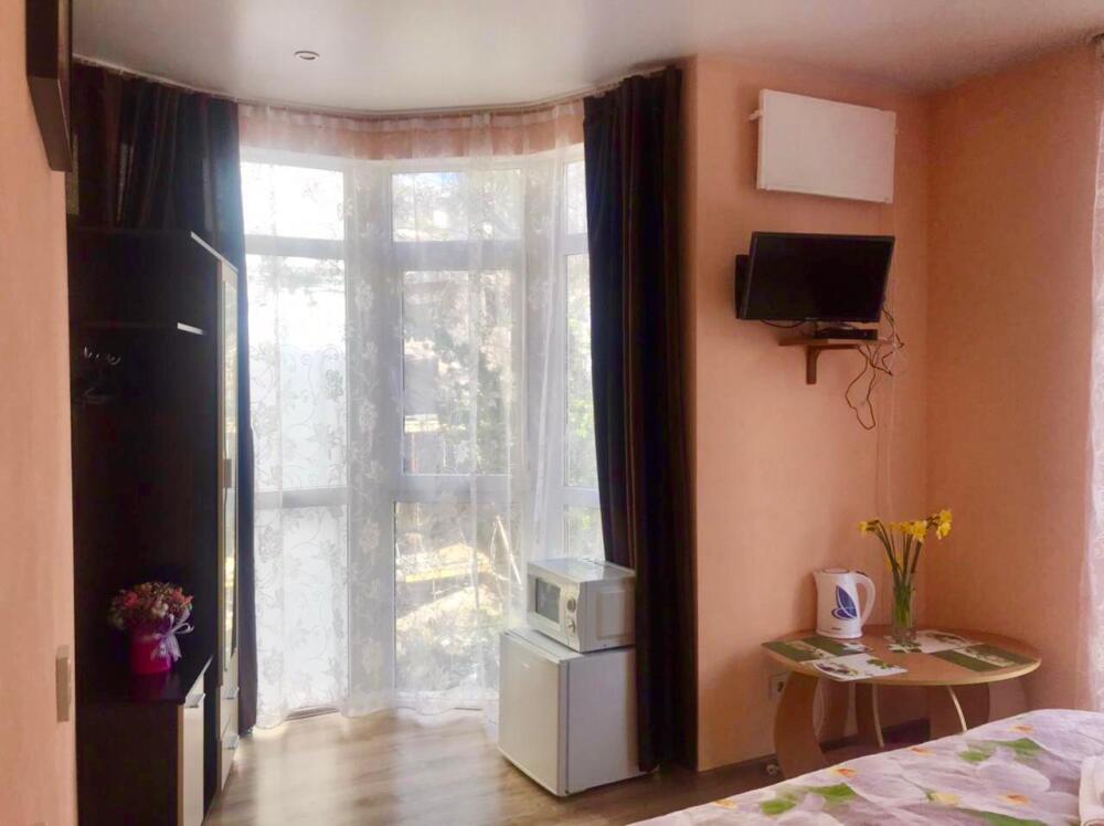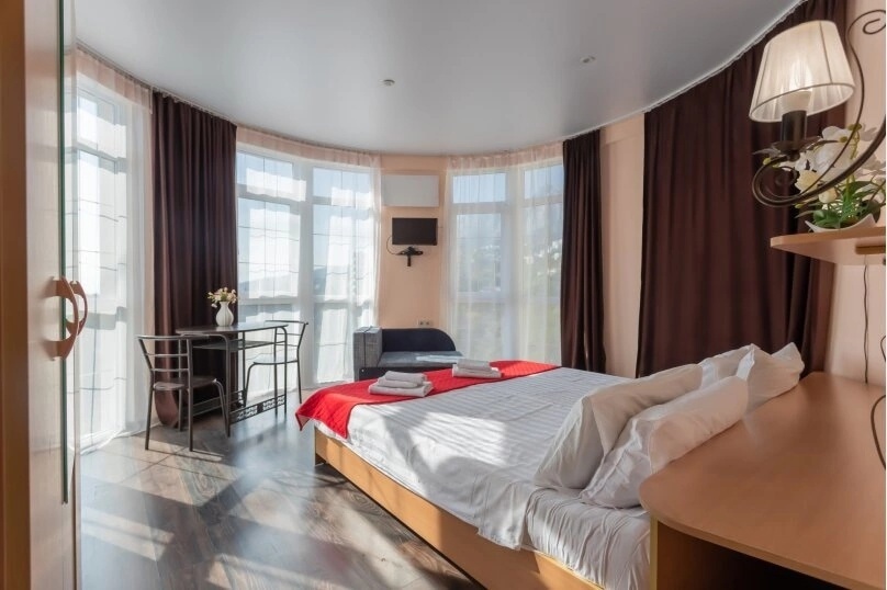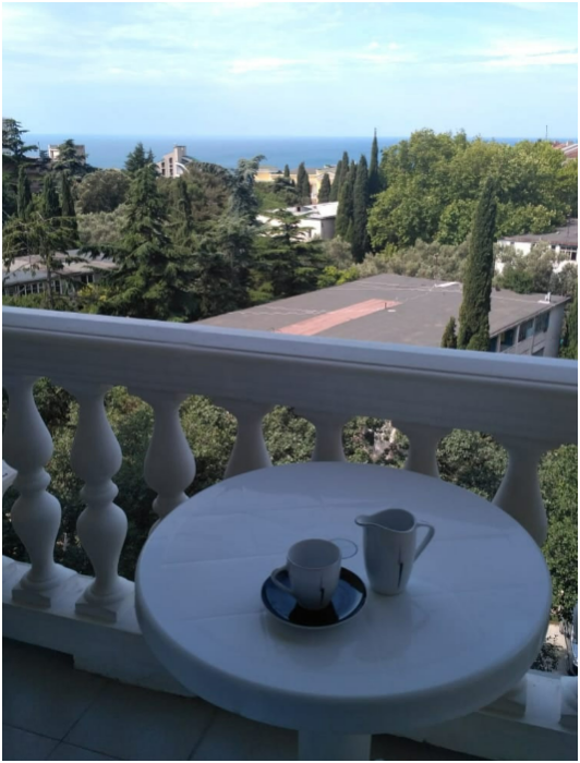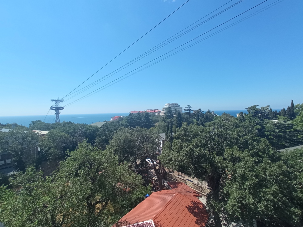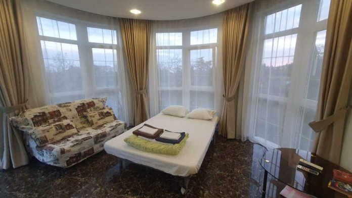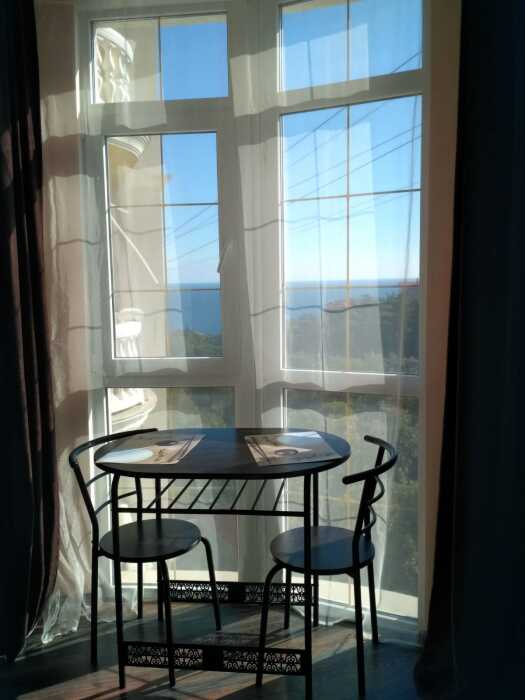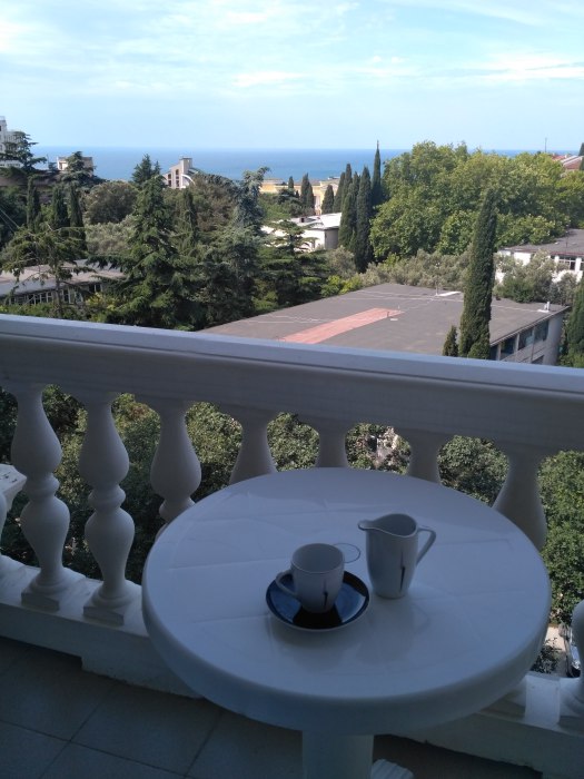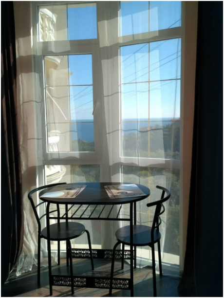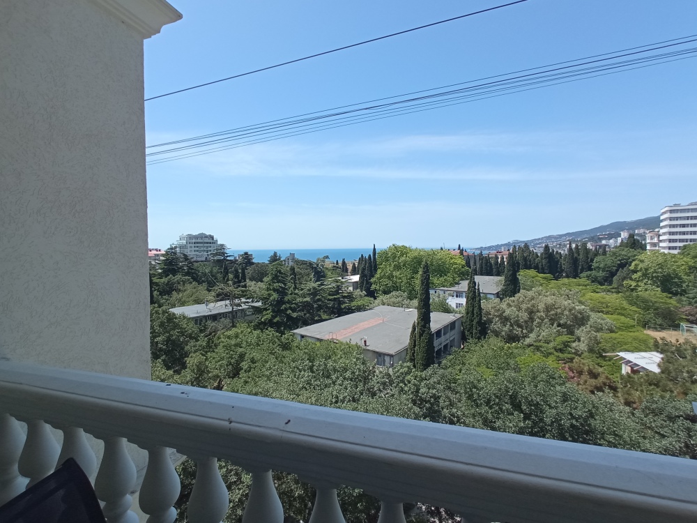 Круглый видовой номер с мини кухней. Из всех окон открывается шикарный вид на море, горы Ай-Петри, ближайшие парки и поселки вплоть до Алупкинской гряды.