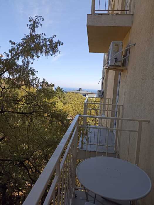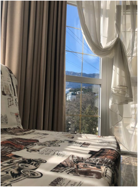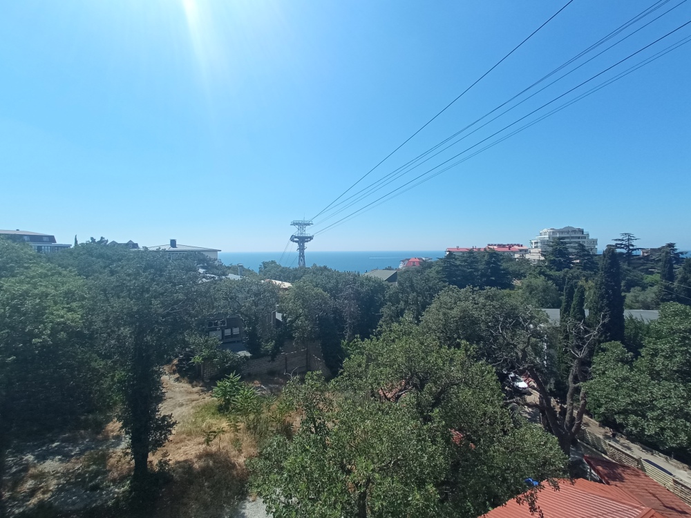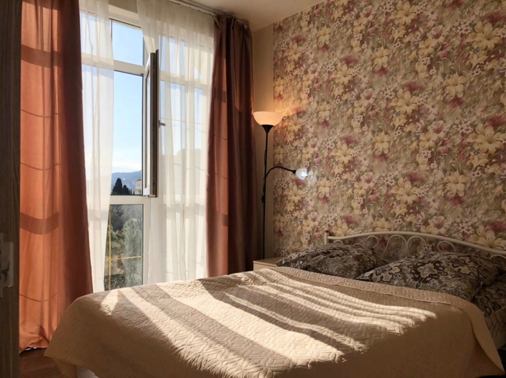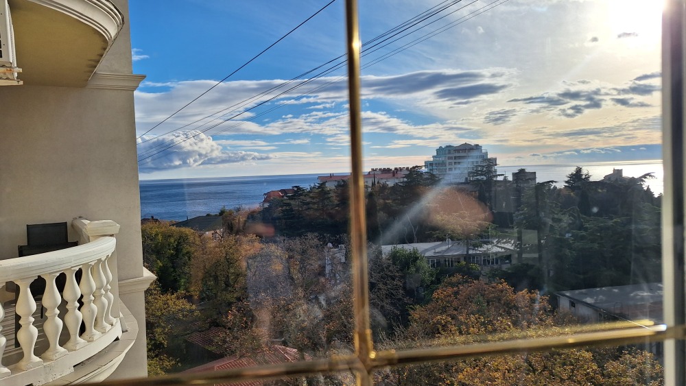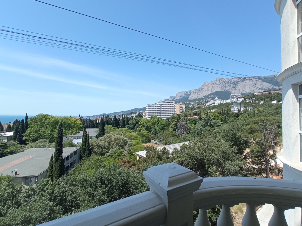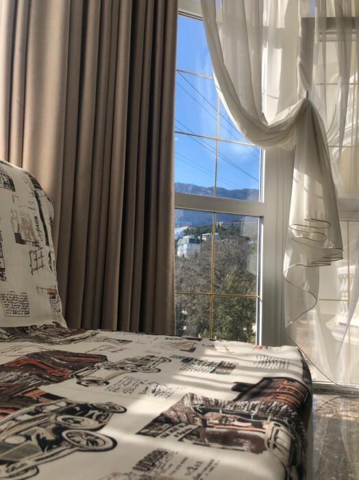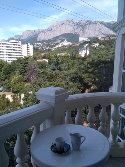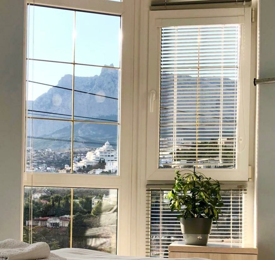 Апартаменты с панорамными окнами. Вид на горы Ай Петри и на море из-за деревьев