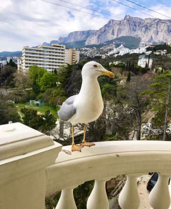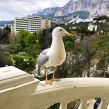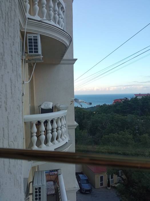 Семейный номер на 4-5 этаже, состоящий из спальни, небольшой полноценной кухни. Из всех окон и с балкона открывается шикарный вид на море и горы Ай Петри. В номере двуспальная кровать и раскладной диван. Номер также оборудован кондиционером, набором посуды, текстиля, полотенец, стиральной машиной. Отличительная черта данного номера в том, что регулярно на балкон прилетает дрессированная чайка (на фото), которая может составить Вам компанию за еду).