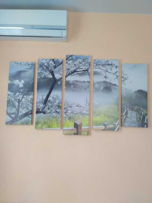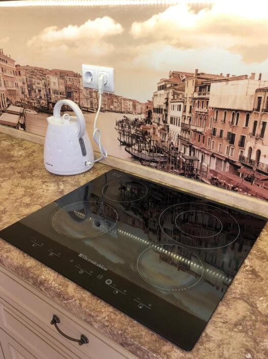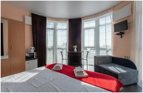 По кругу расположены 4 витражных окна в пол. В номере имеется 2 спальная кровать, односпальный диван, шкаф, стол, фен, кондиционер, телевизор со спутниковым ТВ, микроволновка, электроплита, холодильник, эл. чайник, мультиварка, набор посуды.