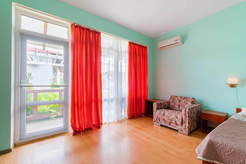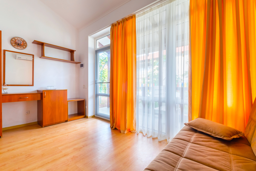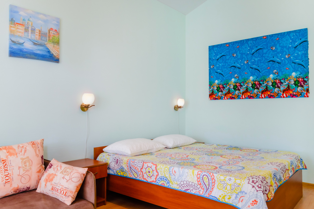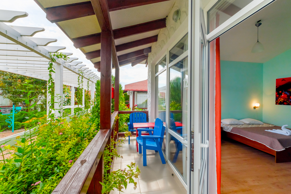 Уютный двухместный номер, в котором есть двуспальная или 2 полуторных кровати, кондиционер, телевизор со спутниковым ТВ, стол, сейф, посуда и холодильник, удобства. Номера с террасой или балконом. Есть доступ к Интернету (Wi-FI).