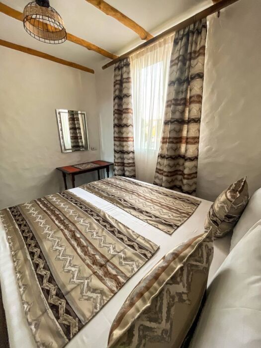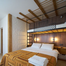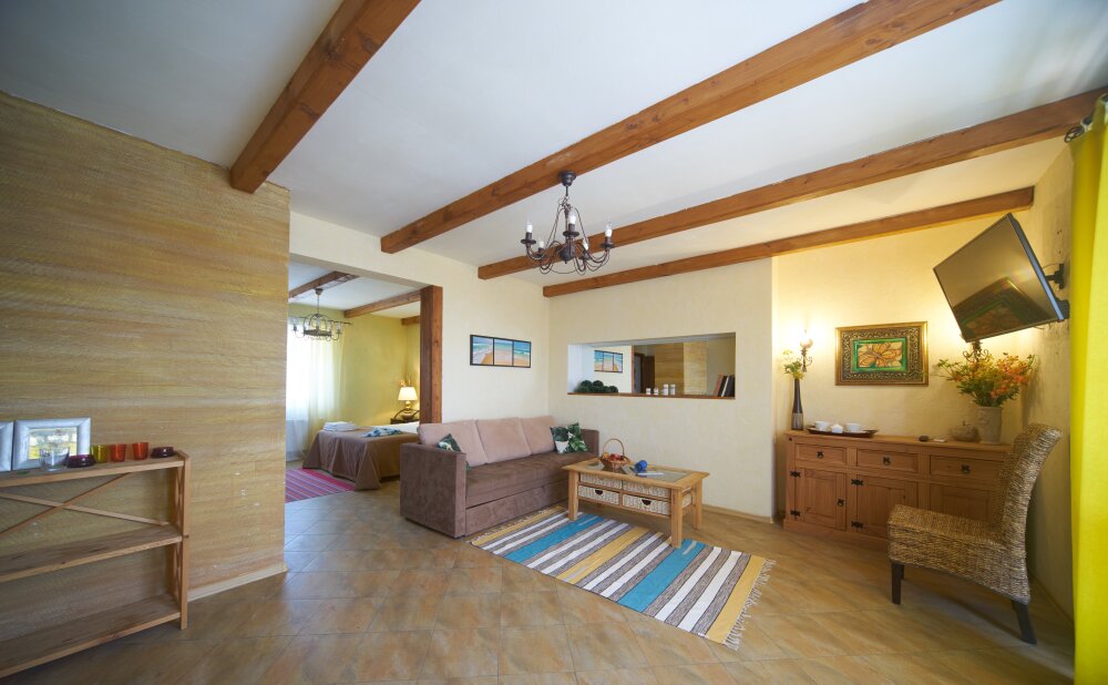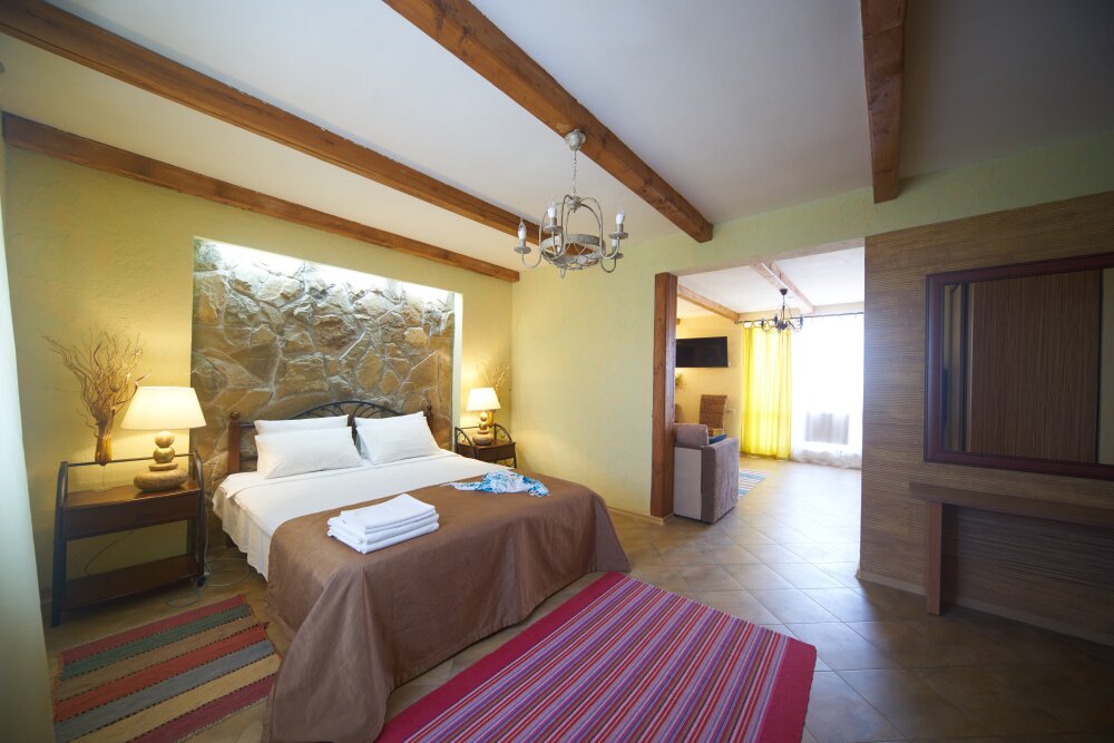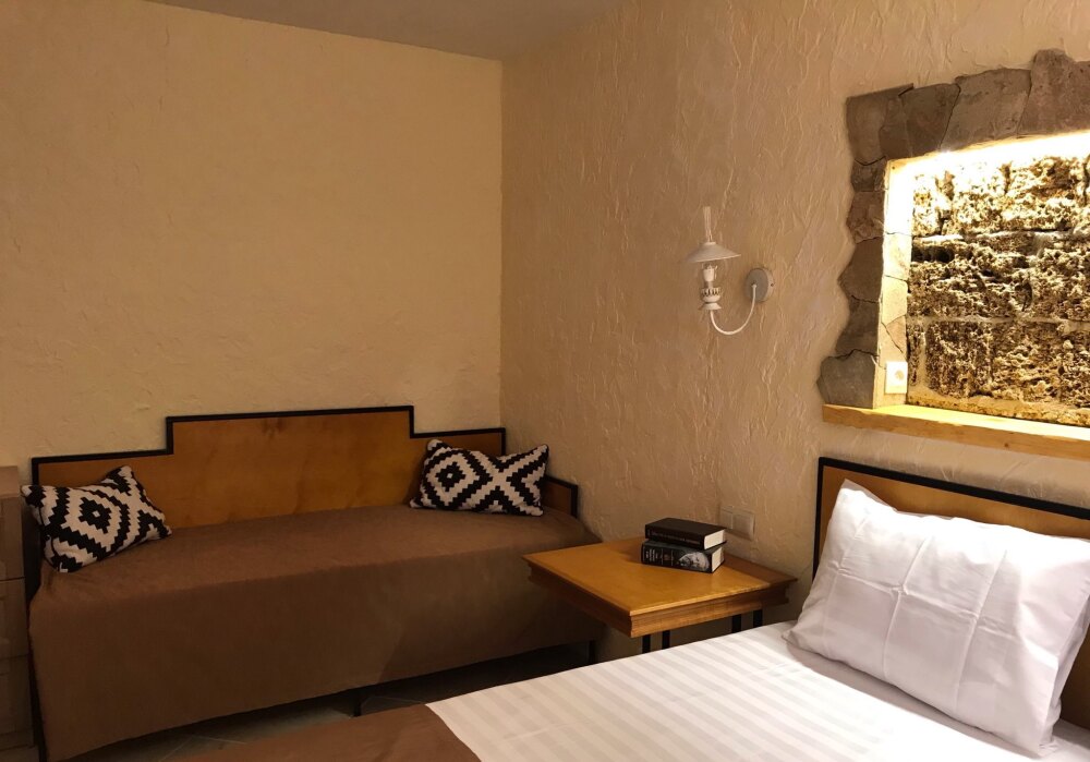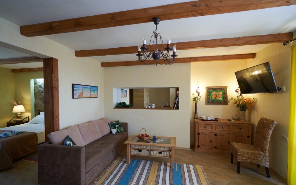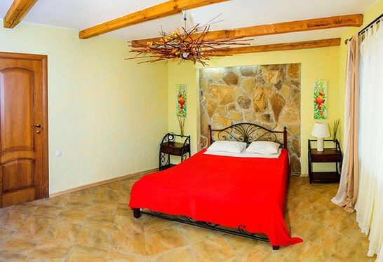 Двухкомнатный номер категории Люкс № 6 (площадь 28 м², одна комната проходная, в африканском стиле с собственной ванной комнатой, на третьем этаже, с балкончиком, видом на внутренний дворик), четырёхместное размещение, на выбор:один двухспальный раскладной диван и одна двухспальная кровать с ортопедическим матрасом и подушками или один двухспальный диван и две раздельные кровати с ортопедическими матрасами и подушками).
