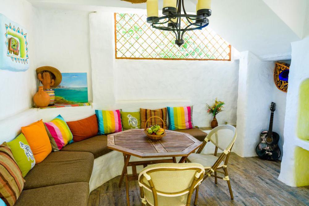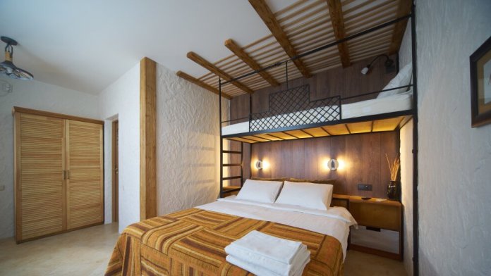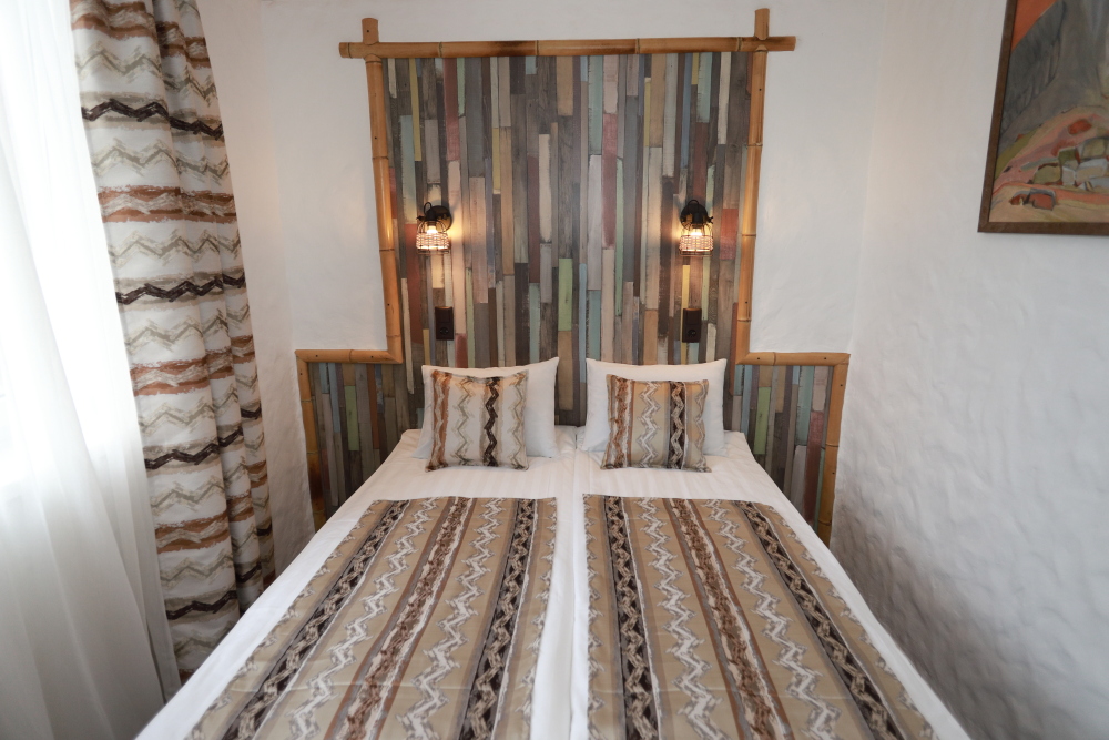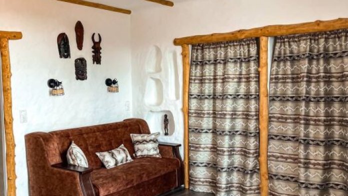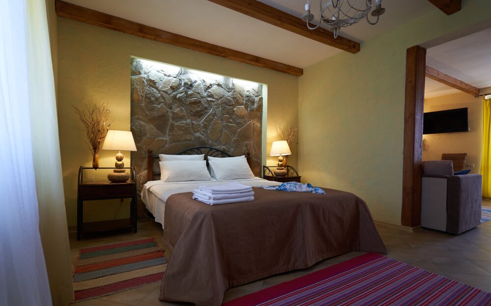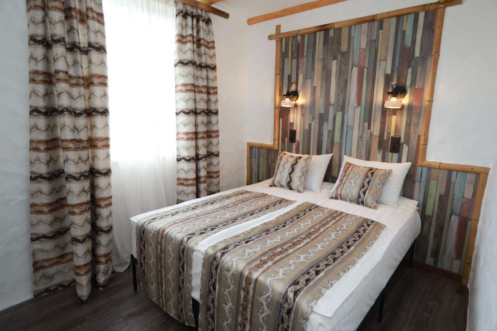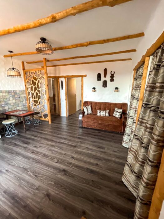 Двухкомнатный номер категории Люкс № 6 (площадь 28 м², одна комната проходная, в африканском стиле с собственной ванной комнатой, на третьем этаже, с балкончиком, видом на внутренний дворик), четырёхместное размещение, на выбор:один двухспальный раскладной диван и одна двухспальная кровать с ортопедическим матрасом и подушками или один двухспальный диван и две раздельные кровати с ортопедическими матрасами и подушками).