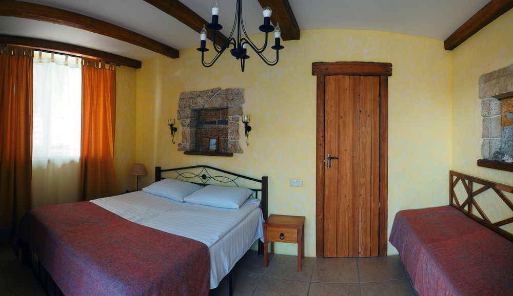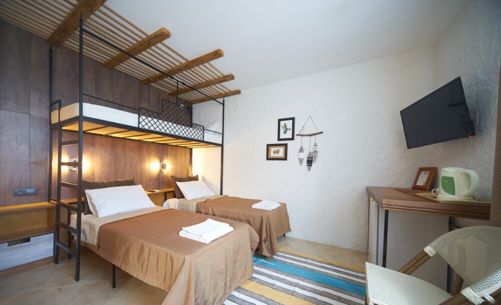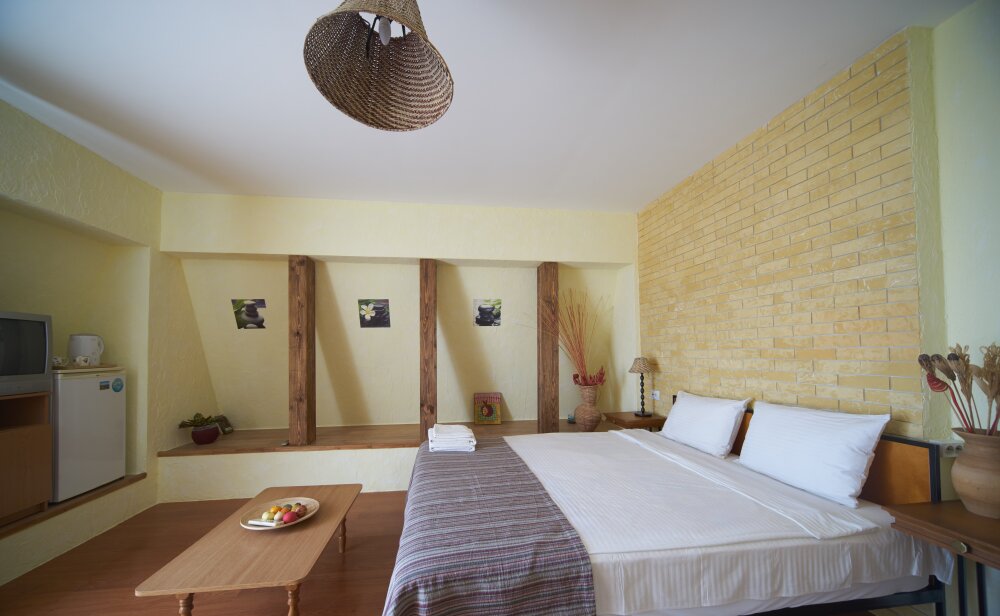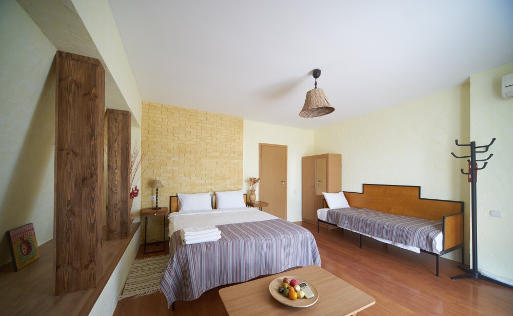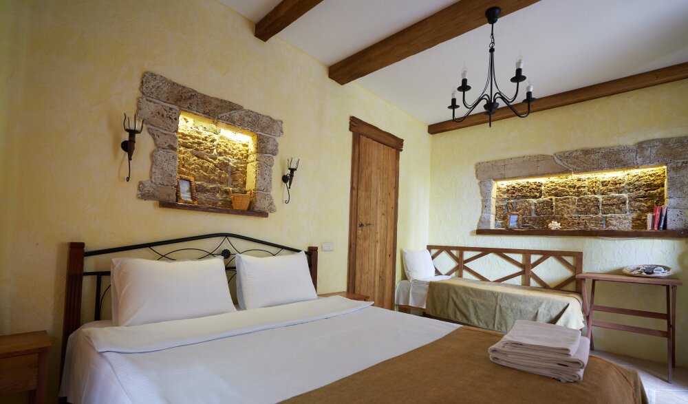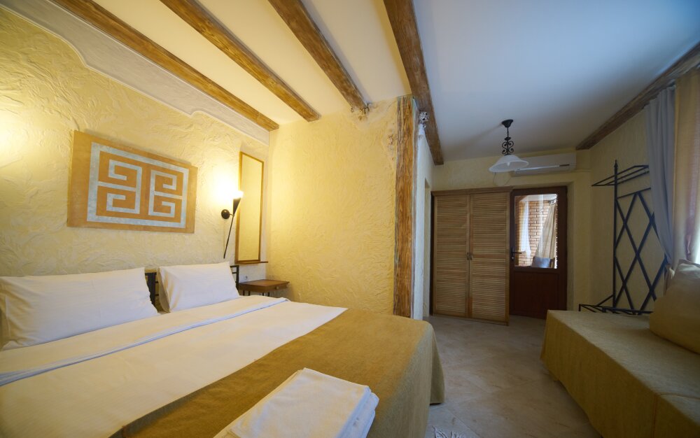 Однокомнатный трёхместный номер категории Стандарт Улучшенный № 10 (площадь 22 м², в средиземноморском стиле с собственной ванной комнатой, на первом этаже, с большой террасой, топчаном и видом на внутренний дворик, трёхместное размещение, на выбор:одна двухспальная и одна односпальная чердачная кровать или две раздельные кровати и одна односпальная чердачная кровать с ортопедическими матрасами и подушками).