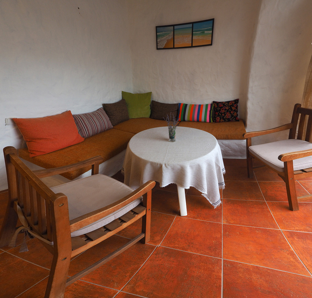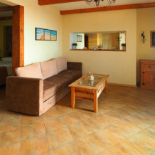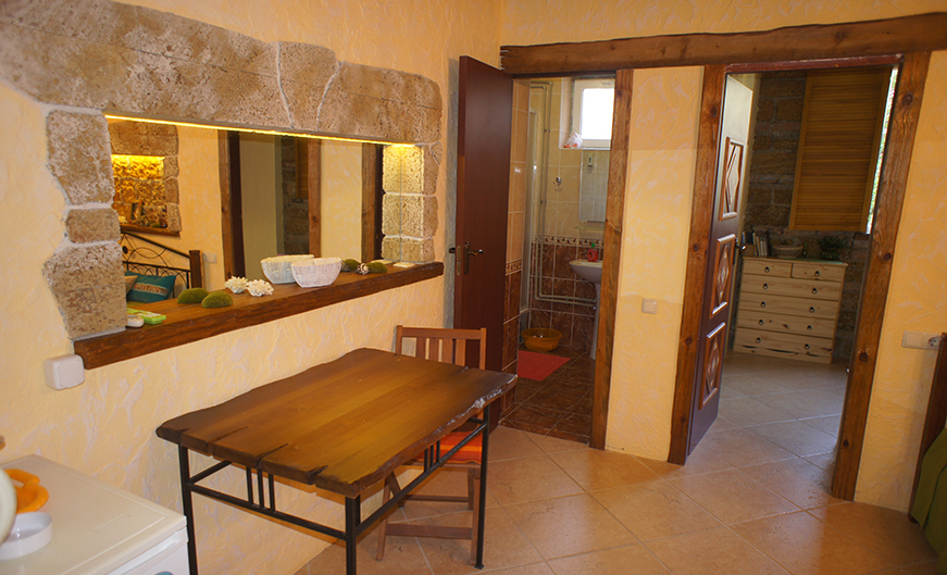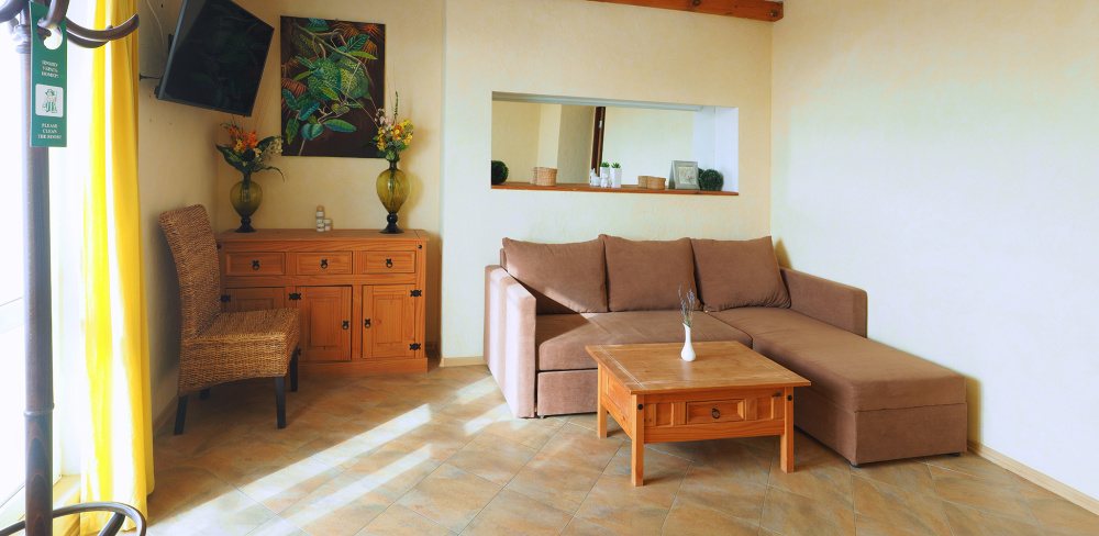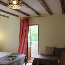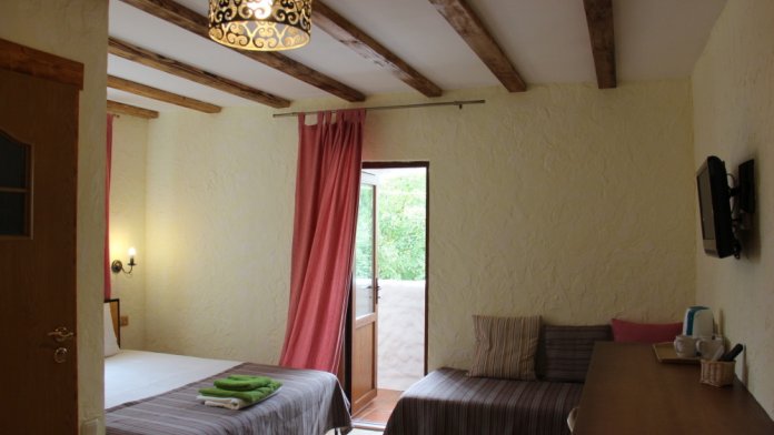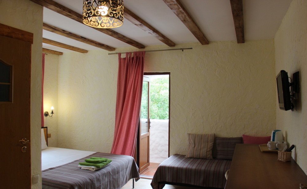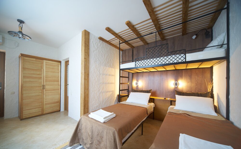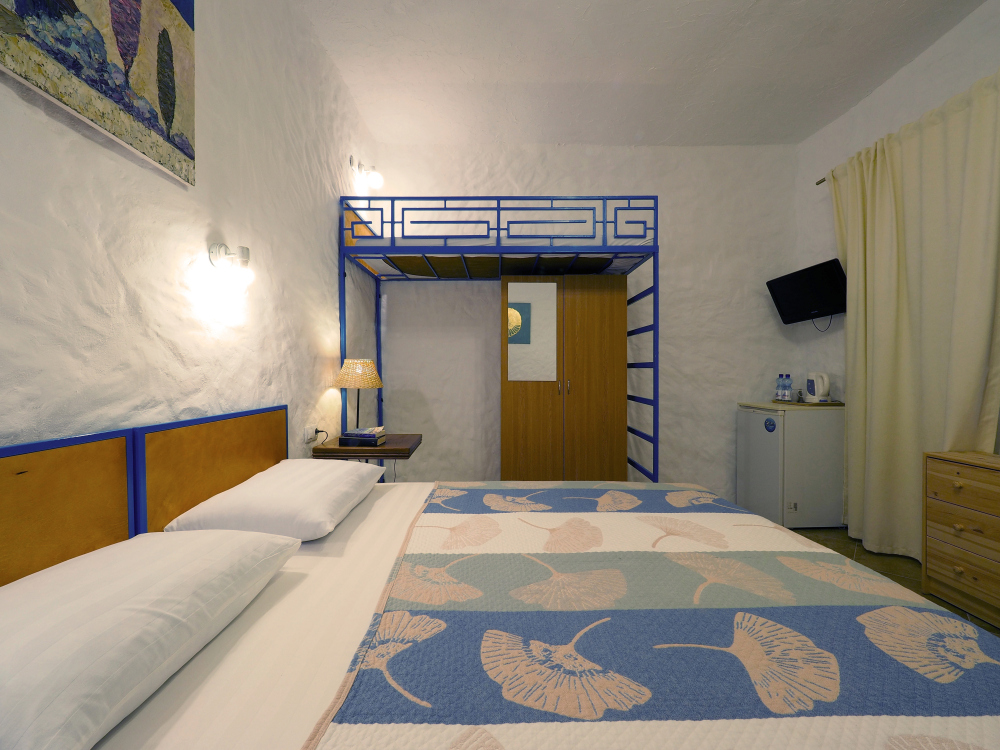 Однокомнатный трёхместный номер категории Стандарт Улучшенный № 10 (площадь 22 м², в средиземноморском стиле с собственной ванной комнатой, на первом этаже, с большой террасой, топчаном и видом на внутренний дворик, трёхместное размещение, на выбор:одна двухспальная и одна односпальная чердачная кровать или две раздельные кровати и одна односпальная чердачная кровать с ортопедическими матрасами и подушками).