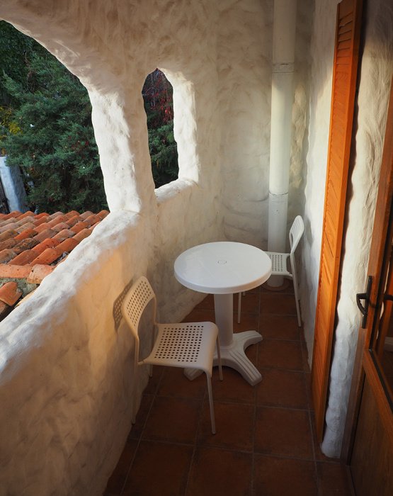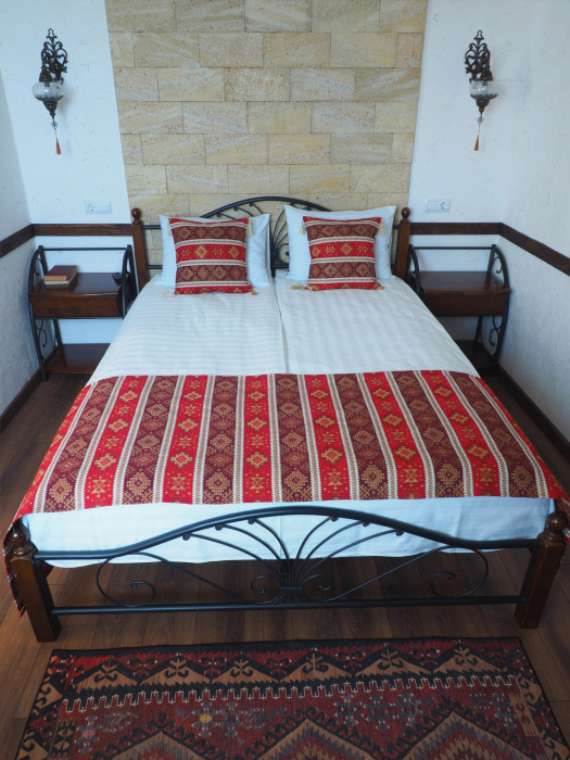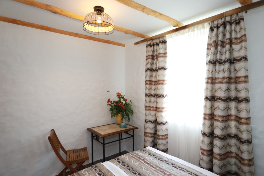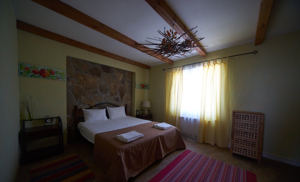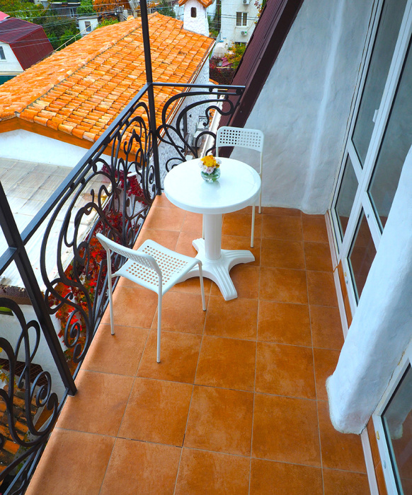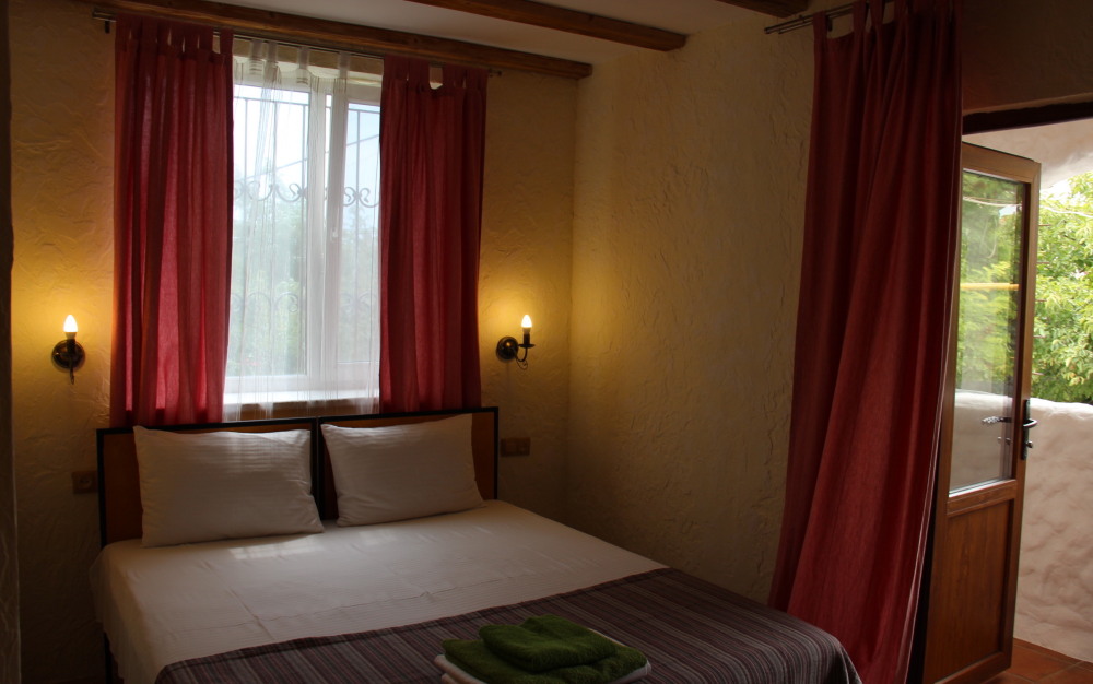 Однокомнатный двухместный номер категории Стандарт № 16 (площадь 18 м², в марокканском стиле с собственной ванной комнатой, на втором этаже, с лоджией, видом на соседский дворик, двухместное размещение, одна двухспальная кровать с ортопедическим матрасом и подушками).