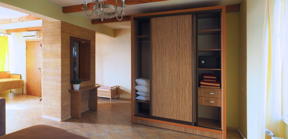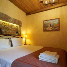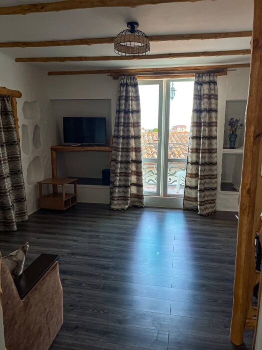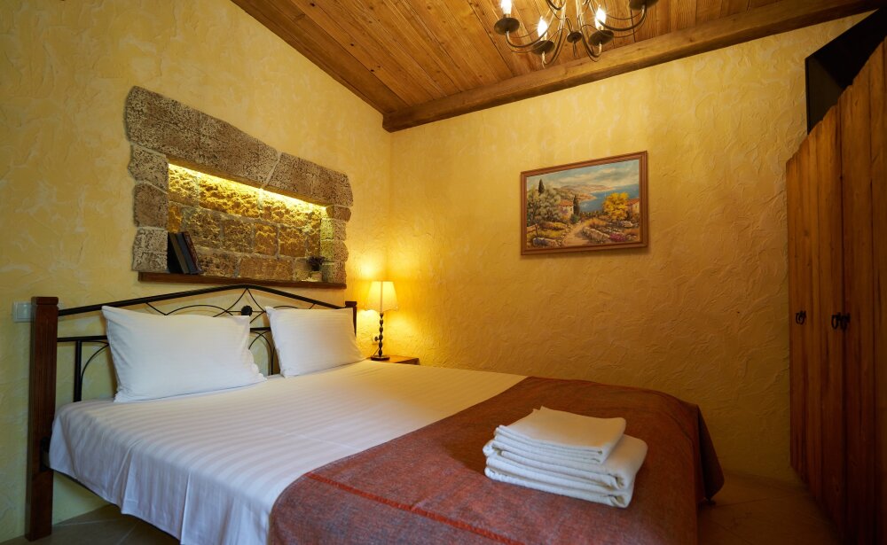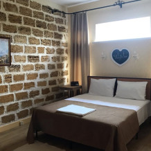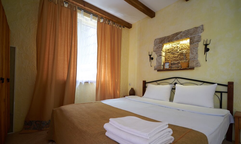 Двухкомнатный номер студия категории Делюкс № 18 (площадь 42 м², одна комната проходная, в средиземноморском стиле с собственной ванной комнатой, на третьем этаже, с обзорной террасой, видом на Генуэзскую крепость, море, горы и внутренний дворик), пятиместное размещение, одна двухспальная кровать и одна односпальная кровать с ортопедическими матрасами и подушками, один двухспальный раскладной диван.