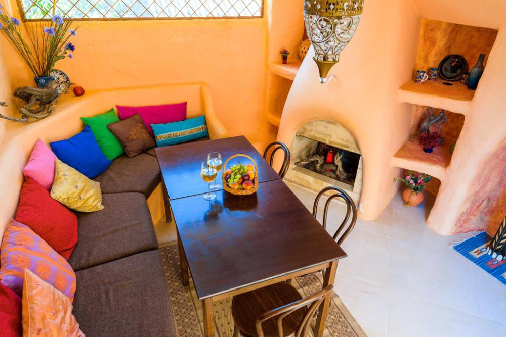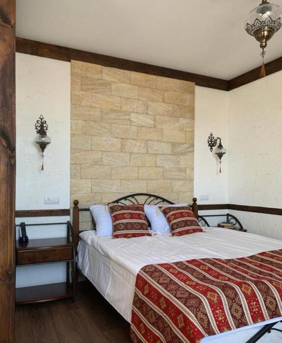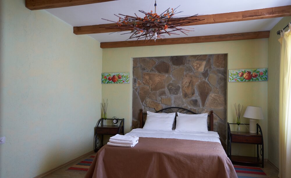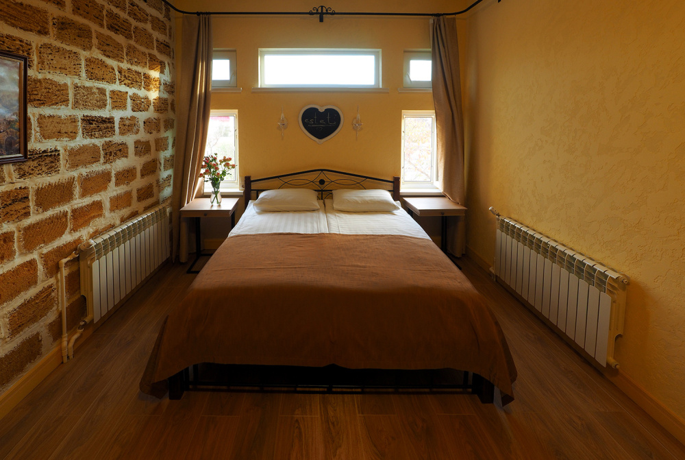 Однокомнатный двухместный номер категории Стандарт № 15 (площадь 18 м², в марокканском стиле с собственной ванной комнатой, на втором этаже, с лоджией, видом на соседский дворик, двухместное размещение, одна двухспальная кровать с ортопедическим матрасом и подушками).