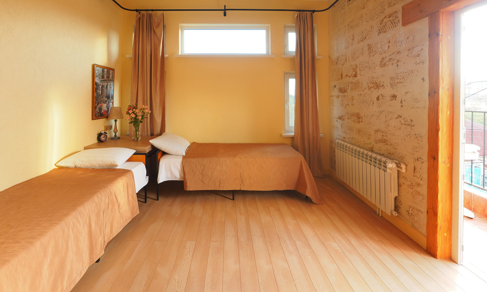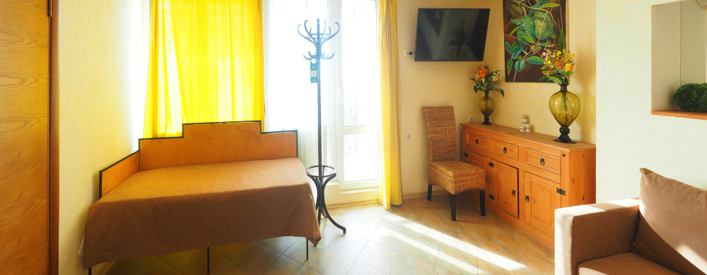 Однокомнатный трёхместный номер категории Стандарт Улучшенный № 5 (площадь 22 м², в средиземноморском стиле с собственной ванной комнатой, на третьем этаже, с балкончиком, видом на улицу и внутренний дворик, трёхместное размещение, на выбор:одна двухспальная кровать и одна односпальная кровать или три раздельные кровати с ортопедическими матрасами и подушками).