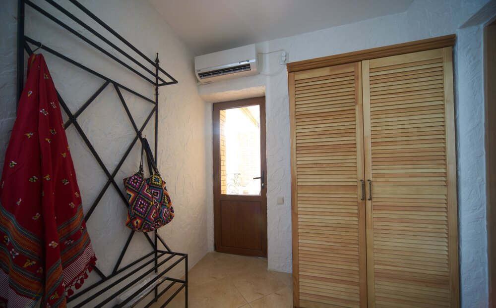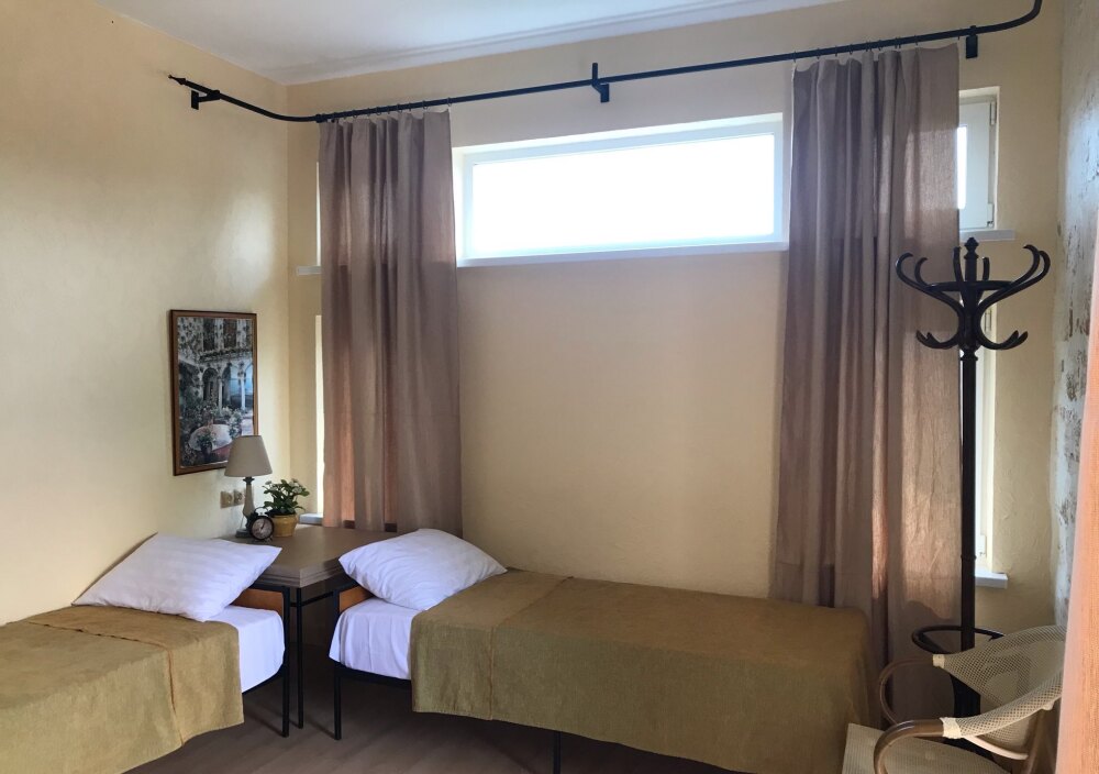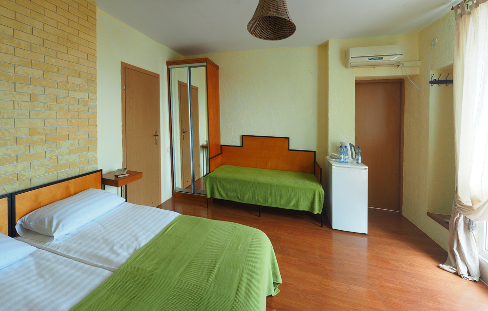 Однокомнатный трёхместный номер категории Эконом № 7 (площадь 17 м², в средиземноморском стиле с собственной ванной комнатой, на первом этаже, без балкона и видом на соседский дворик, трёхместное размещение, на выбор:одна двухспальная кровать и одна раздельная кровать или три раздельные кровати с ортопедическими матрасами и подушками).