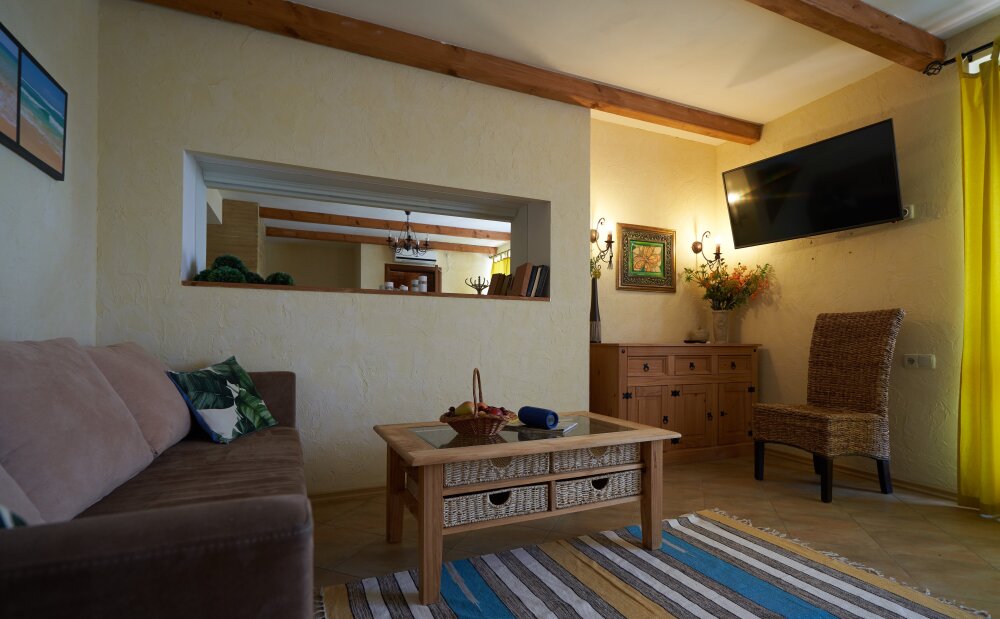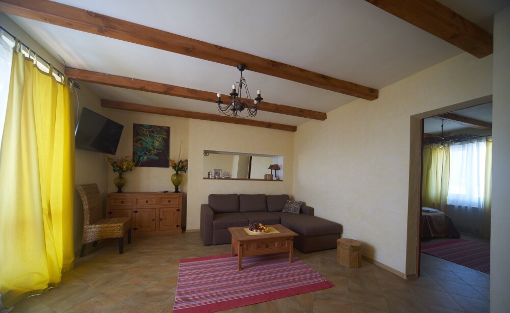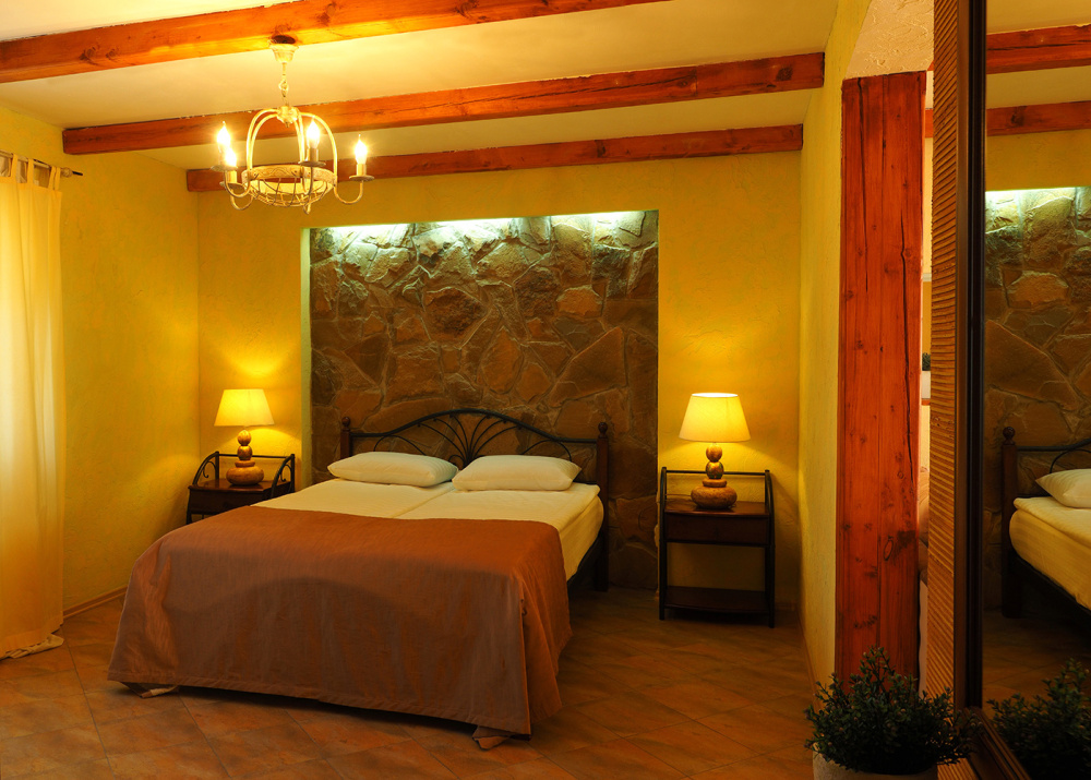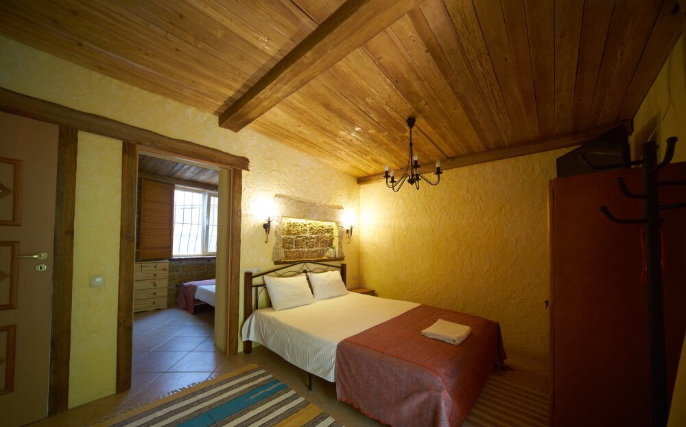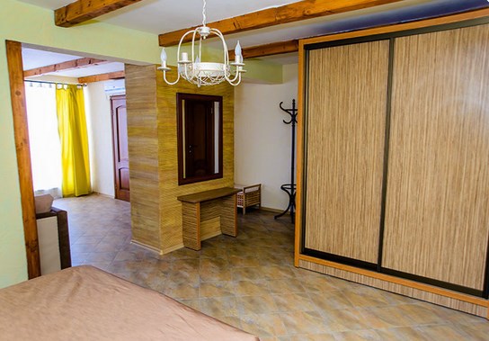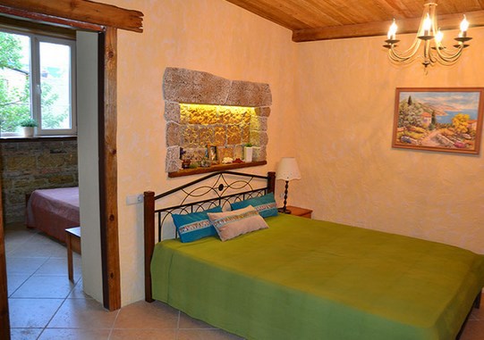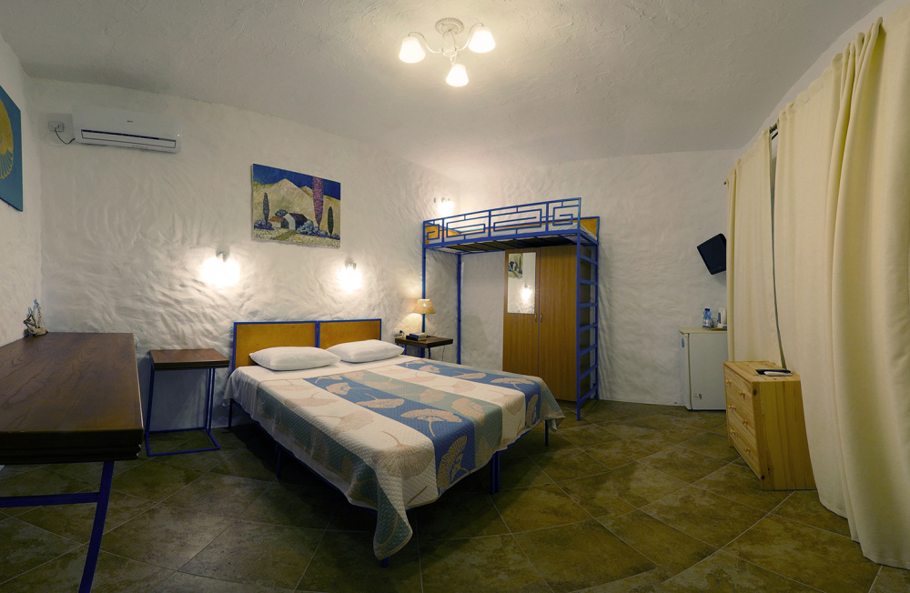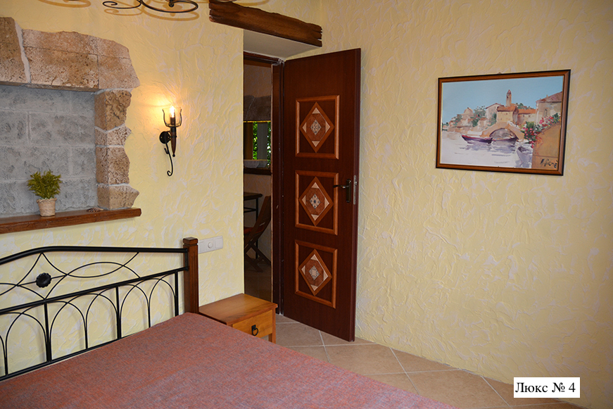 Двухкомнатный номер категории Люкс № 4 (площадь 26 м², одна комната проходная, в средиземноморском стиле с собственной ванной комнатой, на втором этаже, с лоджией, видом на внутренний дворик, четырёхместное размещение, на выбор две двухспальных кровати или одна двухспальная кровать и две раздельные кровати с ортопедическими матрасами и подушками).
