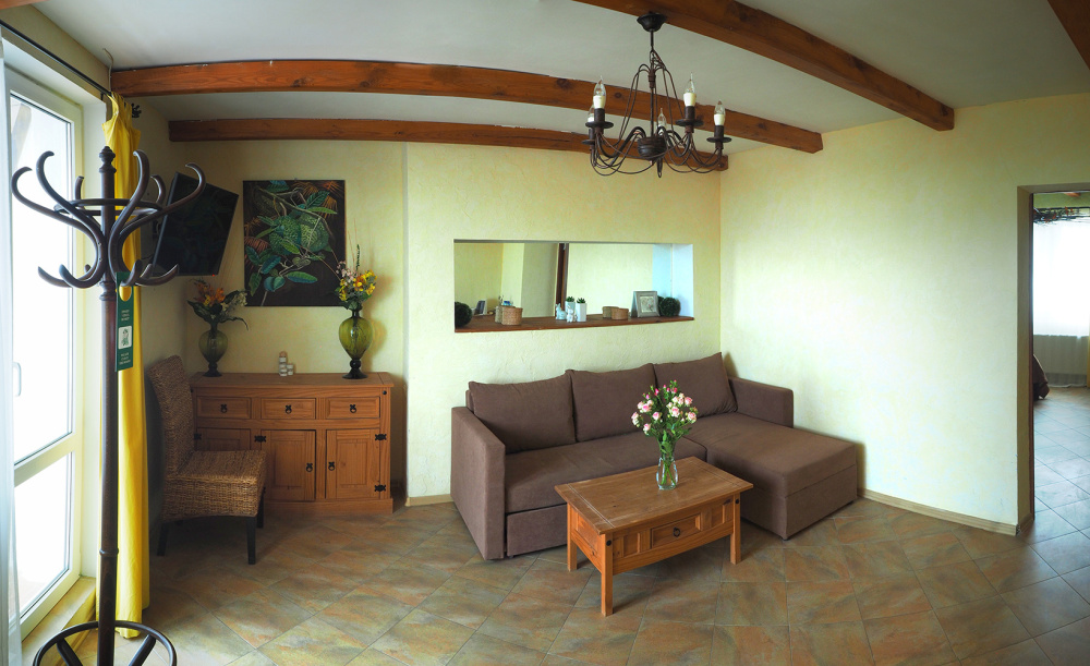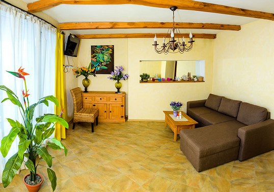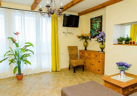 Двухкомнатный номер категории Люкс № 2 (площадь 26 м², одна комната проходная, в средиземноморском стиле с собственной ванной комнатой, на первом этаже, с лоджией, видом на внутренний дворик, четырёхместное размещение, на выбор две двухспальных кровати или одна двухспальная кровать и две раздельные кровати с ортопедическими матрасами и подушками).