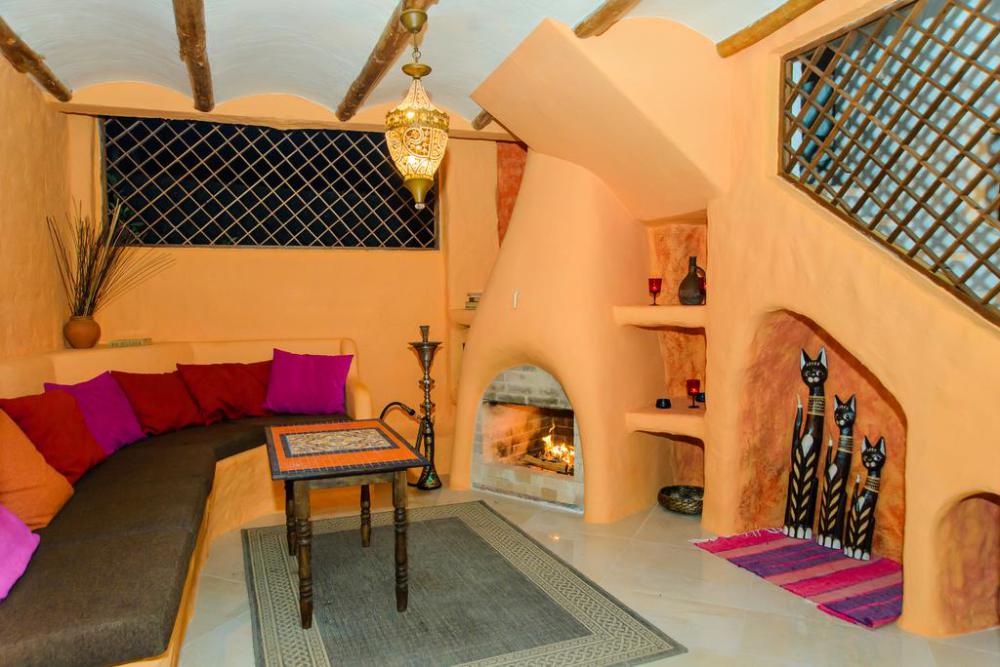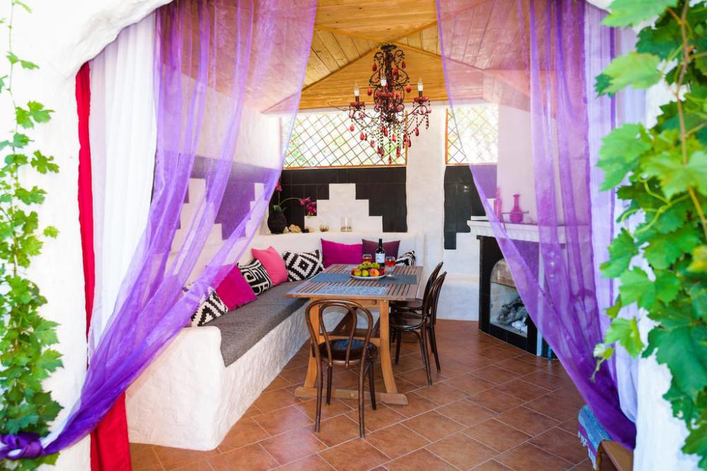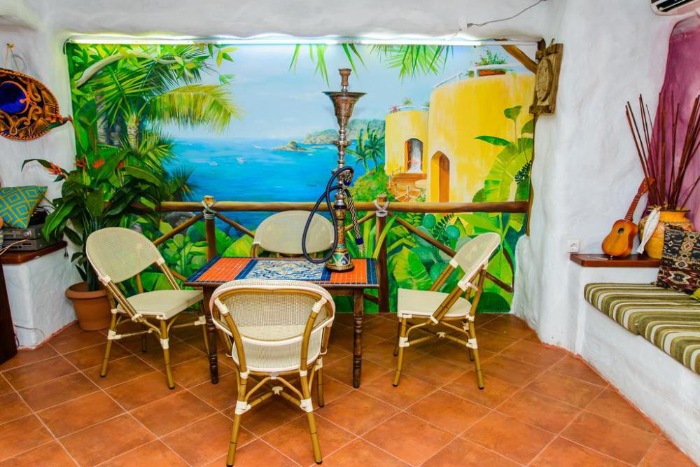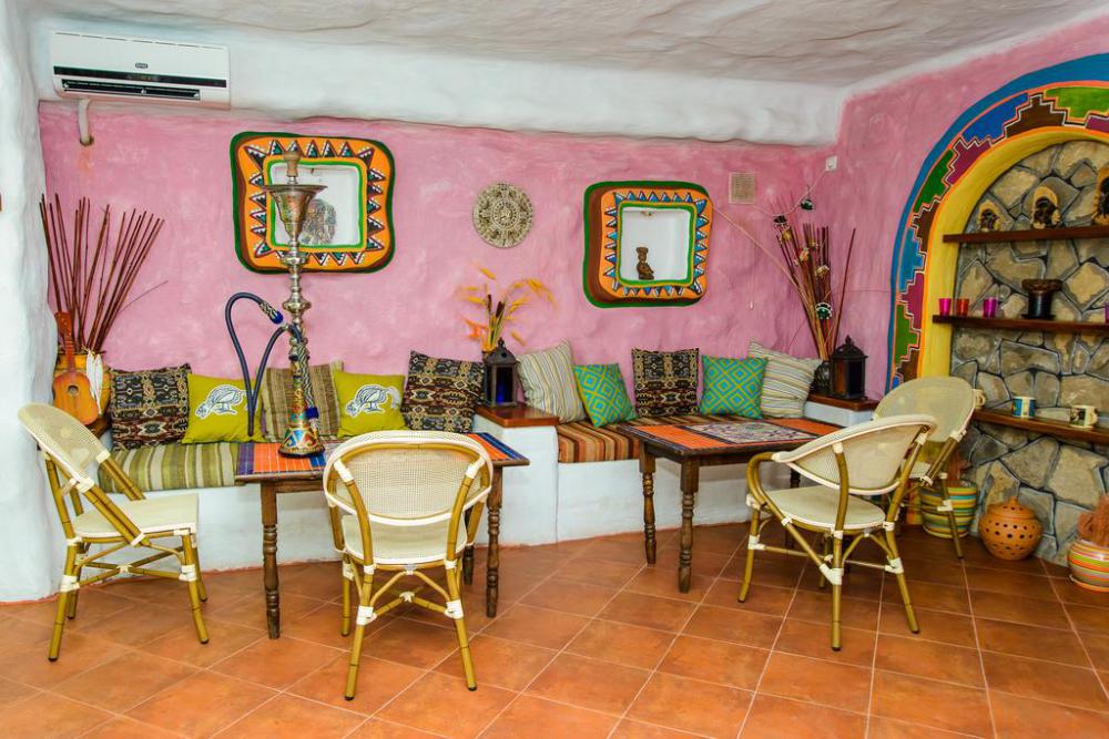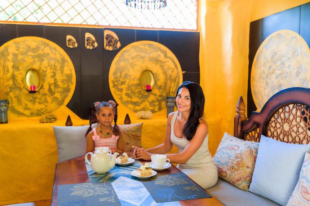 Зоны отдыха разделены небольшими лесенками на уютные отдельные беседки в этно стилях Средиземноморья, Азии, Африки, Латинской Америки, Индии, Ближнего Востока,. На первом этаже беседки оборудованы каминами, мангалами, печью для казана. В каждой беседке комфортные диваны с разноцветными мягкими подушками.