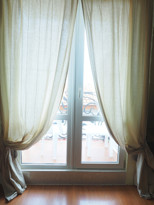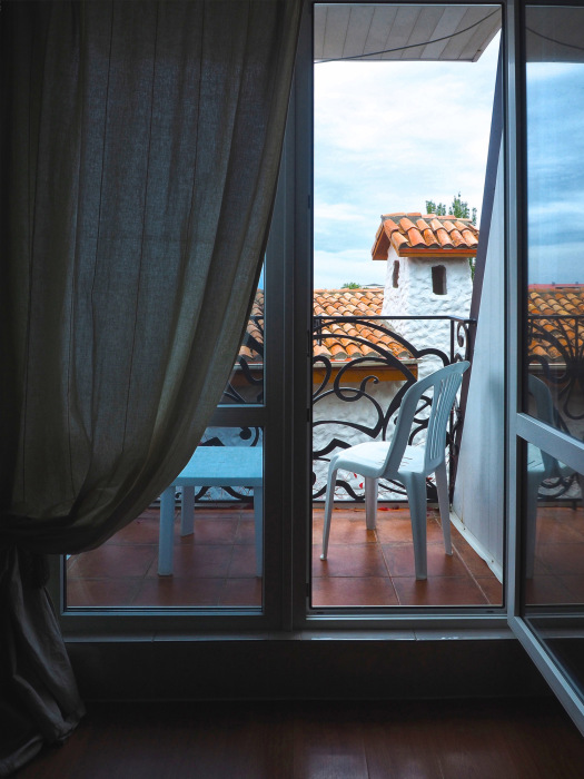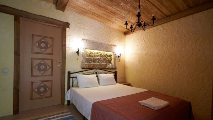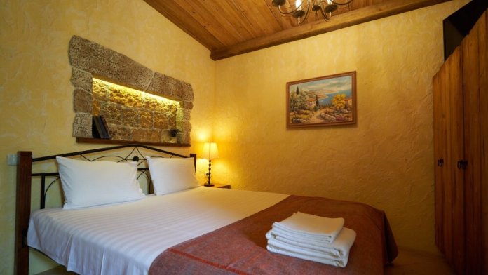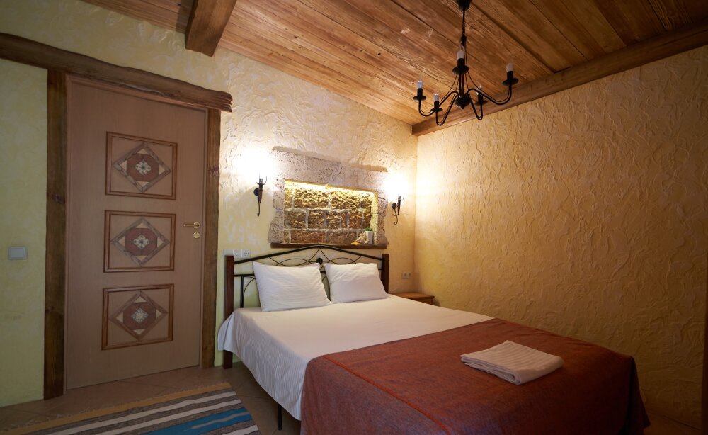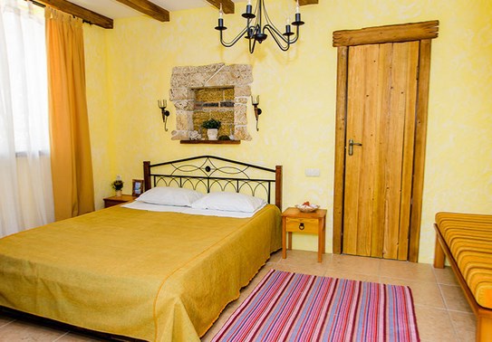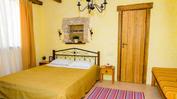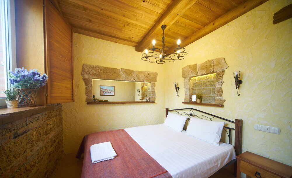 Двухкомнатный номер категории Делюкс № 9 (площадь 44 м², с раздельными комнатами, в средиземноморском стиле с собственной ванной комнатой, на втором этаже, с лоджией, видом на улицу и соседский дворик), четырёхместное размещение, на выбор две двухспальных кровати или одна двухспальная кровать и две раздельные кровати с ортопедическими матрасами и подушками.