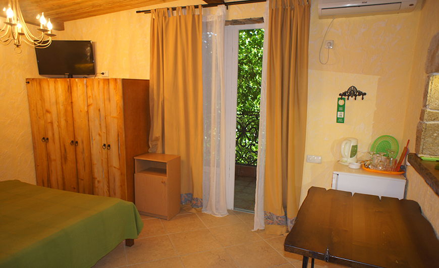 Однокомнатный двухместный номер категории Стандарт № 1 (площадь 18 м², в средиземноморском стиле с собственной ванной комнатой, на первом этаже, с лоджией, видом на внутренний дворик, двухместное размещение, одна двухспальная кровать с ортопедическим матрасом и подушками).