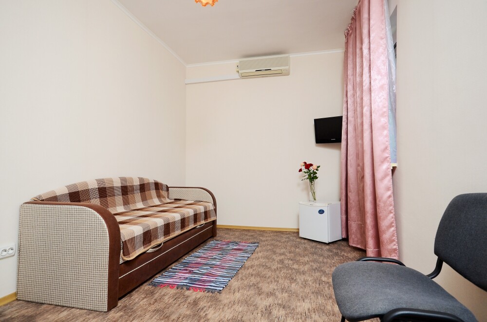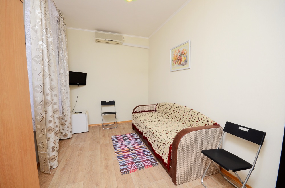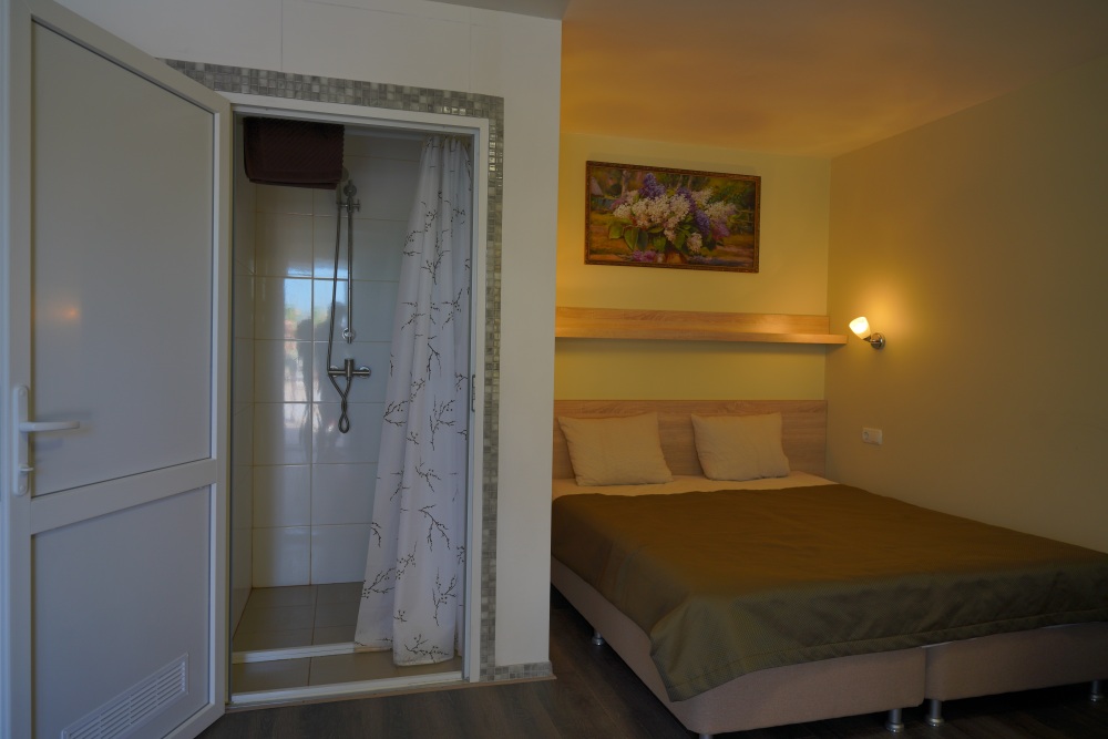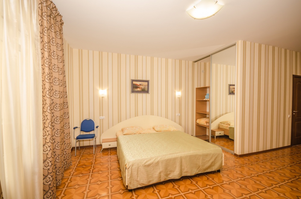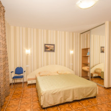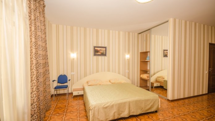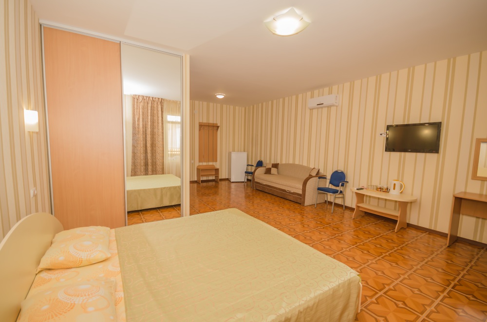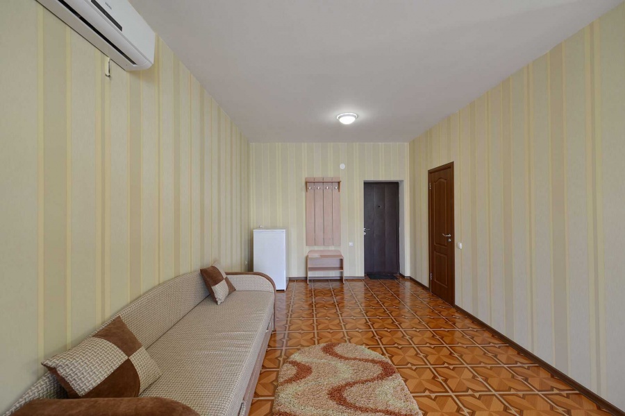 Двухкомнатный номер площадью 26 кв м , раздельными гостиной и спальней. В номере сунузел с душем. Телевизор, кондиционер, холодильник, шкаф , журнальный столик , 2х спальная кровать. В гостиной раскладной диван на 2 чел.